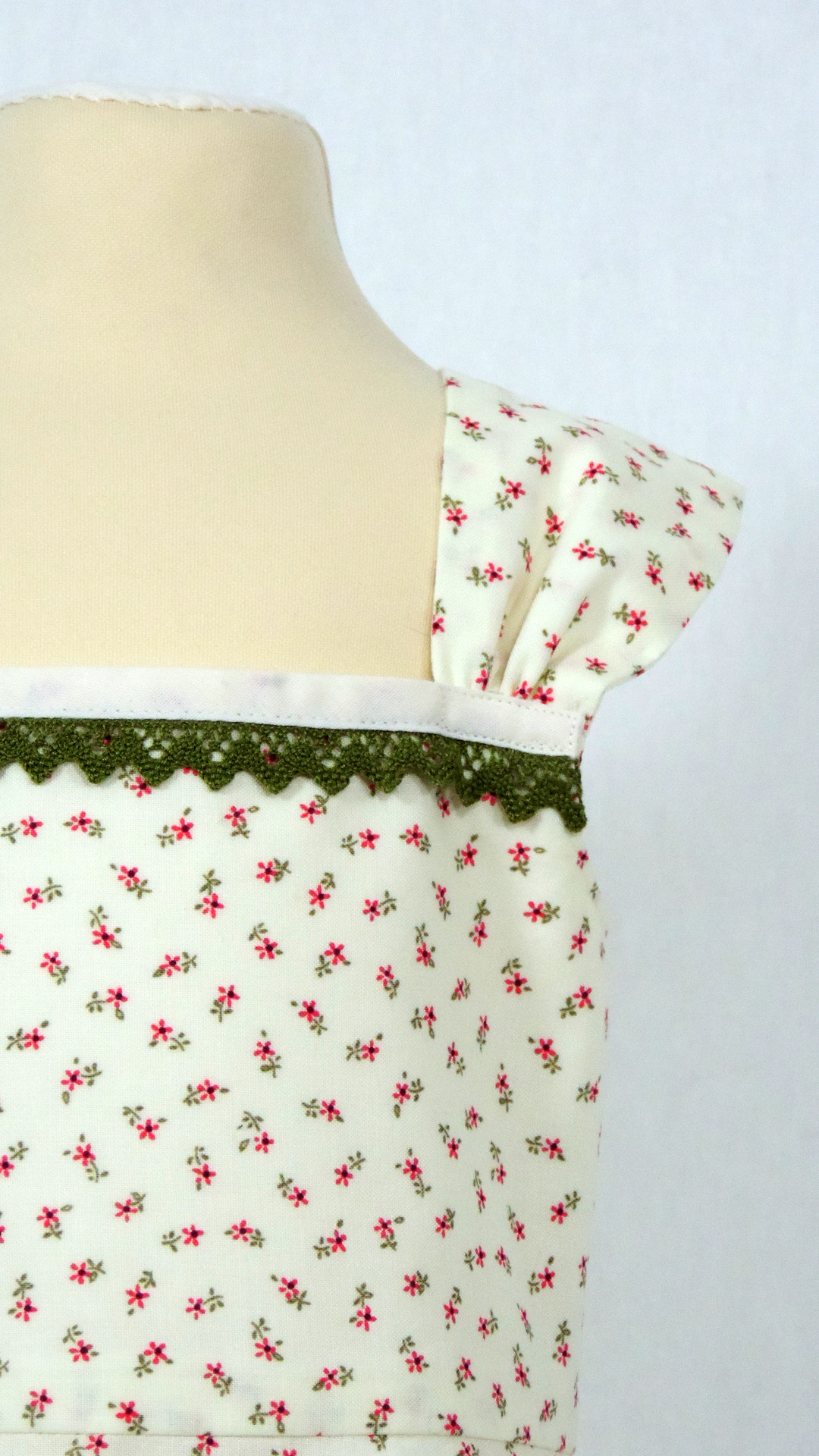 Festliches Trägerkleid. Das Kleid aus écru farbenem, mit roten und oliv farbenen Blüten bedruckten Stoff ist an Culler und Saum mit oliv farbener Spitze besetzt. Das Kleid ist aus Baumwollstoff gefertigt.