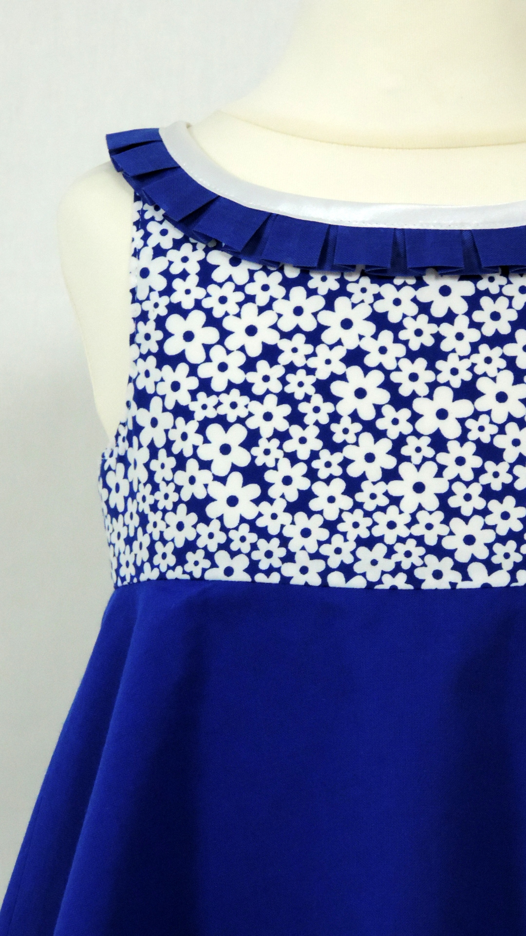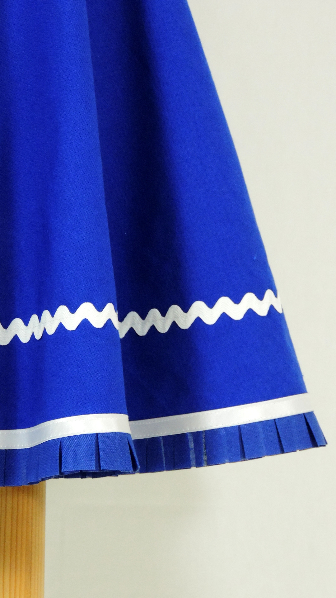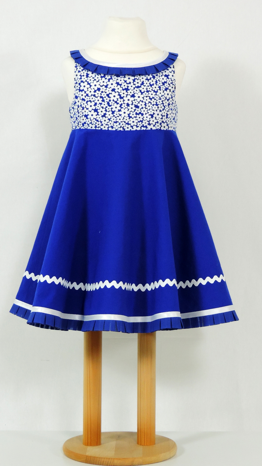 Festliches Kleid mit Faltenband und Zackenlitze. Der Rock ist aus uni blauem, das Oberteil aus blauem, mit weissen Blüten bedruckten Baumwollstoffen. Faltenband und Einfassband sind synthetisch.