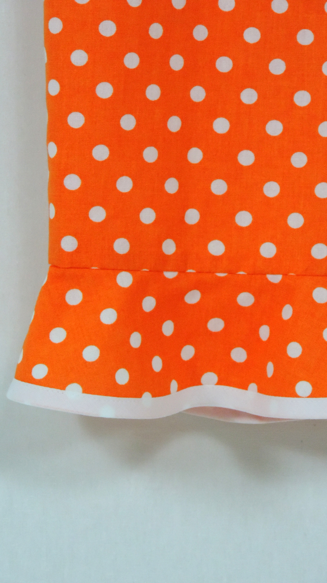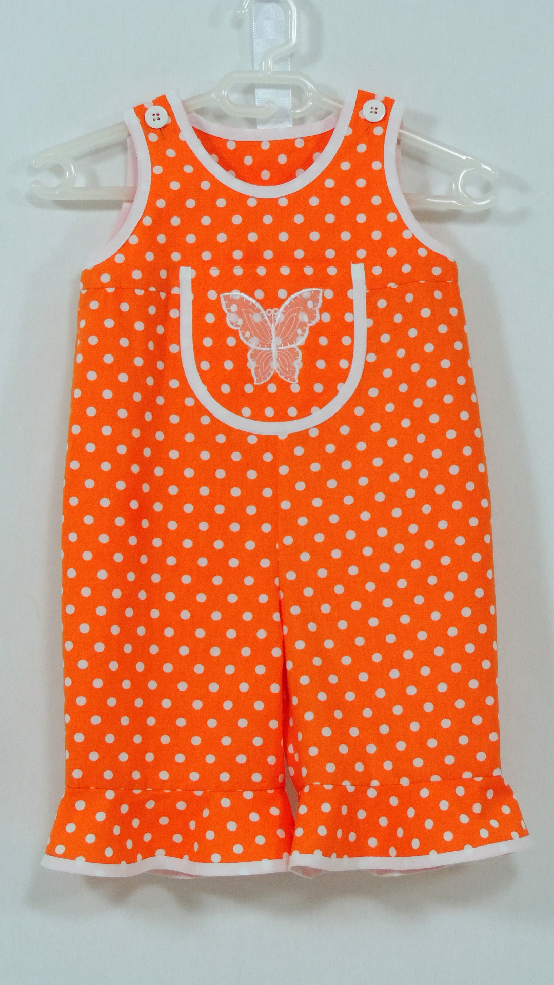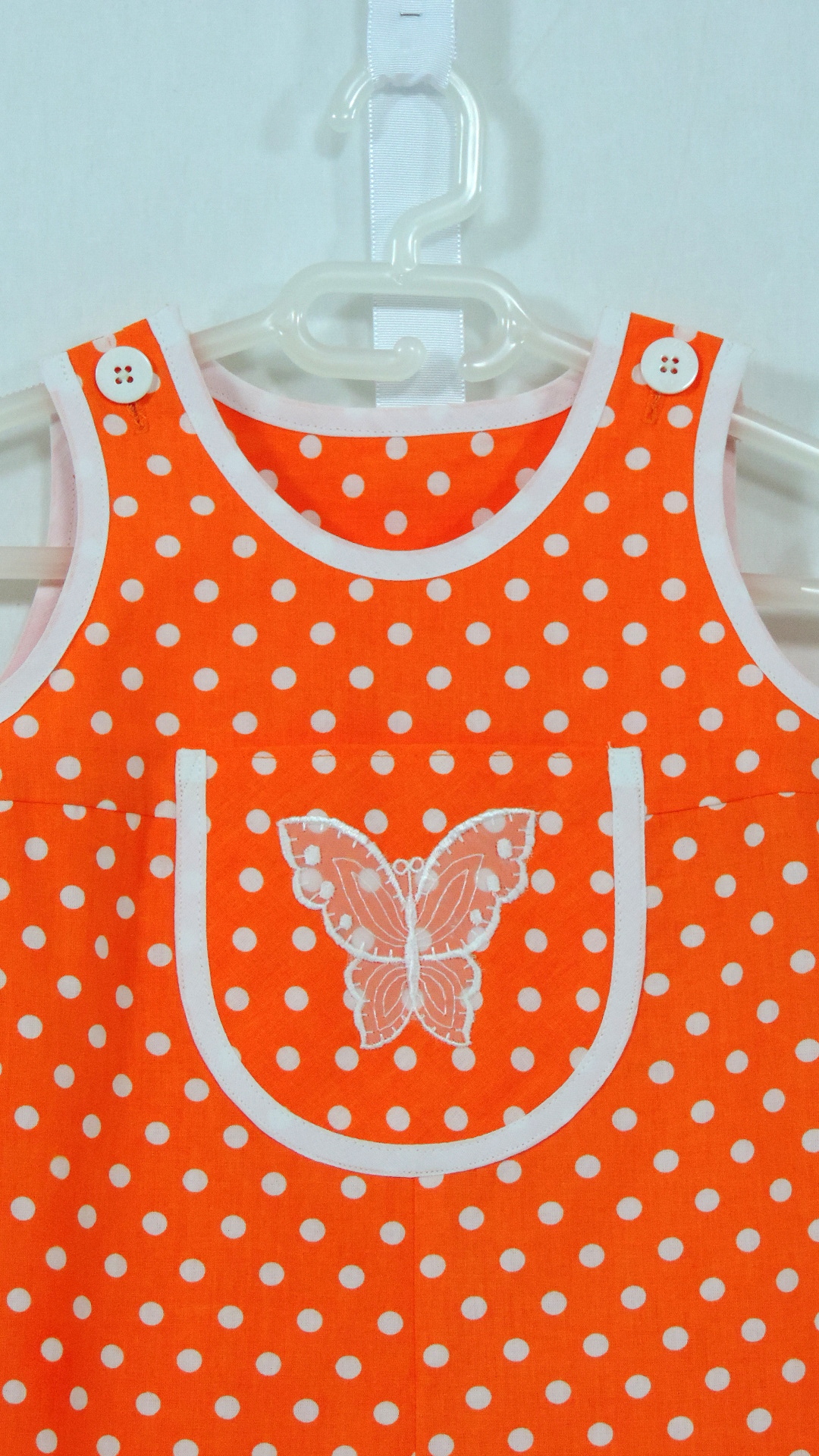 Spielhose mit Schmetterling auf der Brusttasche. Die 3/4 lange Hose endet in einem kleinen Volant. Der Stoff in orange mit weissen Punkten ist aus Baumwolle.