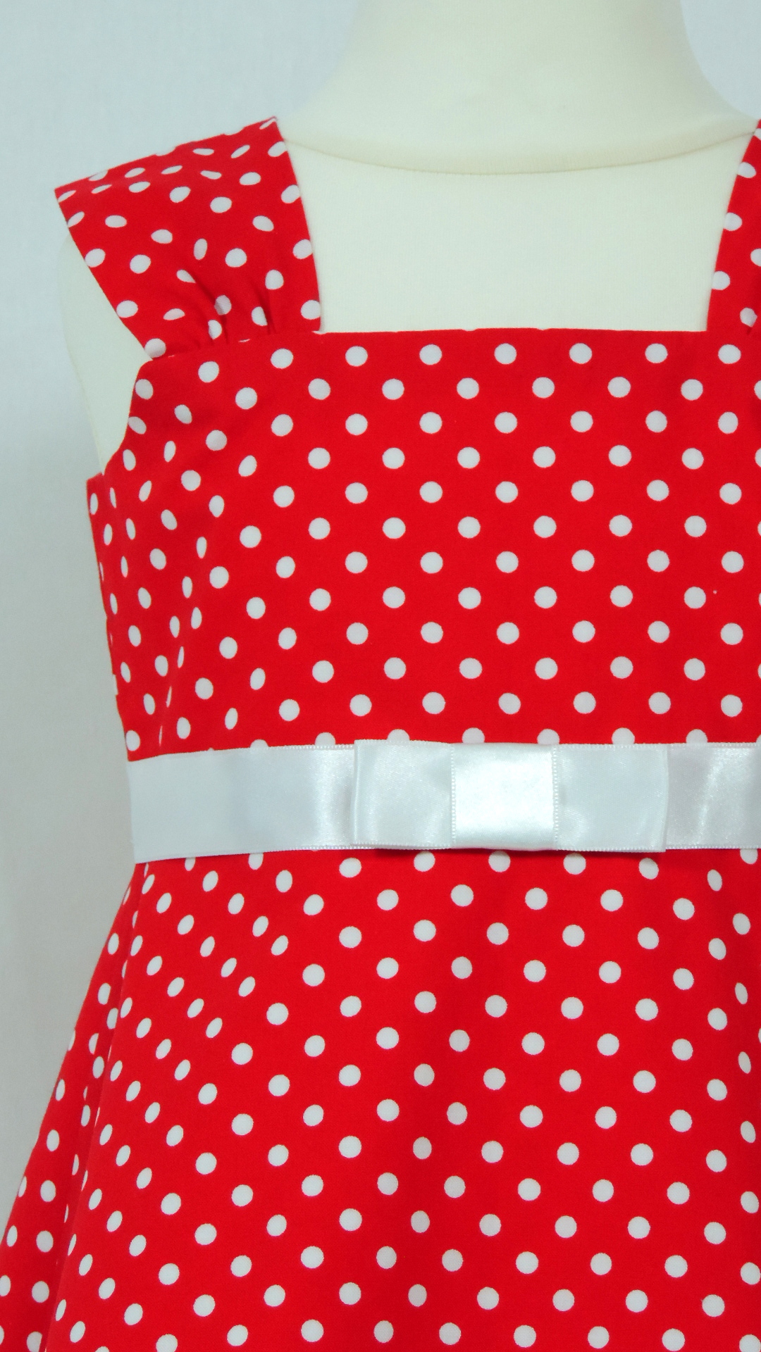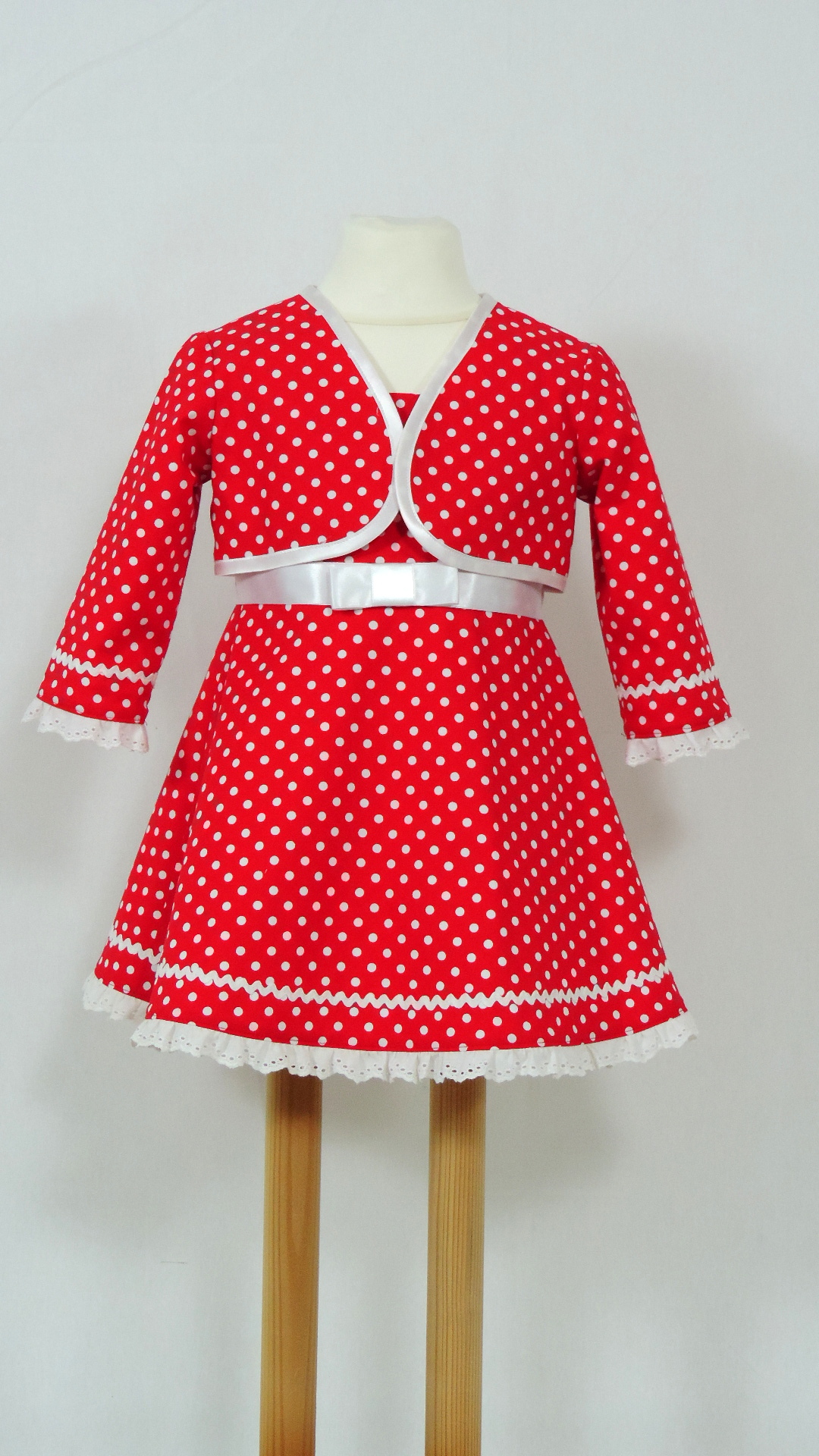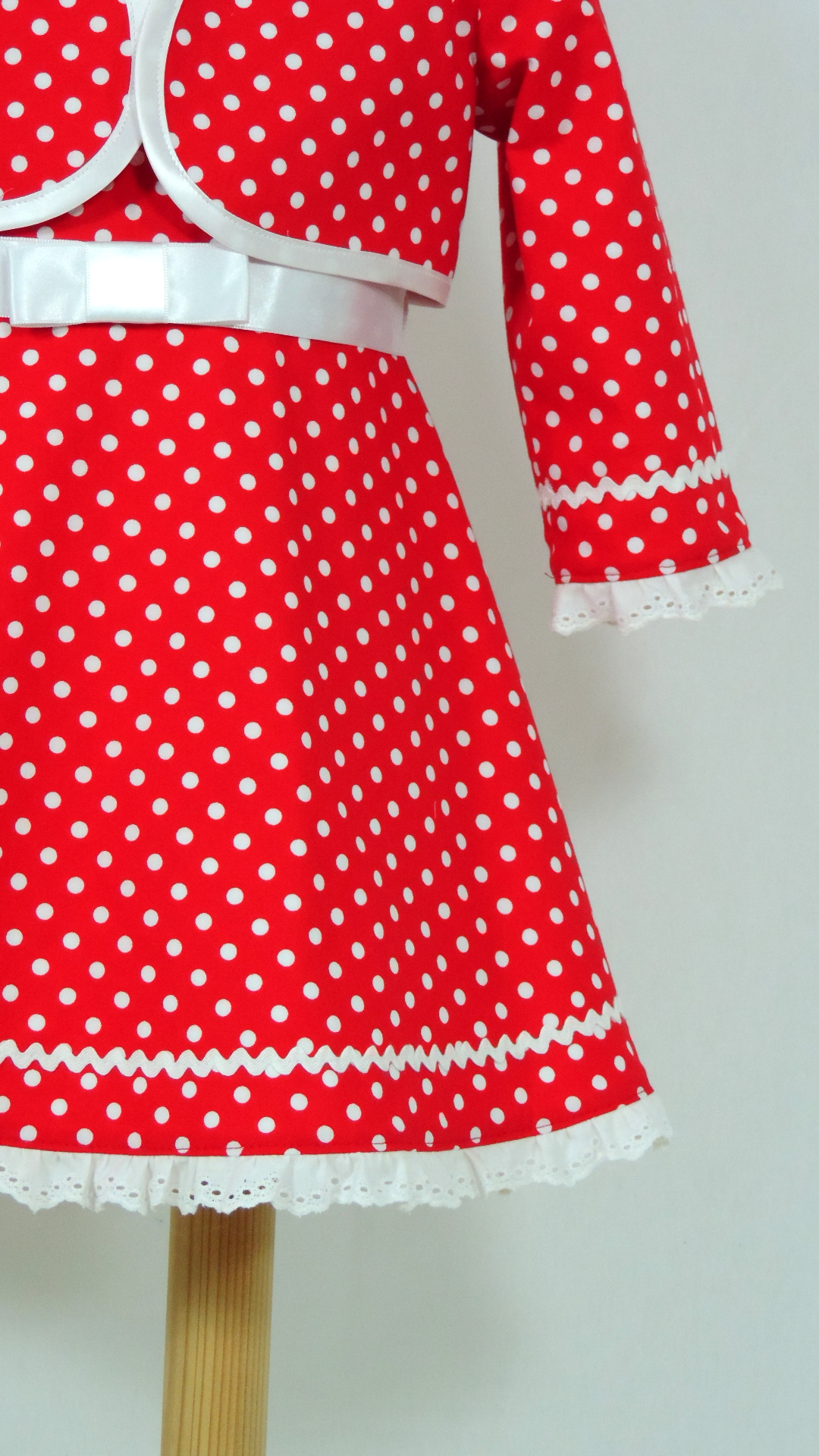 Festliches Ensemble bestehend aus Kleid und Bolero. Das rote, weiss gepunktete Ensemble schliesst an Rocksaum und Bolerärmel mit einer weissen Spitze ab. Kleid und Bolero sind voll gefüttert. Beide Stoffe, Einfassband, Zackenlitze und Spitze sind aus Baumwolle, der Satingurt aus Polyester.