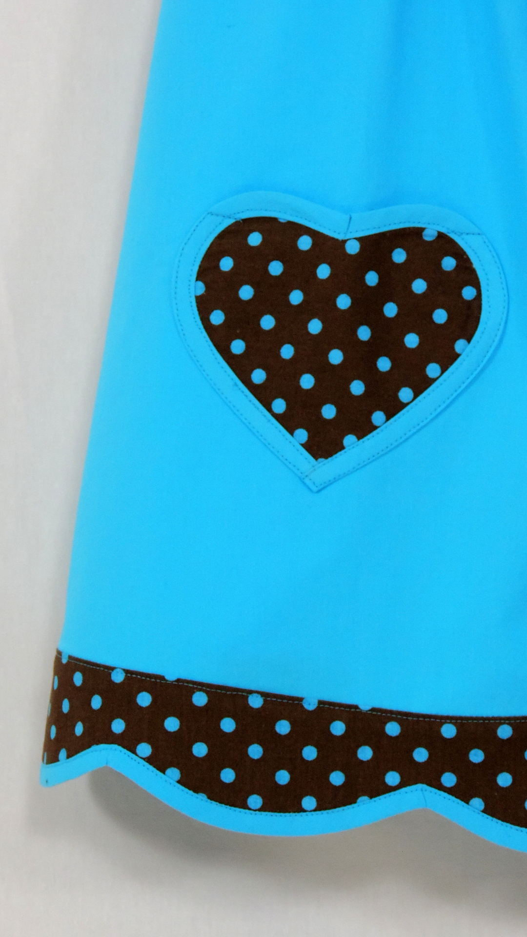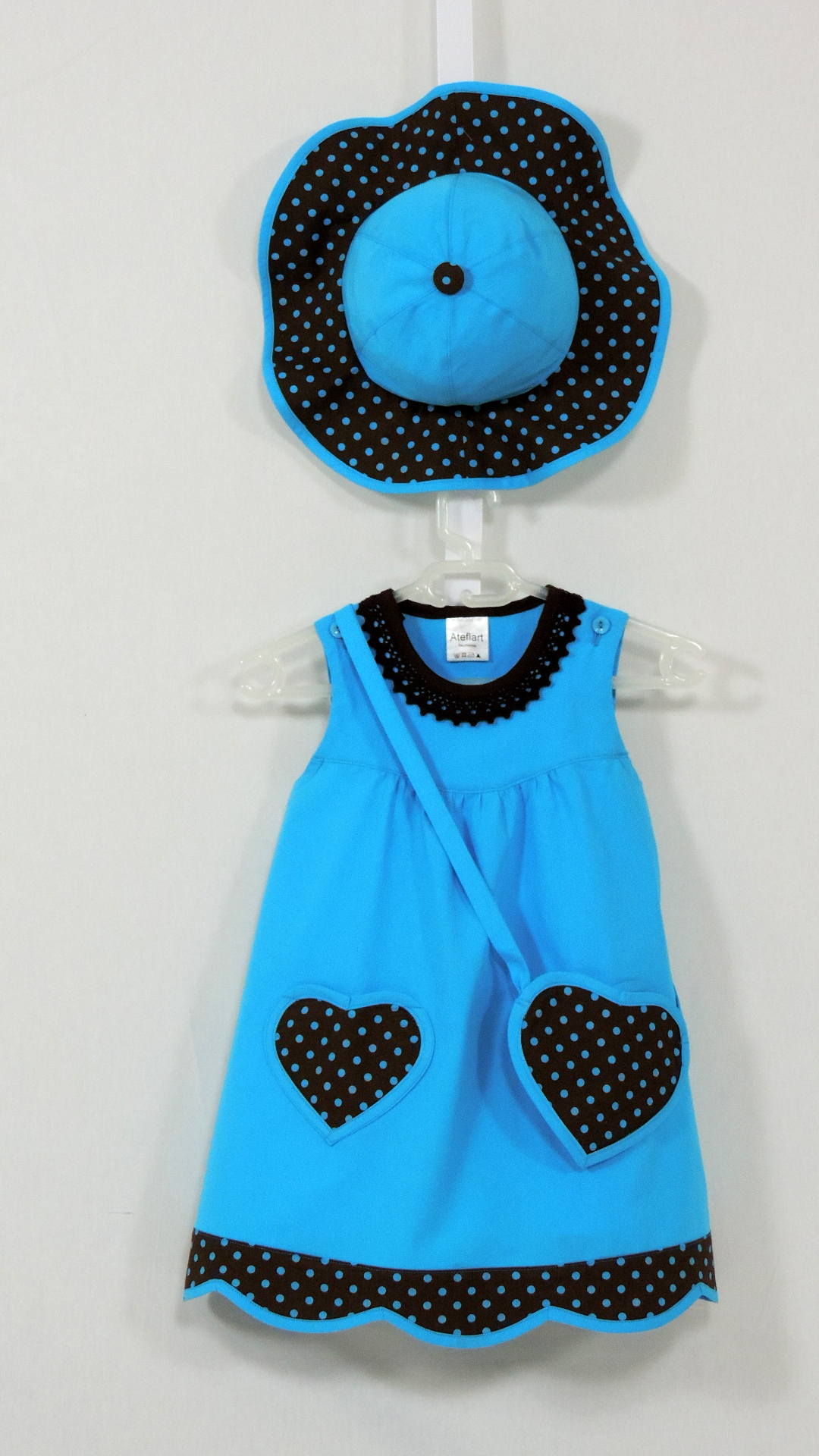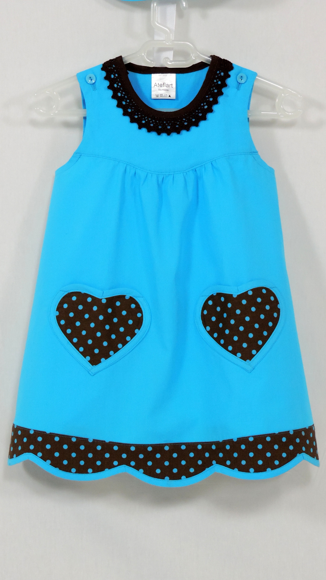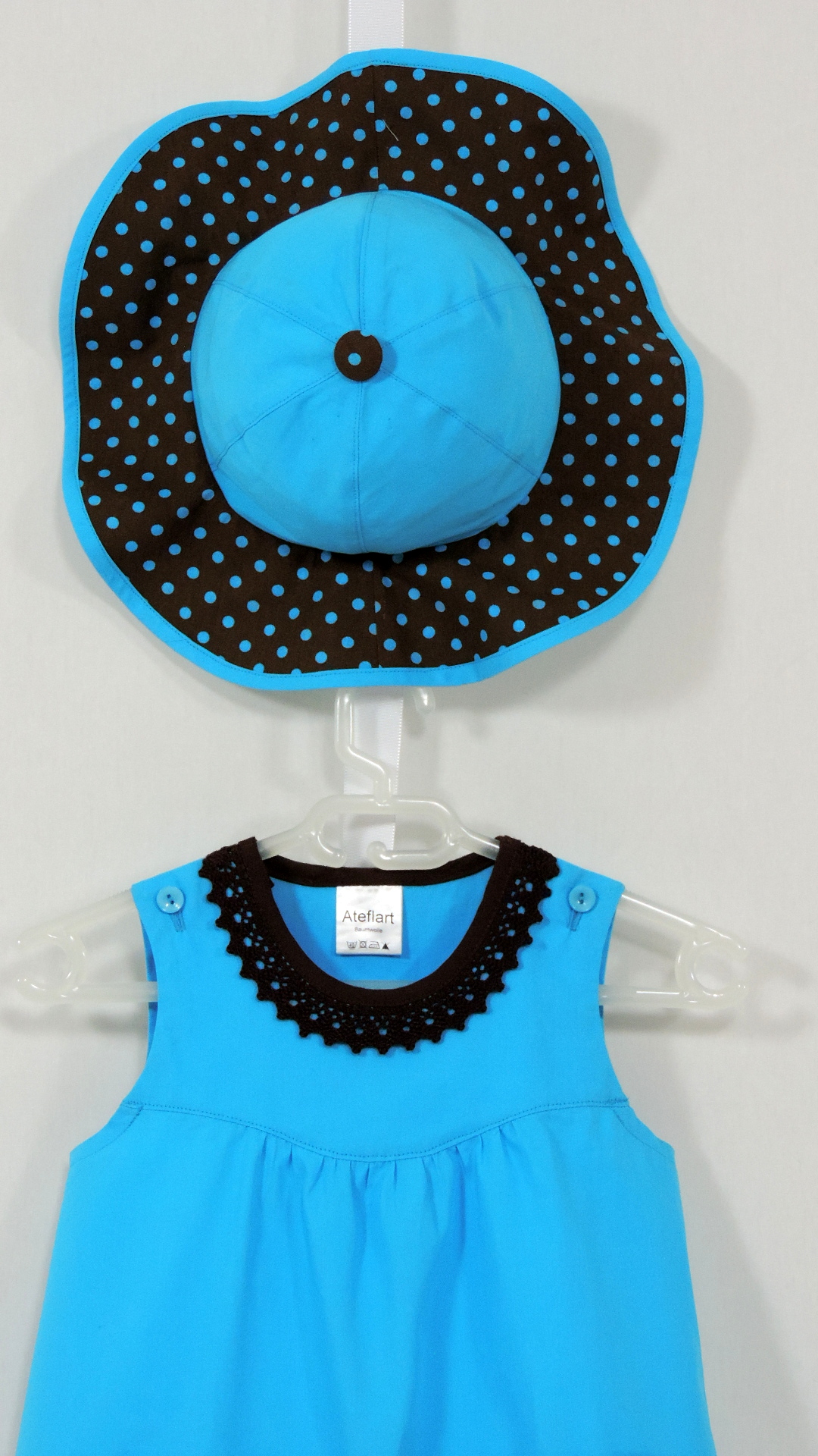 Cullerkleid mit passendem Hut und Täschchen. Die Baumwollstoffe in uni türkis und braun/türkis gepunktet sowie Einfassband und Spitze sind aus Baumwolle.