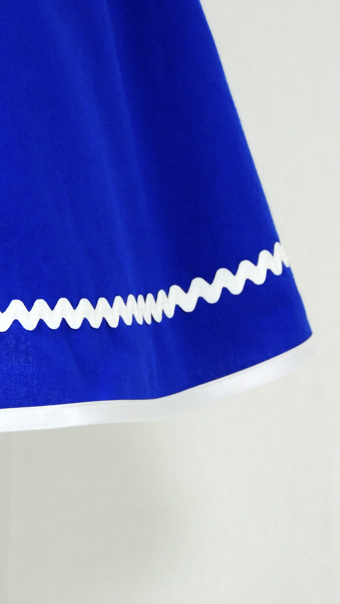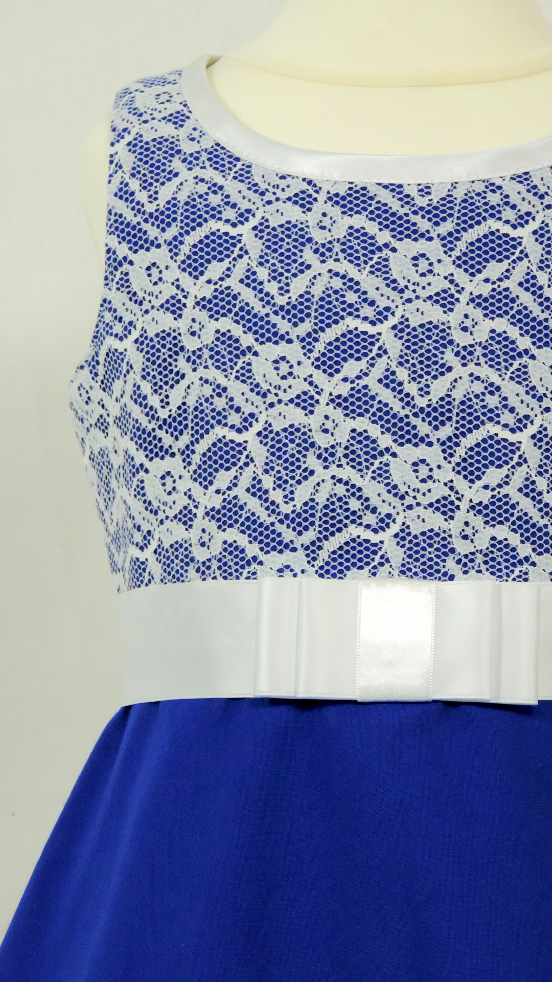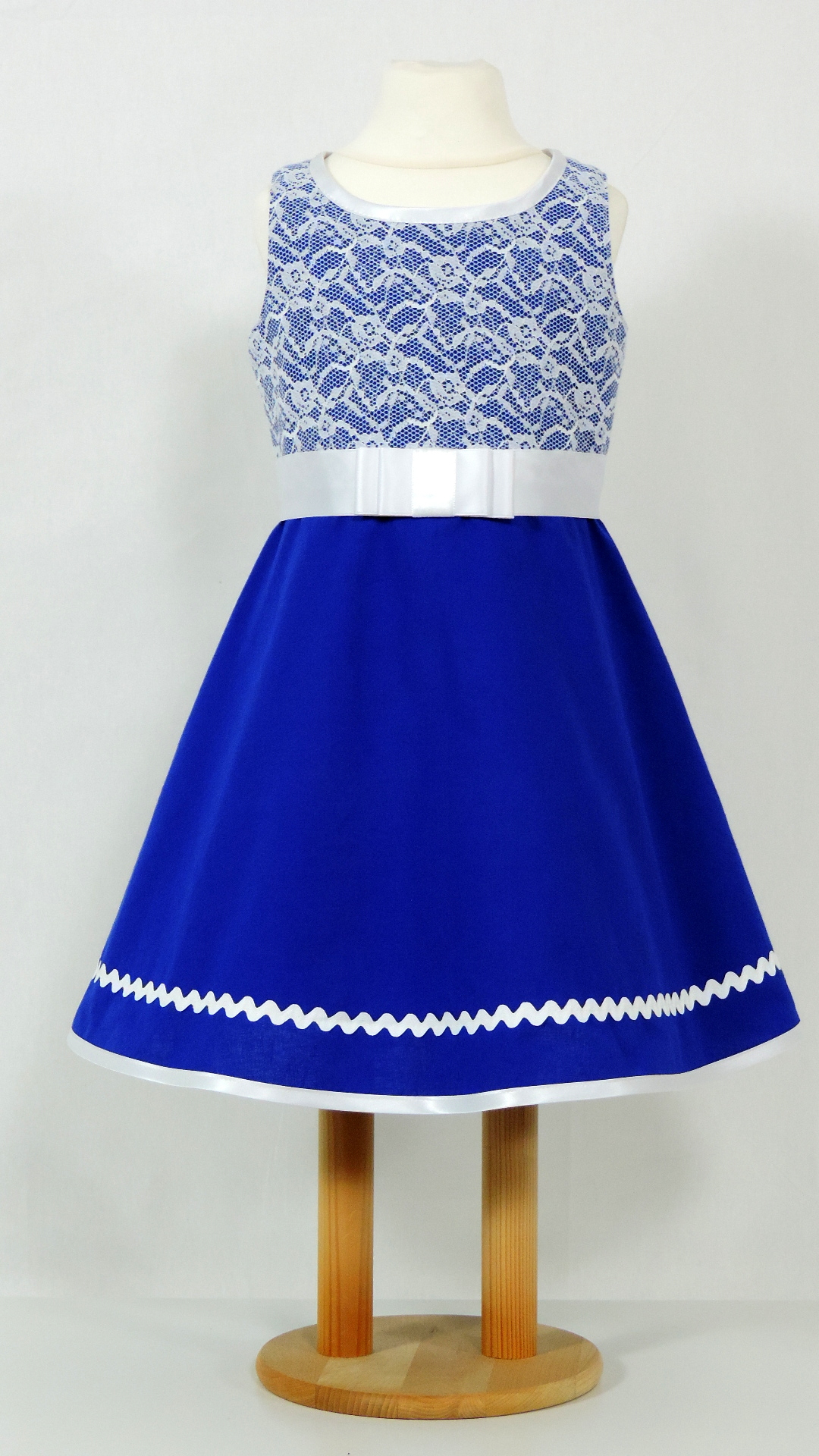 Festliches Kleid mit Spitzen besetztem Oberteil. Der königsblaue Grundstoff ist aus Baumwolle, Spitze, Einfassband und Satingurt sind synthetisch.