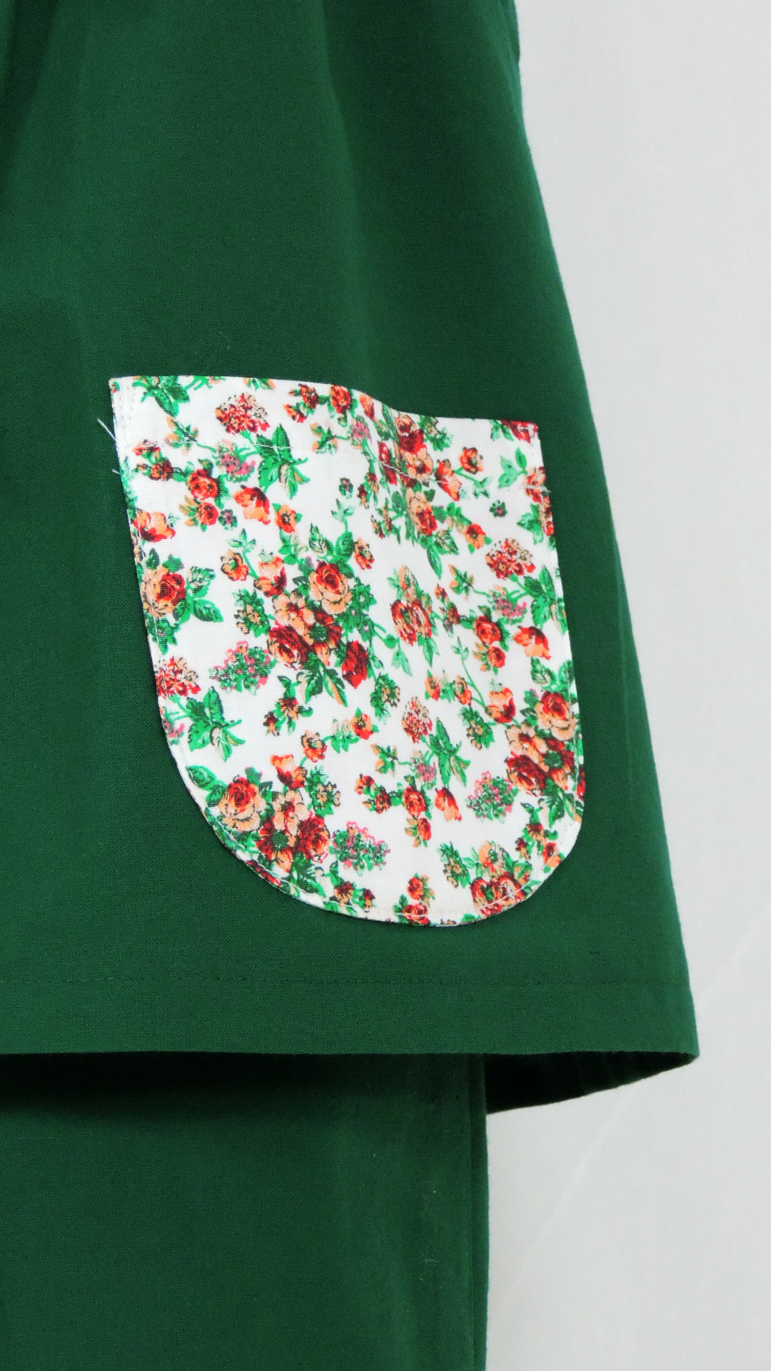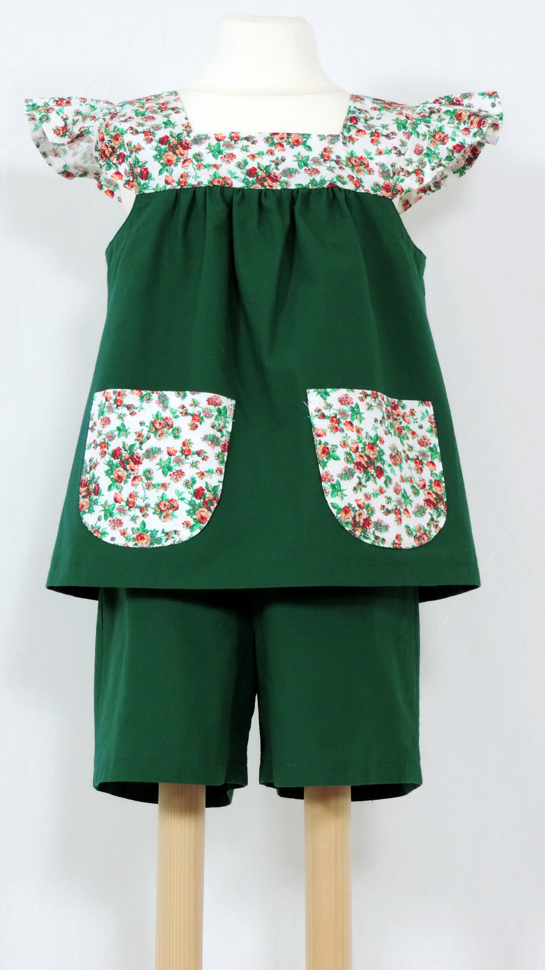 Ensemble bestehend aus kurzer Hose und Bluse. Die Hose ist aus uni grünem, die Bluse aus weissgrundigem, geblumten Baumwollstoff gefertigt.