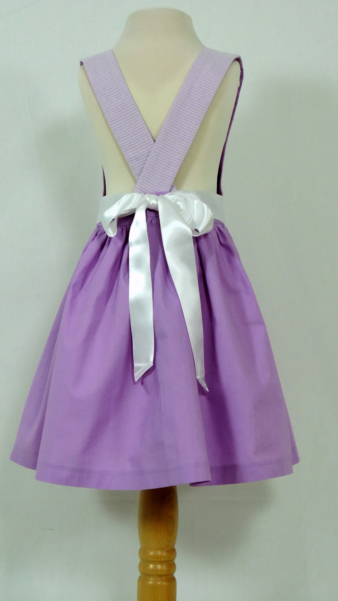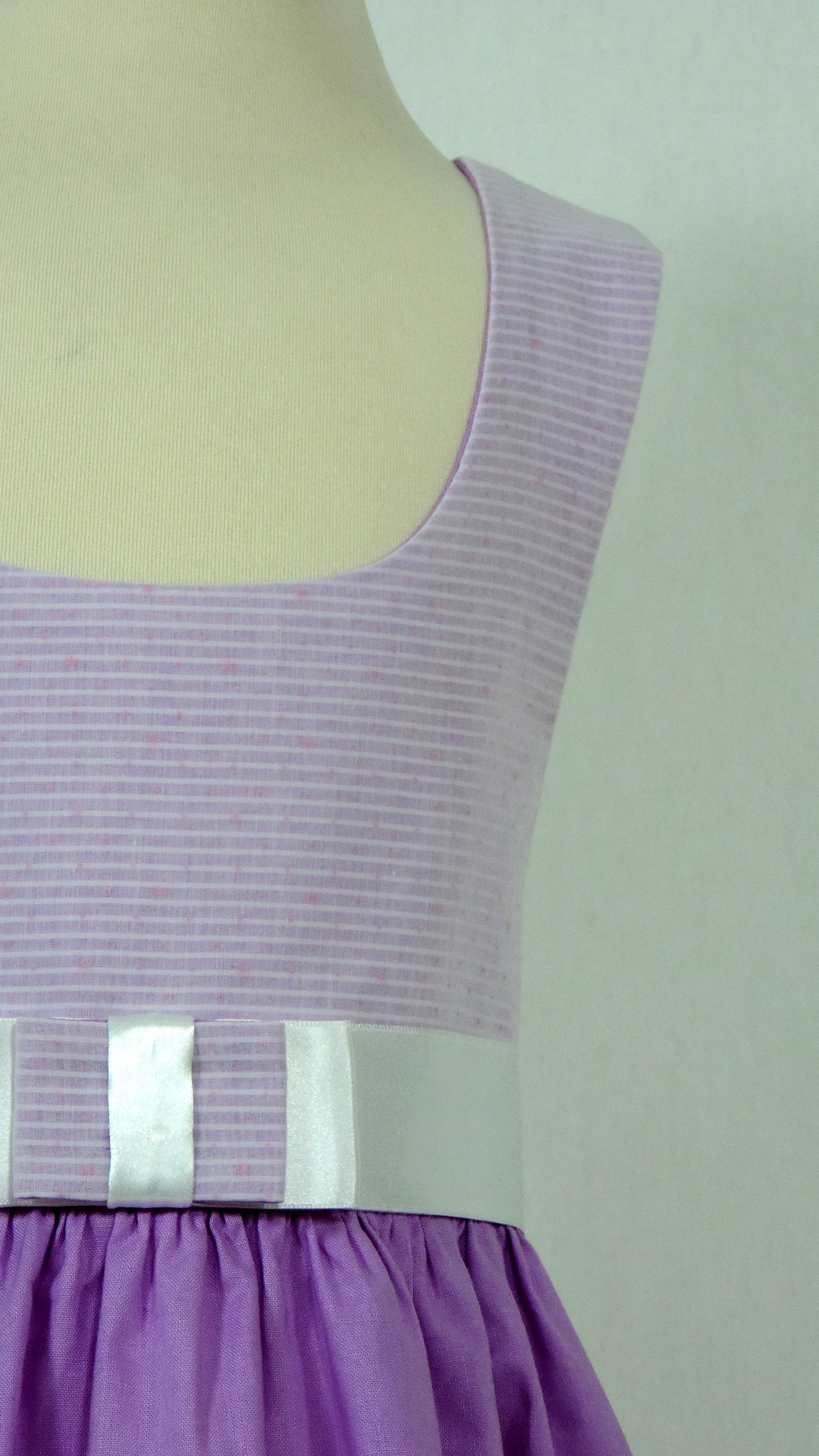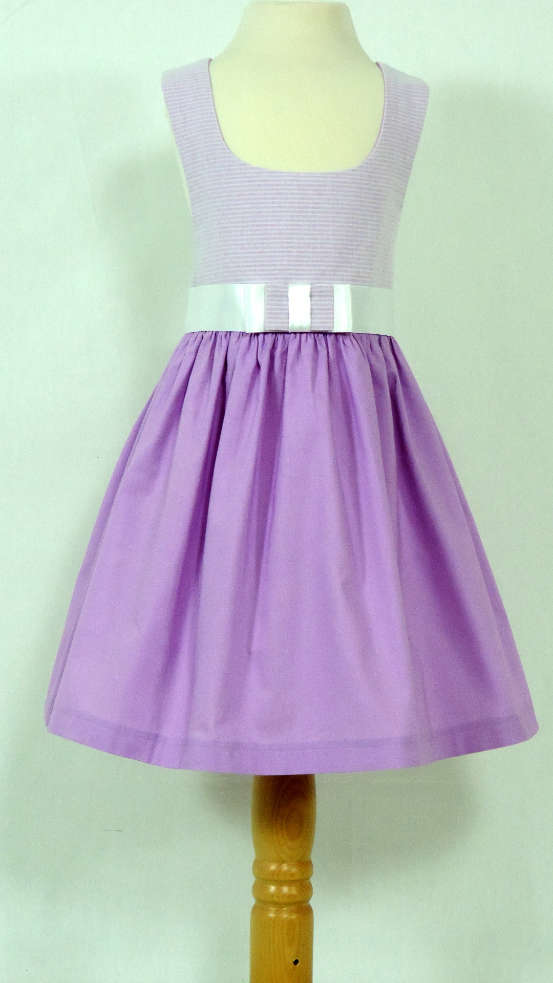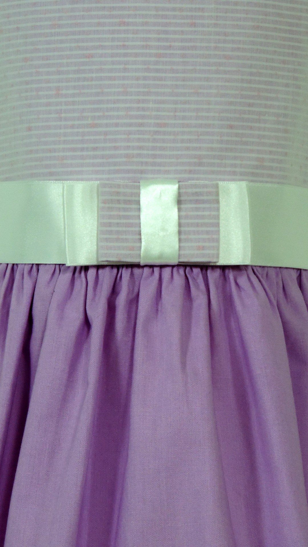 Latzrock mit Satingurt. Der lila farbene Grundstoff ist am Oberteil mit einem weiss gestreiften, durchsichtigen Stoff belegt. Beide Stoffe sind aus Baumwolle, der Satingurt ist synthetisch.