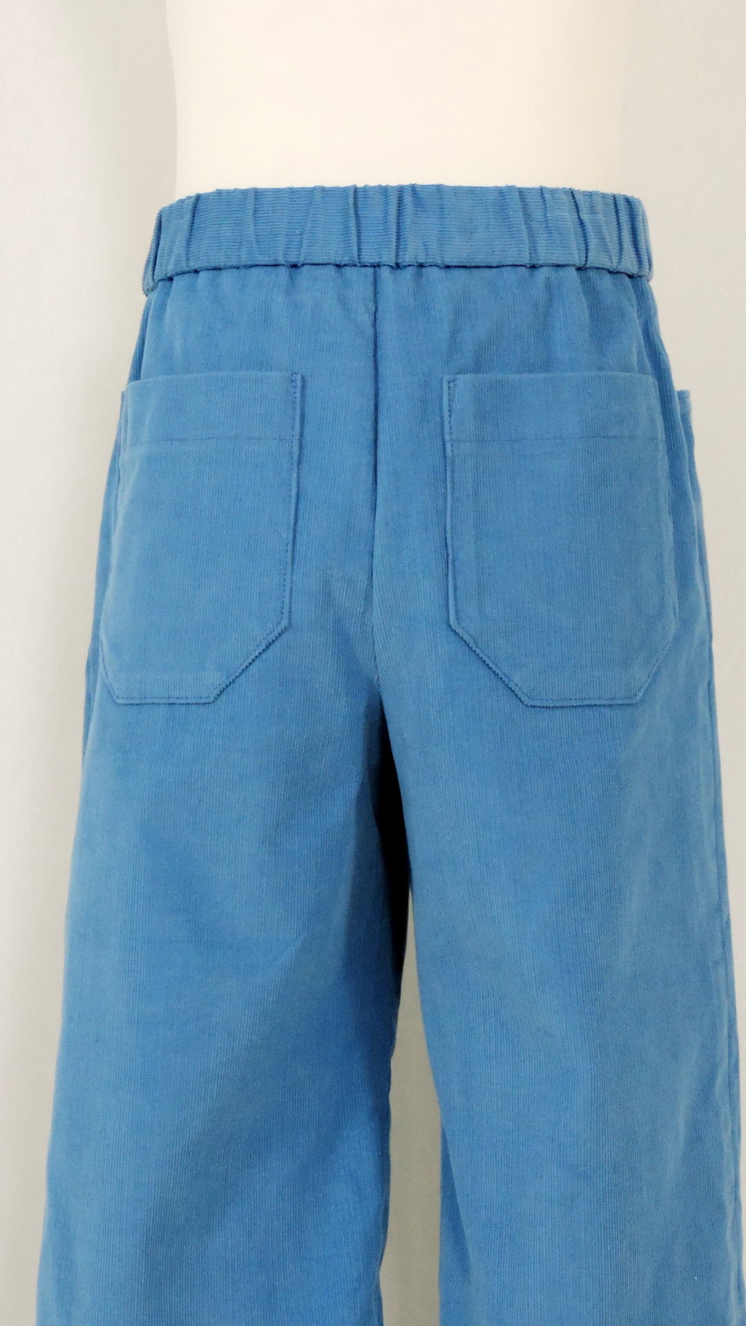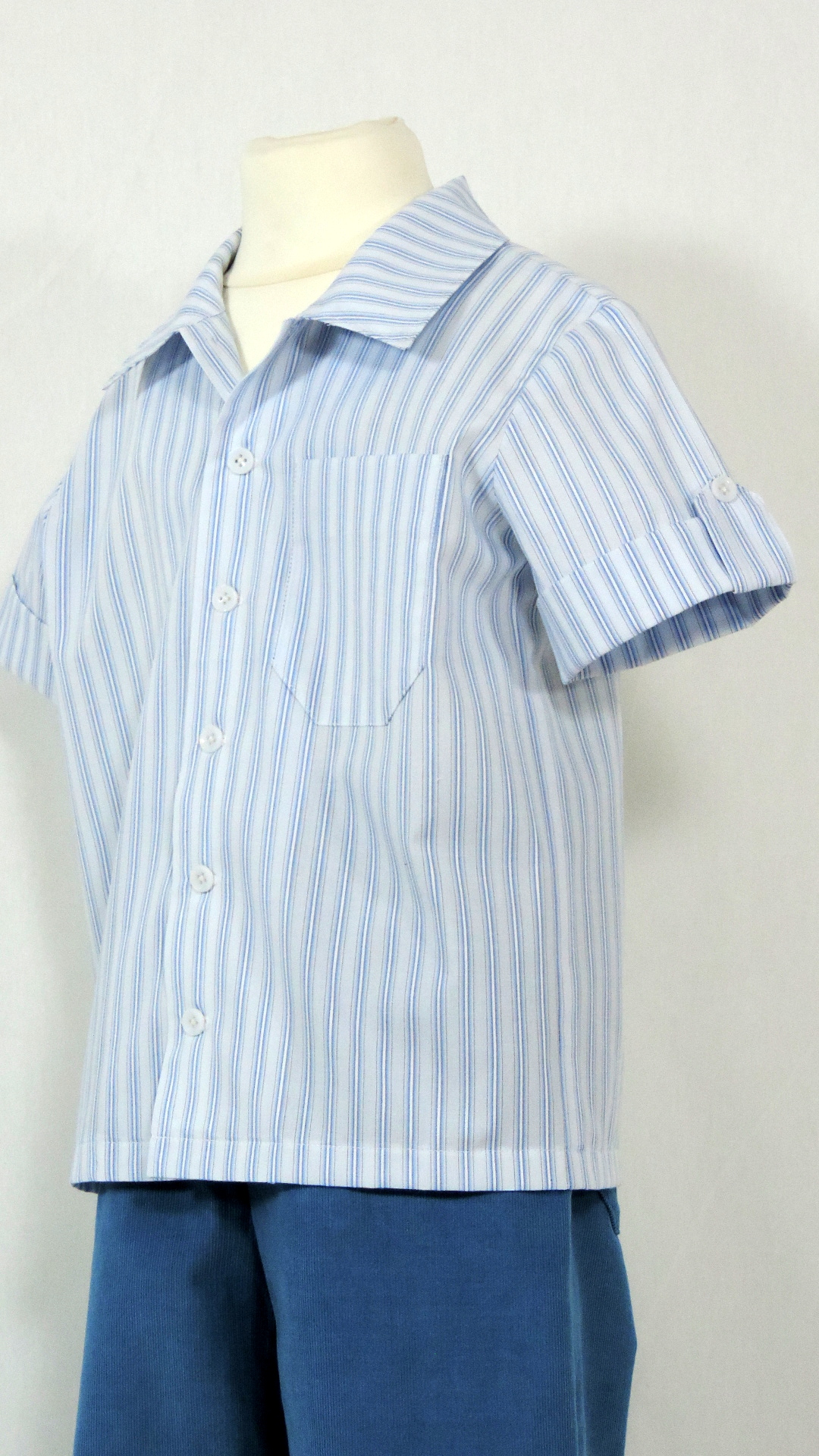 Ensemble bestehend Hose und Hemd. Die blaue Cord-Hose hat vorne und hinten Taschen. Das weiss-blau gestreifte Hemd hat eine Brusttasche und aufgeschlagene Ärmel. Beide Stoffe sind aus Baumwolle.
