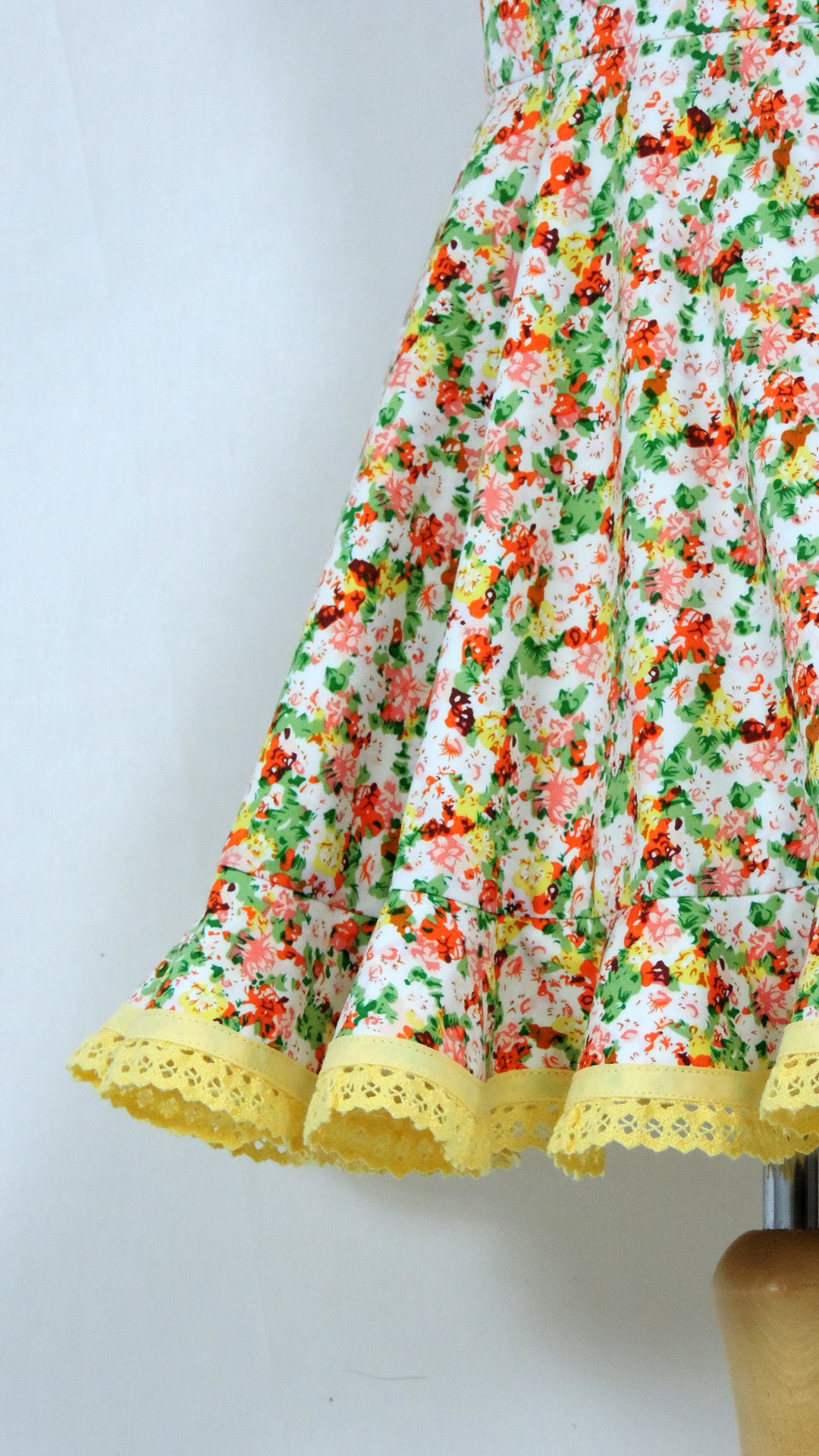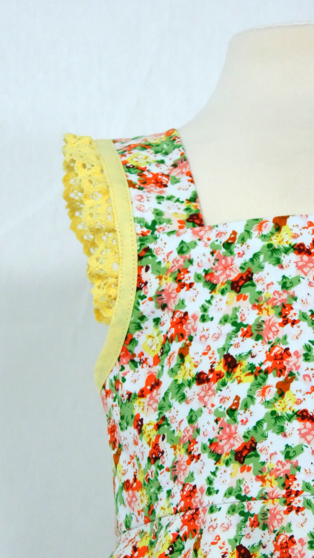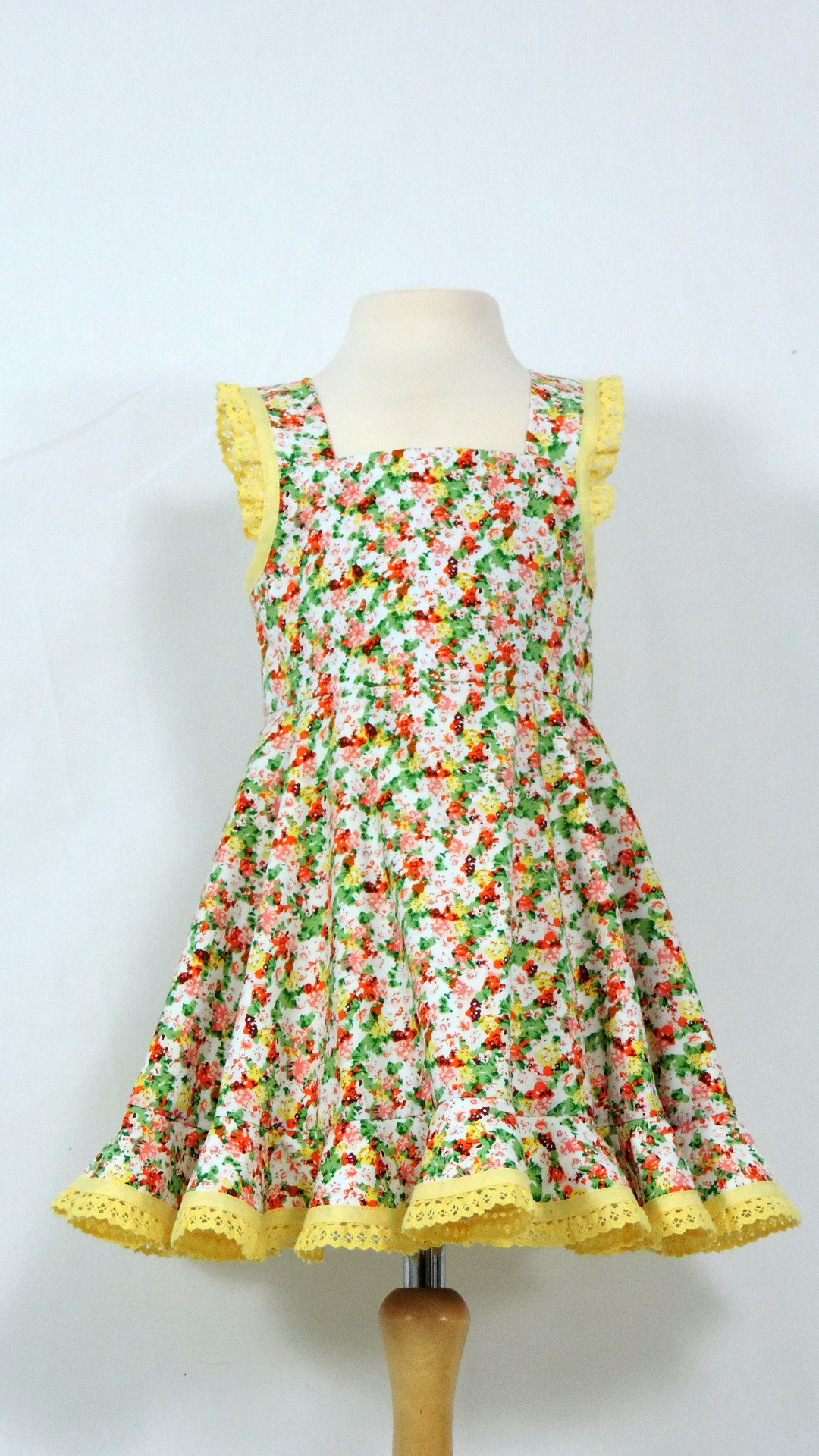 Festliches Trägerkleid mit Volant. Der weiss grundige, gelb/grün/lachs gemusterte Stoff ist an Volant und Träger mit gelber Spitze besetzt. Das Kleid aus Baumwolle ist voll gefüttert.