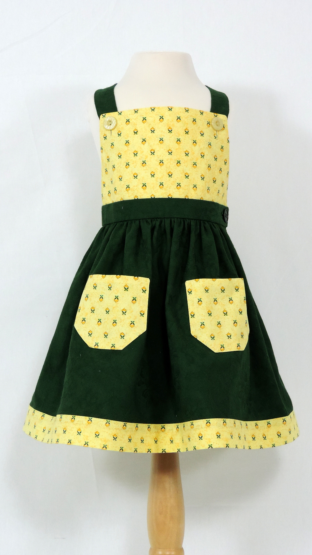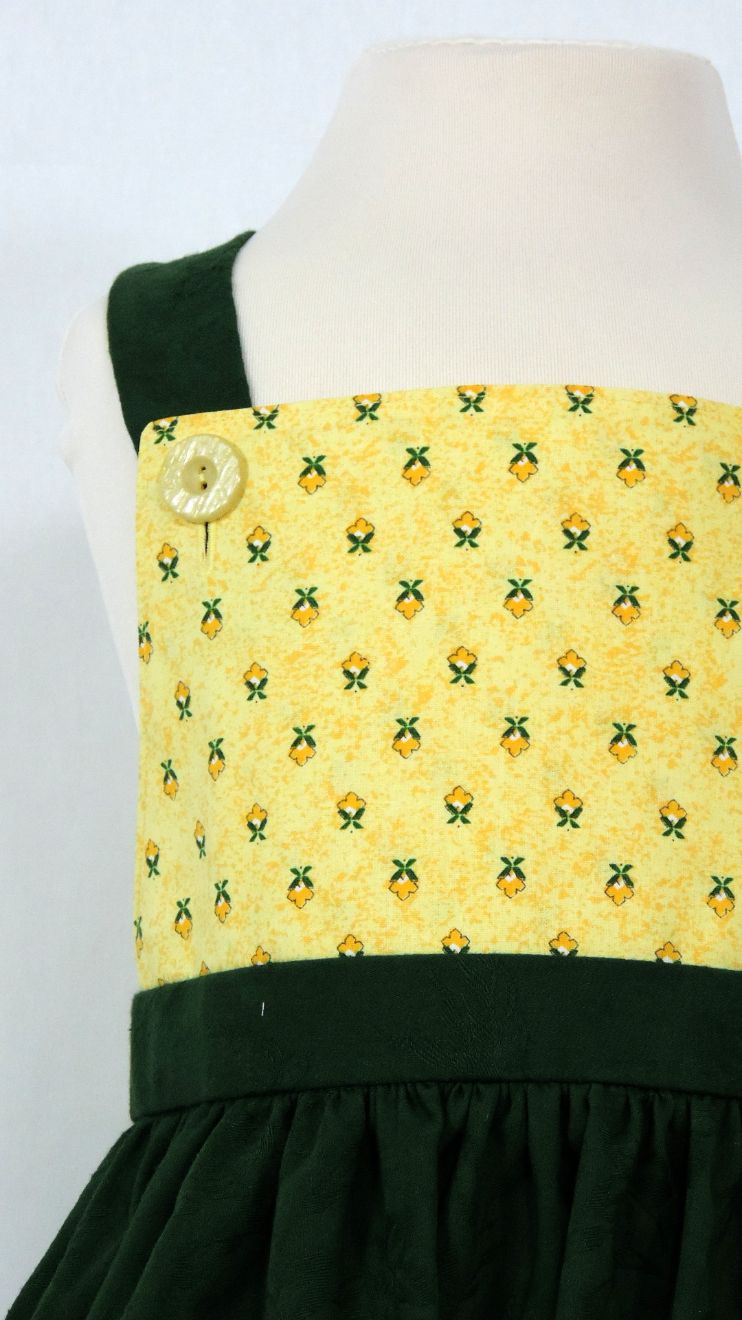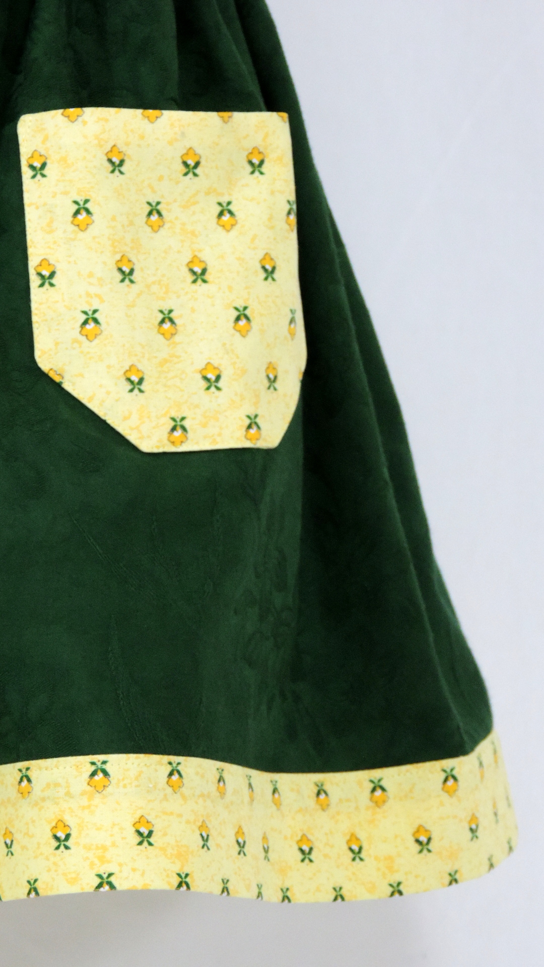 Latzrock aus Baumwollstoff. Der dunkelgrüne Rock ist an Latz, Saum und Taschen mit gelbgrundigem, mit Blüten bedrucktem Stoff ergänzt.