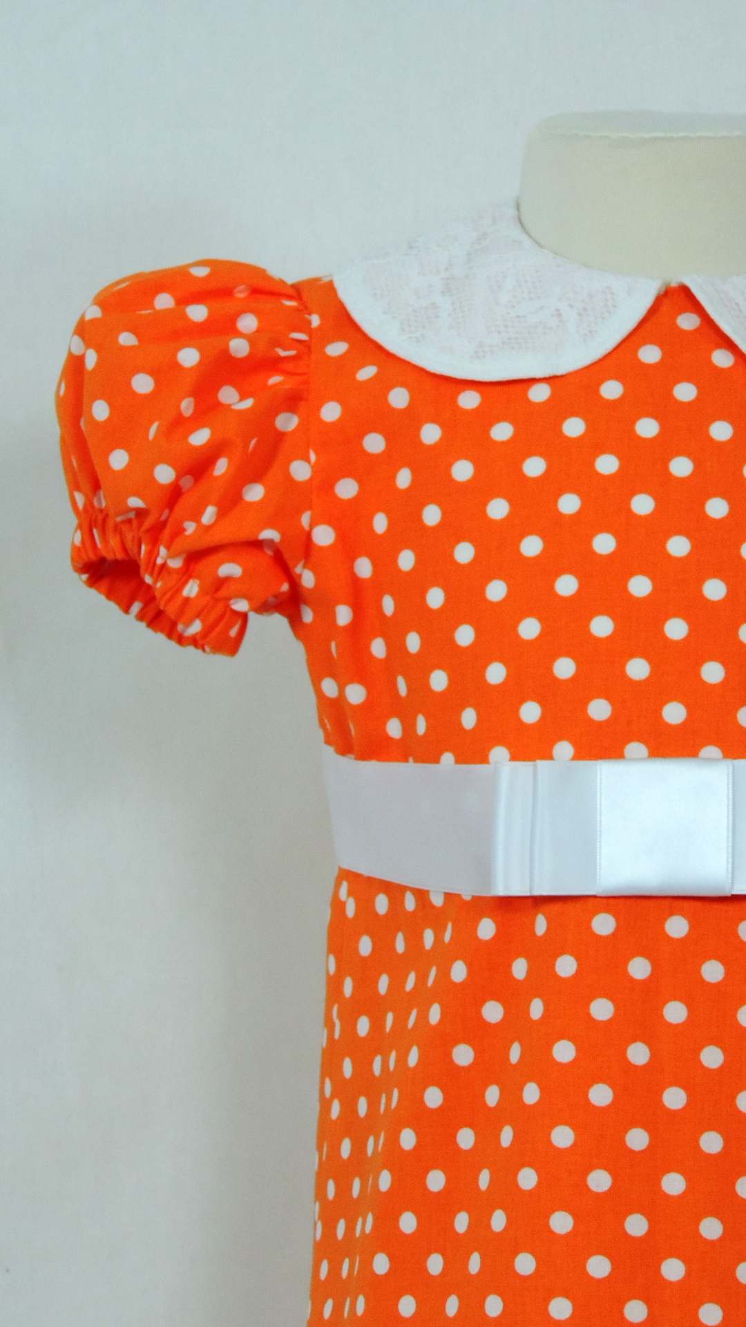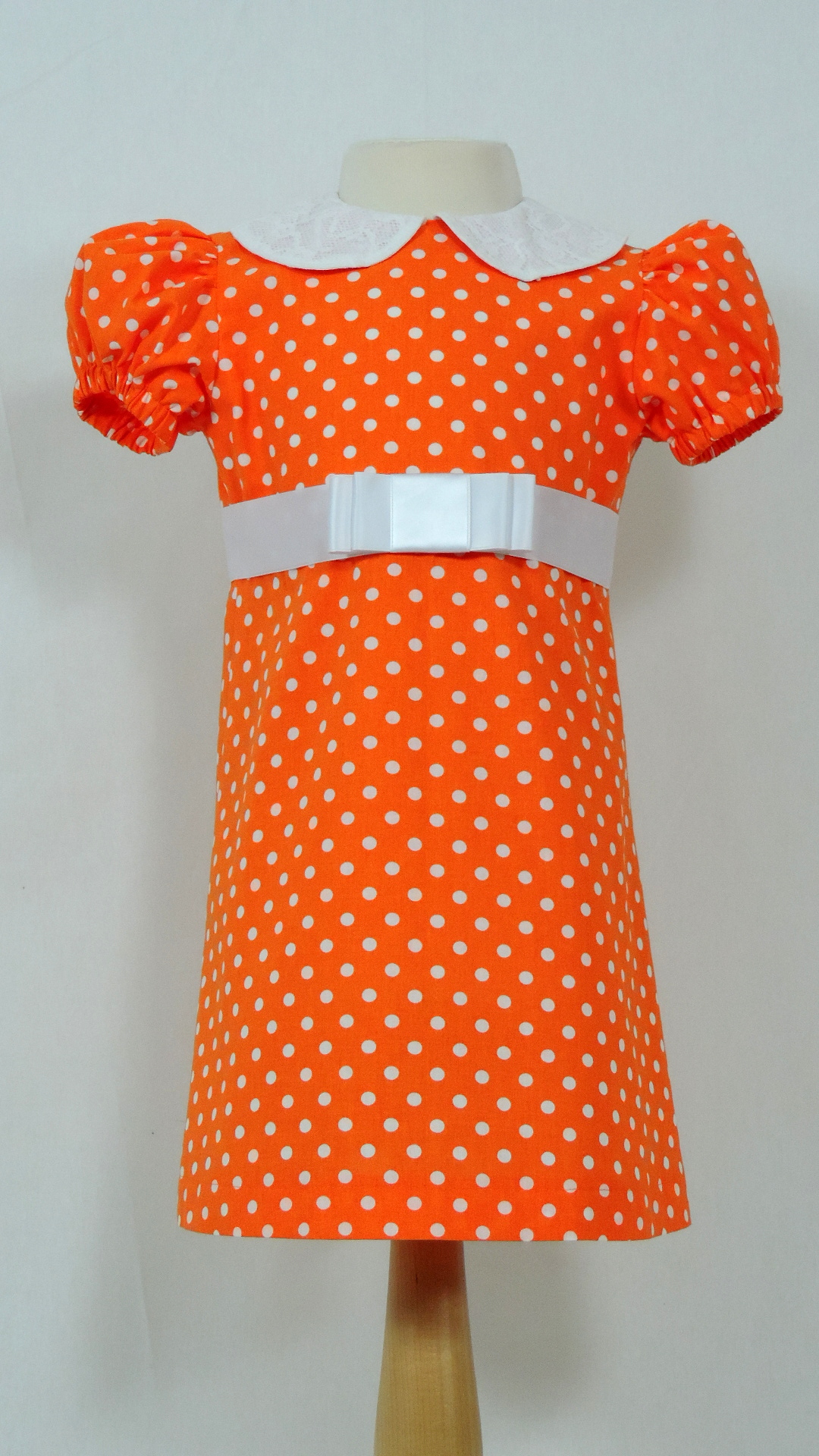 Festliches Kleid mit Puffärmeln, Spitzenkragen und Satingurt. Der orange, weiss gepunktete Stoff ist aus Baumwolle, Kragenspitze und Satingurt sind synthetisch.