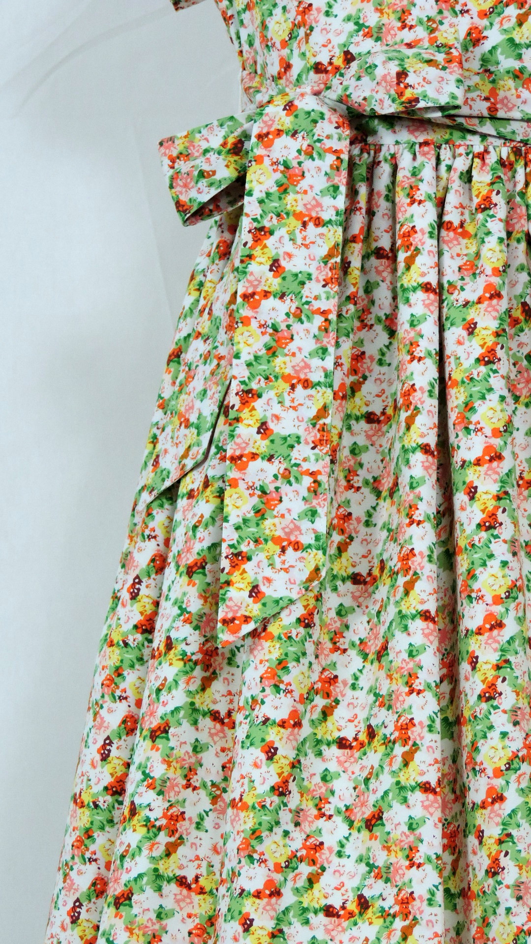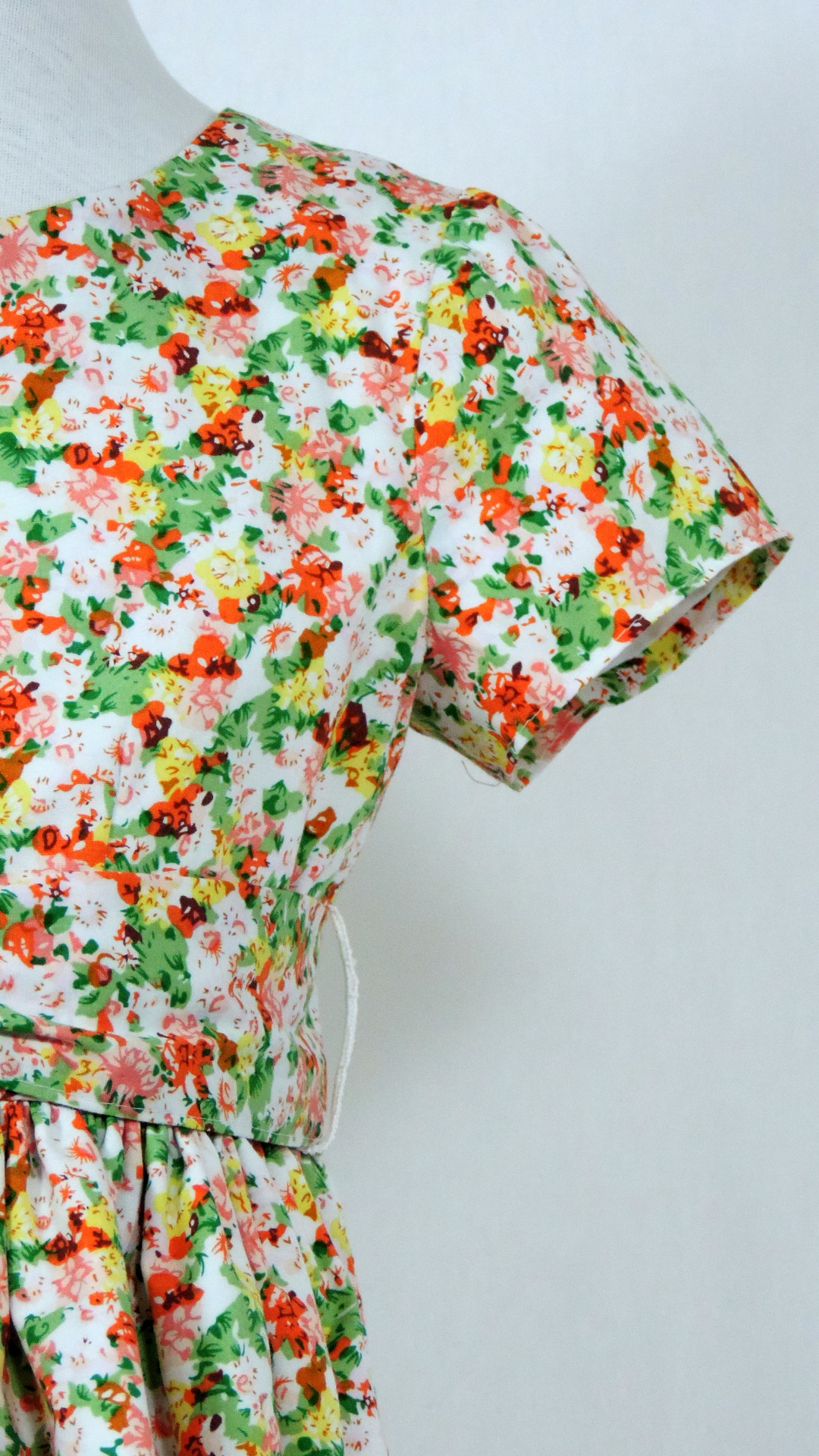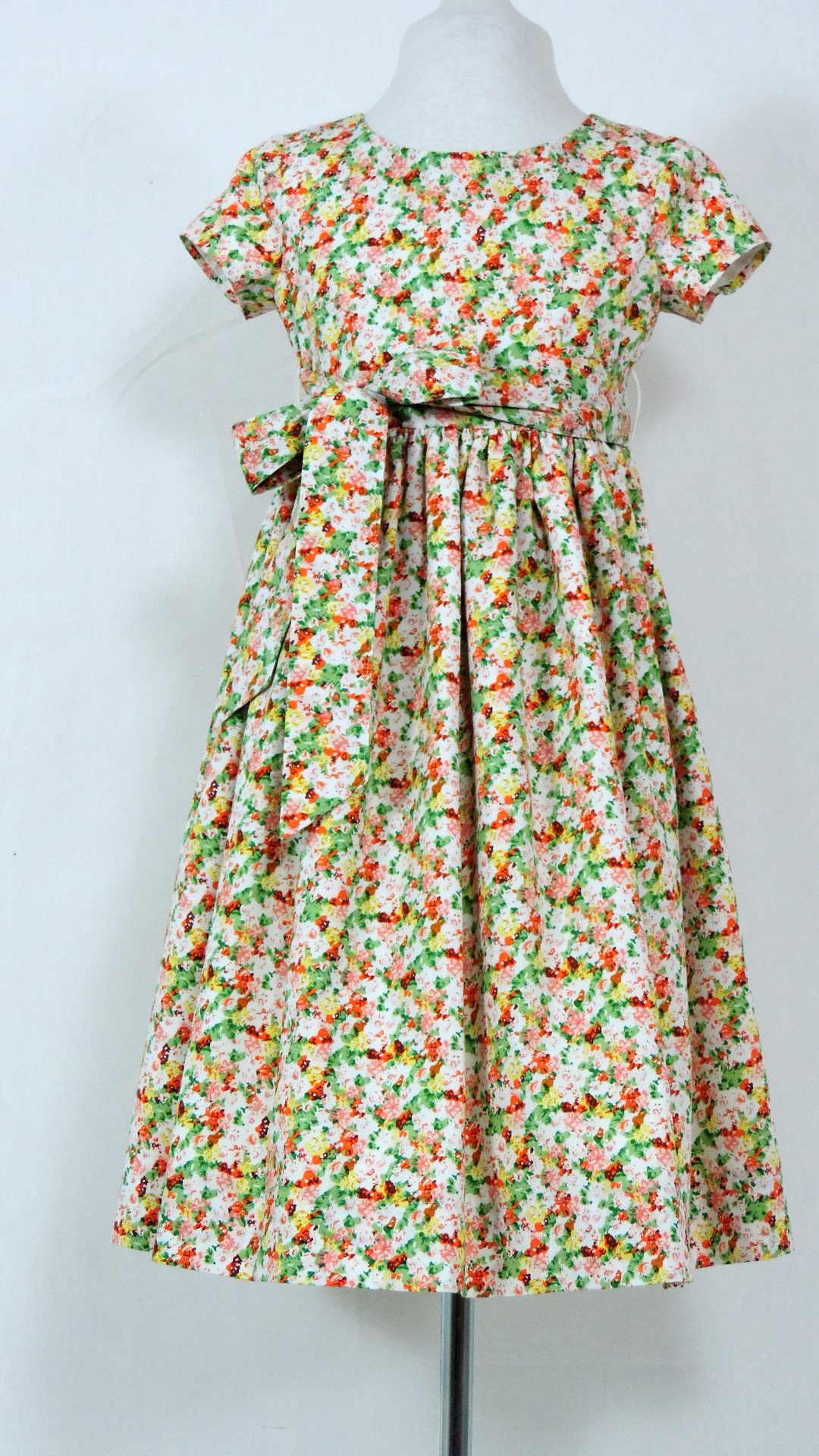 Kleid im Volklorestil mit kurzen Ärmeln und Bindegurt. Das Kleid aus weiss grundigem, bunt gemustertem Stoff ist voll gefüttert. Beide Stoffe sind aus Baumwolle.