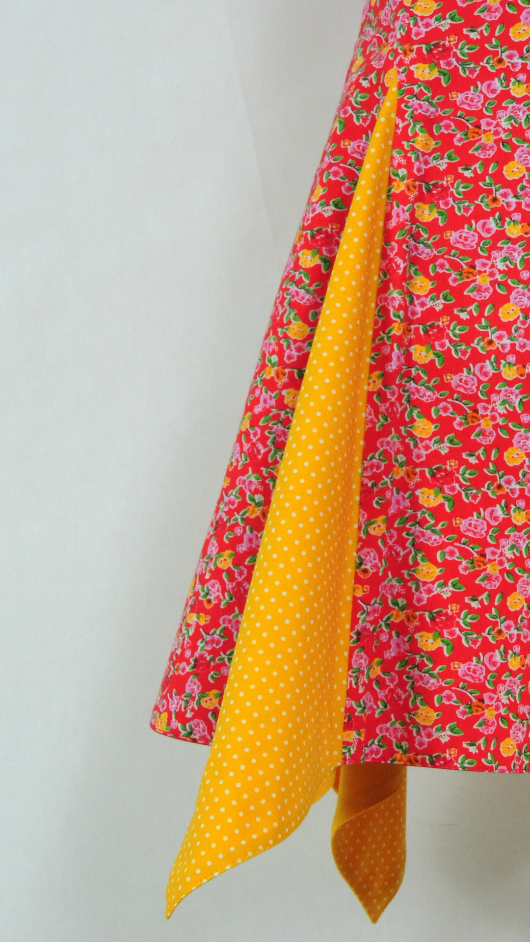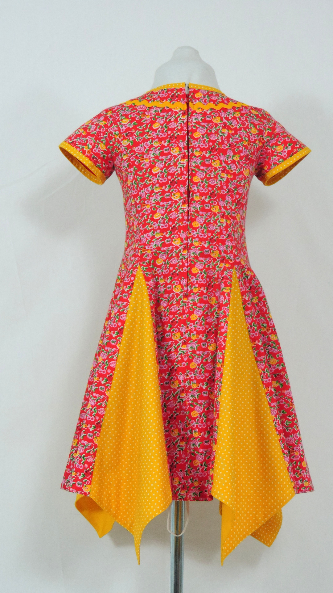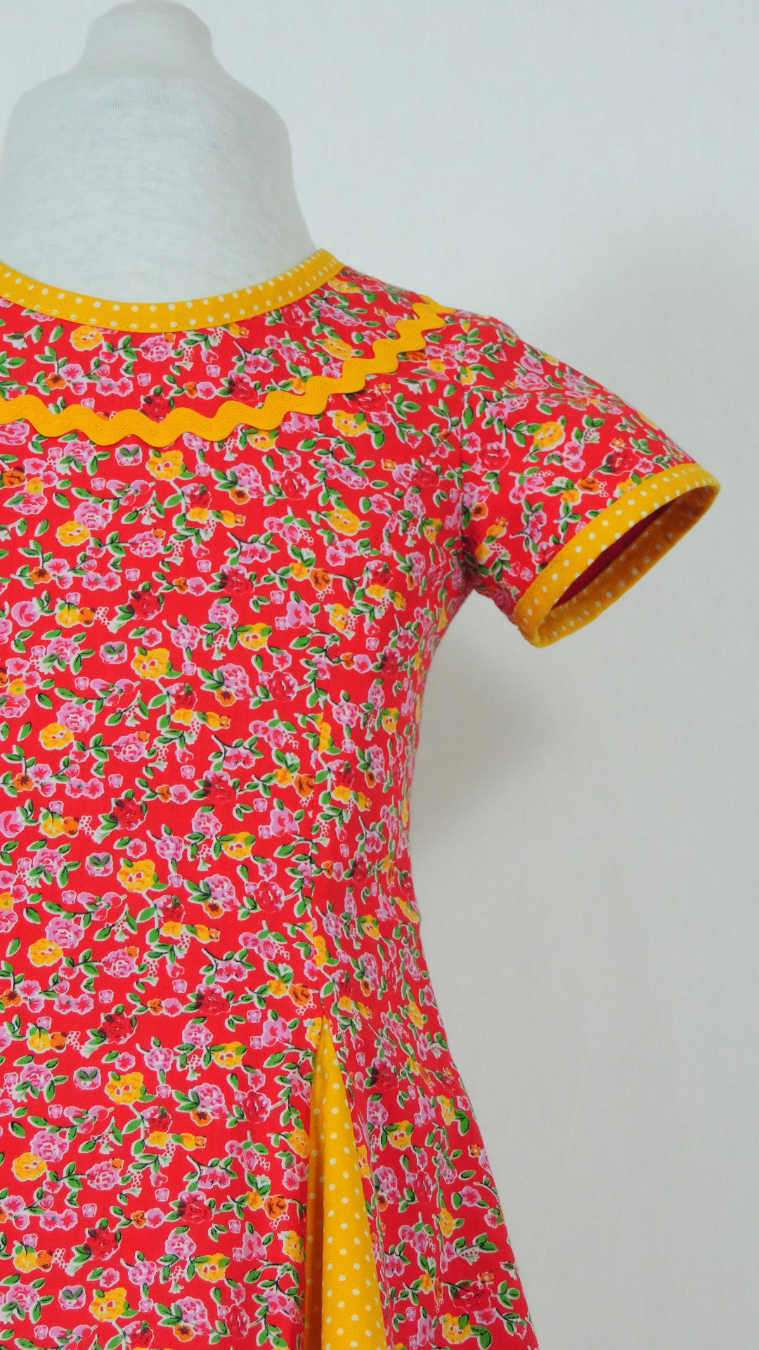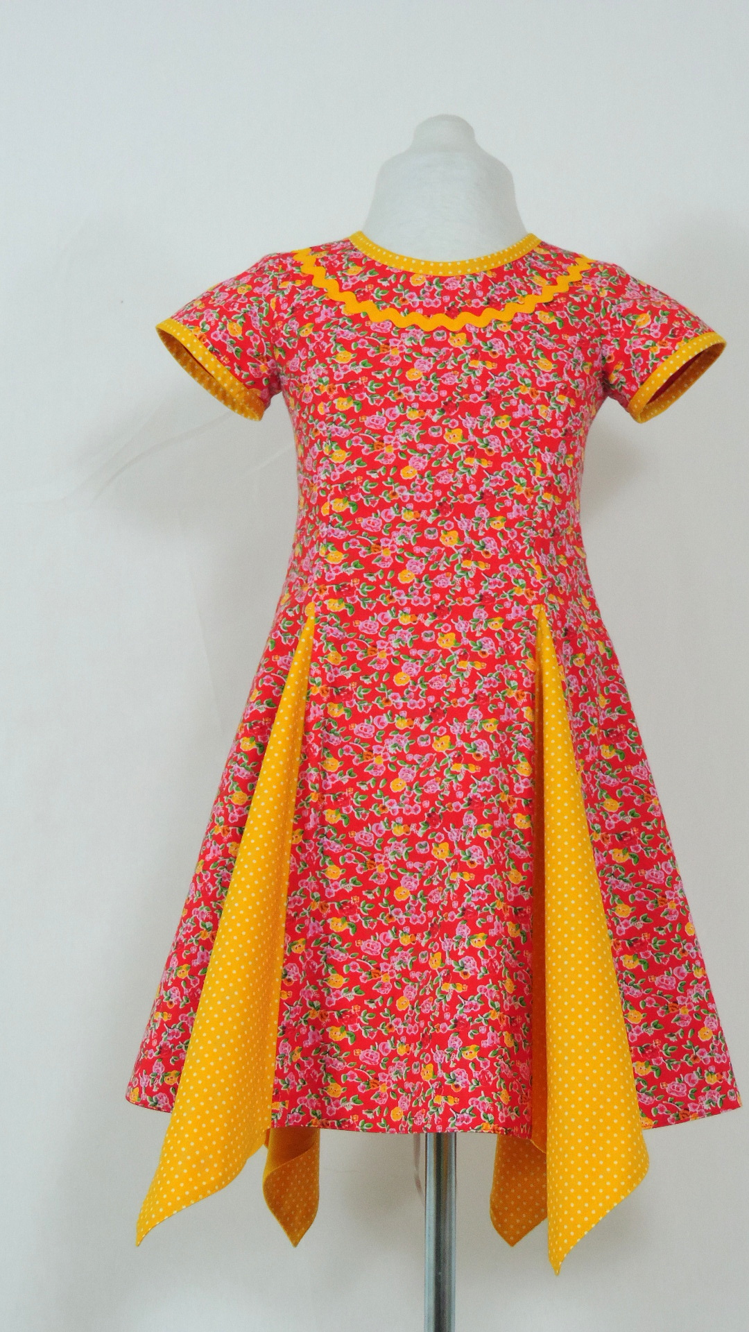 Zweifarbiges Kleid mit Codet-Einsätzen. Der Hauptstoff ist rot mit bunten Blüten, der Codet-Stoff gelb mit weissen Punkten. Das Kleid ist voll gefüttert. Alle Stoffe und Garnituren sind aus Baumwolle.