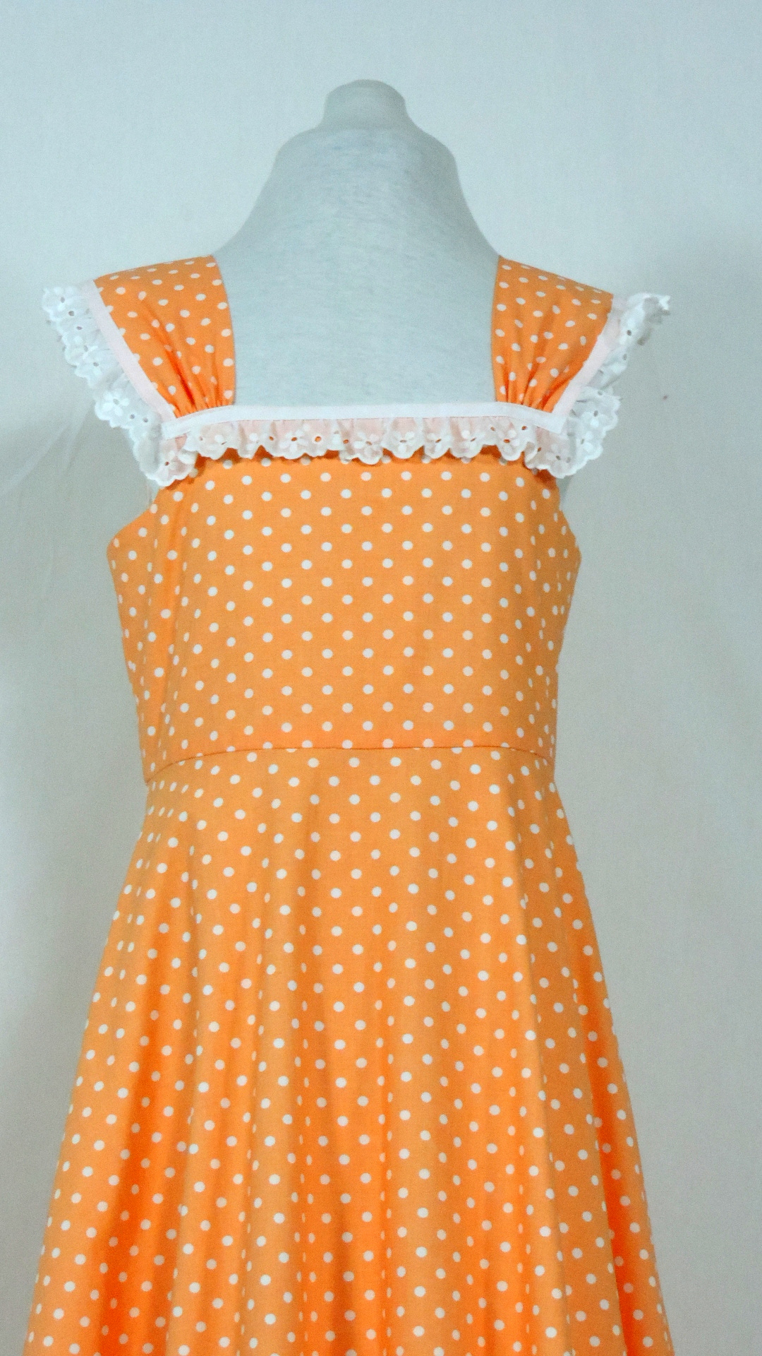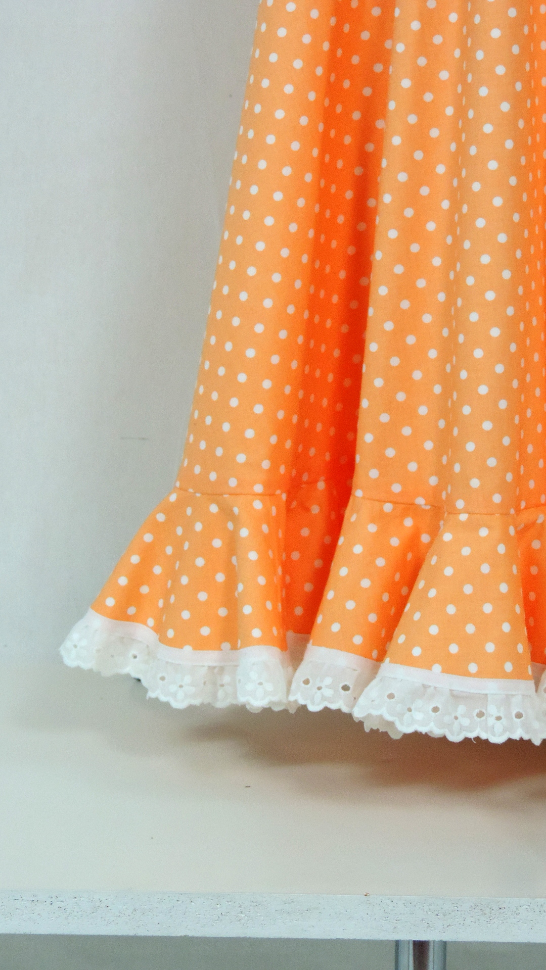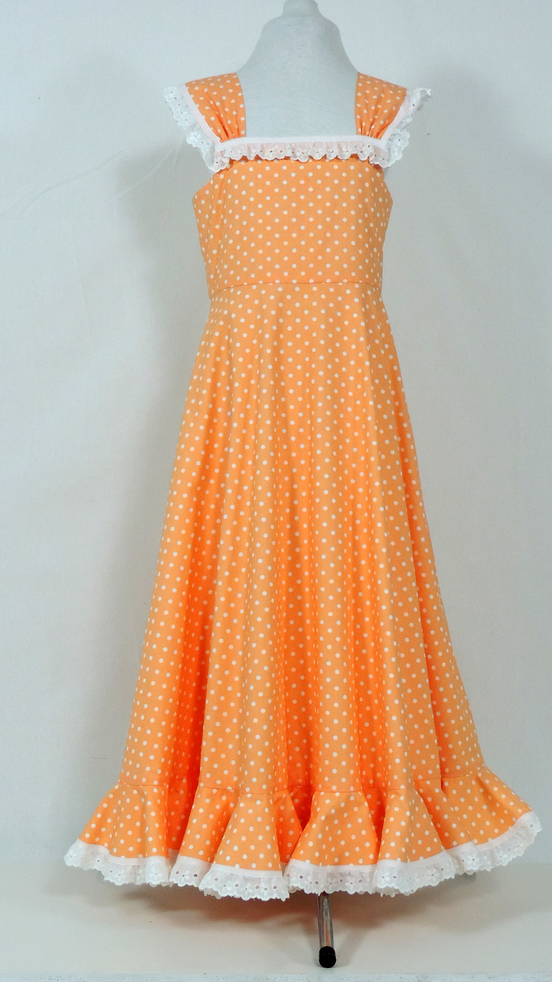 Flamencokleid mit langem Rock und einer Volantbahn. Volant, Ausschnitt und Träger enden in einer weissen Spitze. Das Kleid ist voll gefüttert. Der abricot farbene, mit weissen Punkten bedruckte Stoff und der Futterstoff sind aus Baumwolle. Die untere Weite des Kleides beträgt ca. 3 Meter.