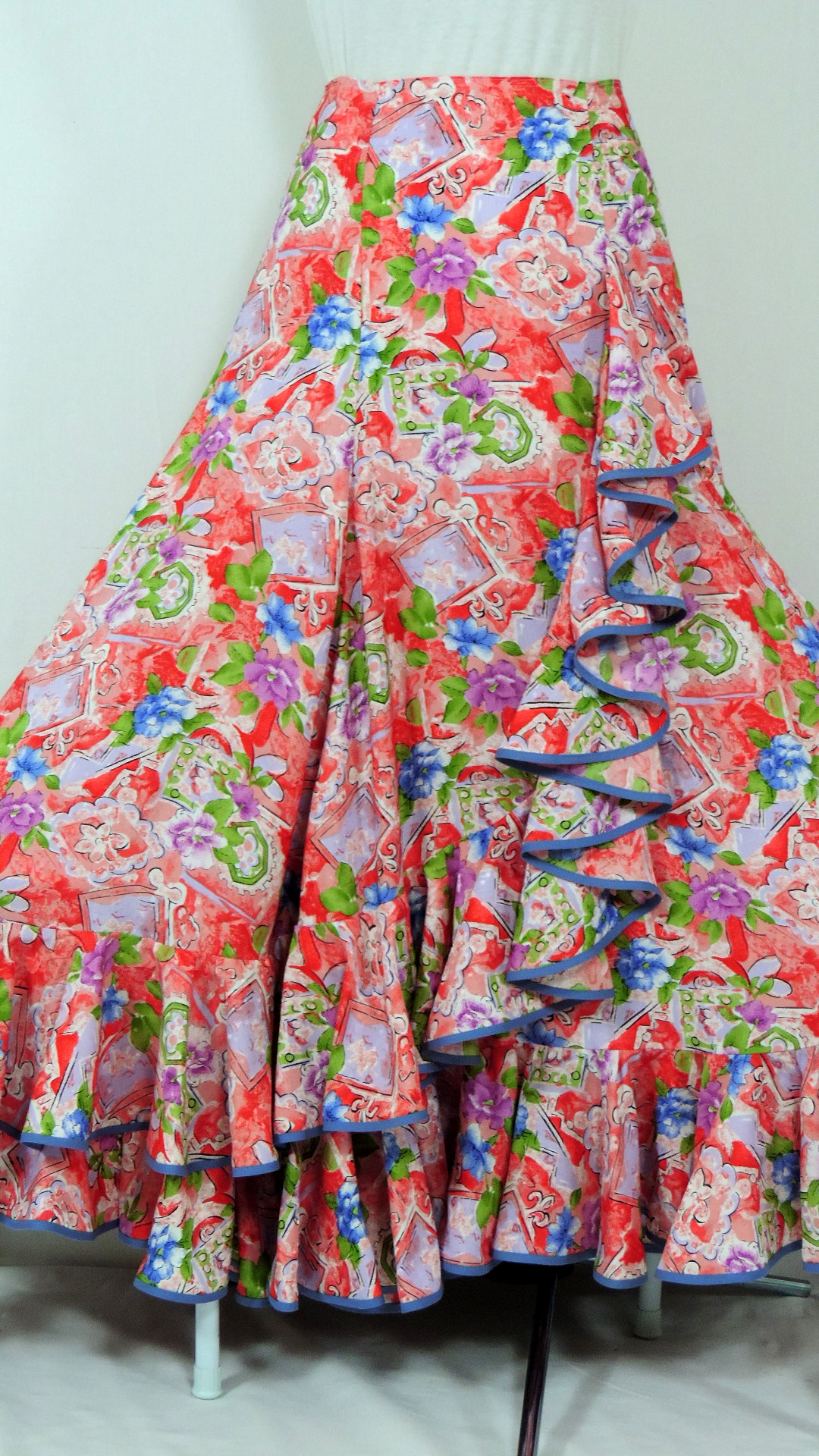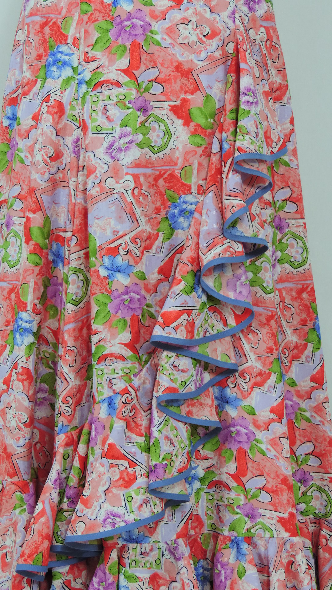 Leichter Flamencorock mit zwei Volantbahnen. Der Rock ist aus rosa/rot/blau gemustertem, leicht glänzendem Polyesterstoff gefertigt. Das obere Volant ist vorne seitlich hochgezogen. Die Rocklänge beträgt 95 cm, die untere Weite ca. 4 Meter.