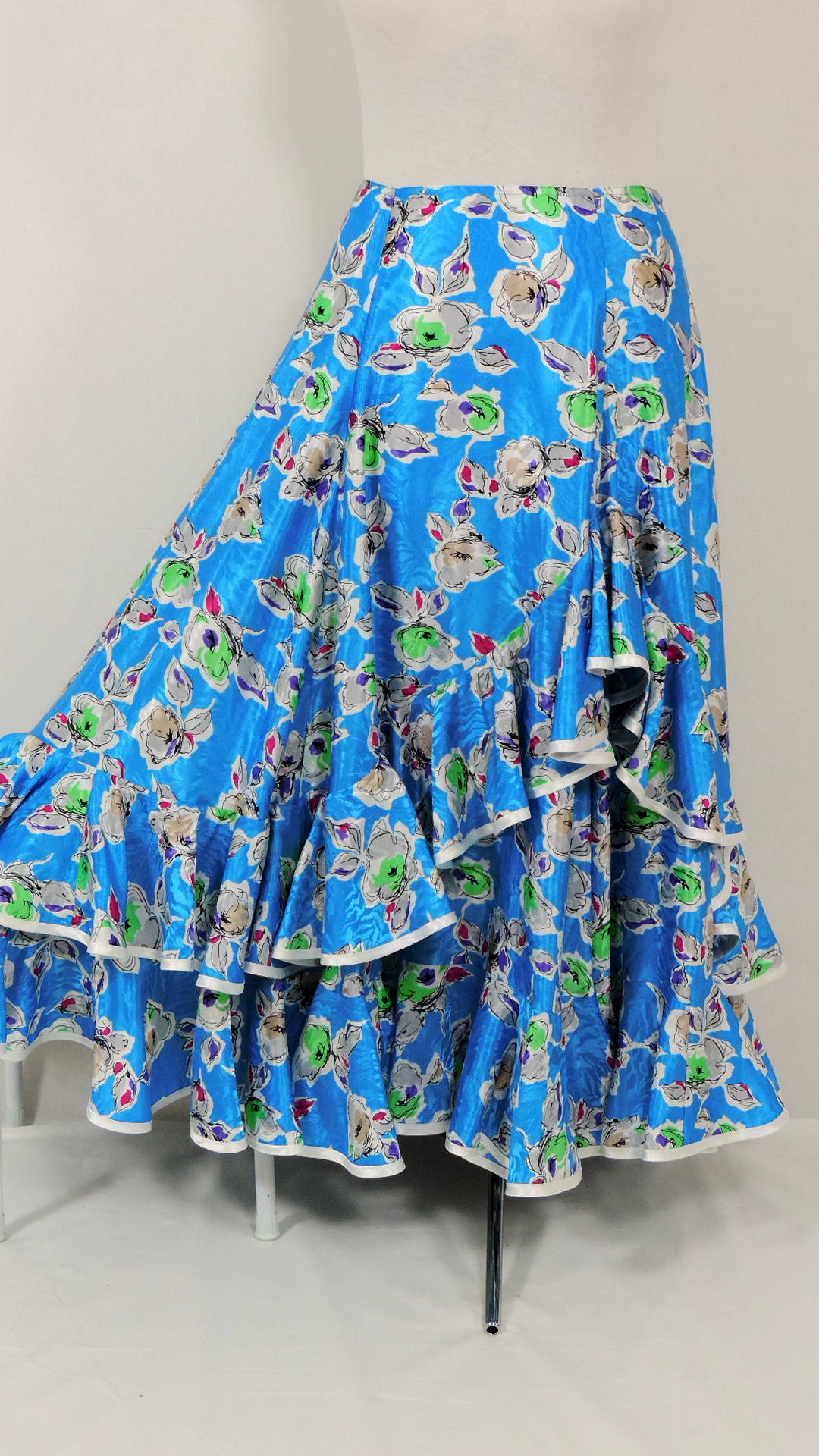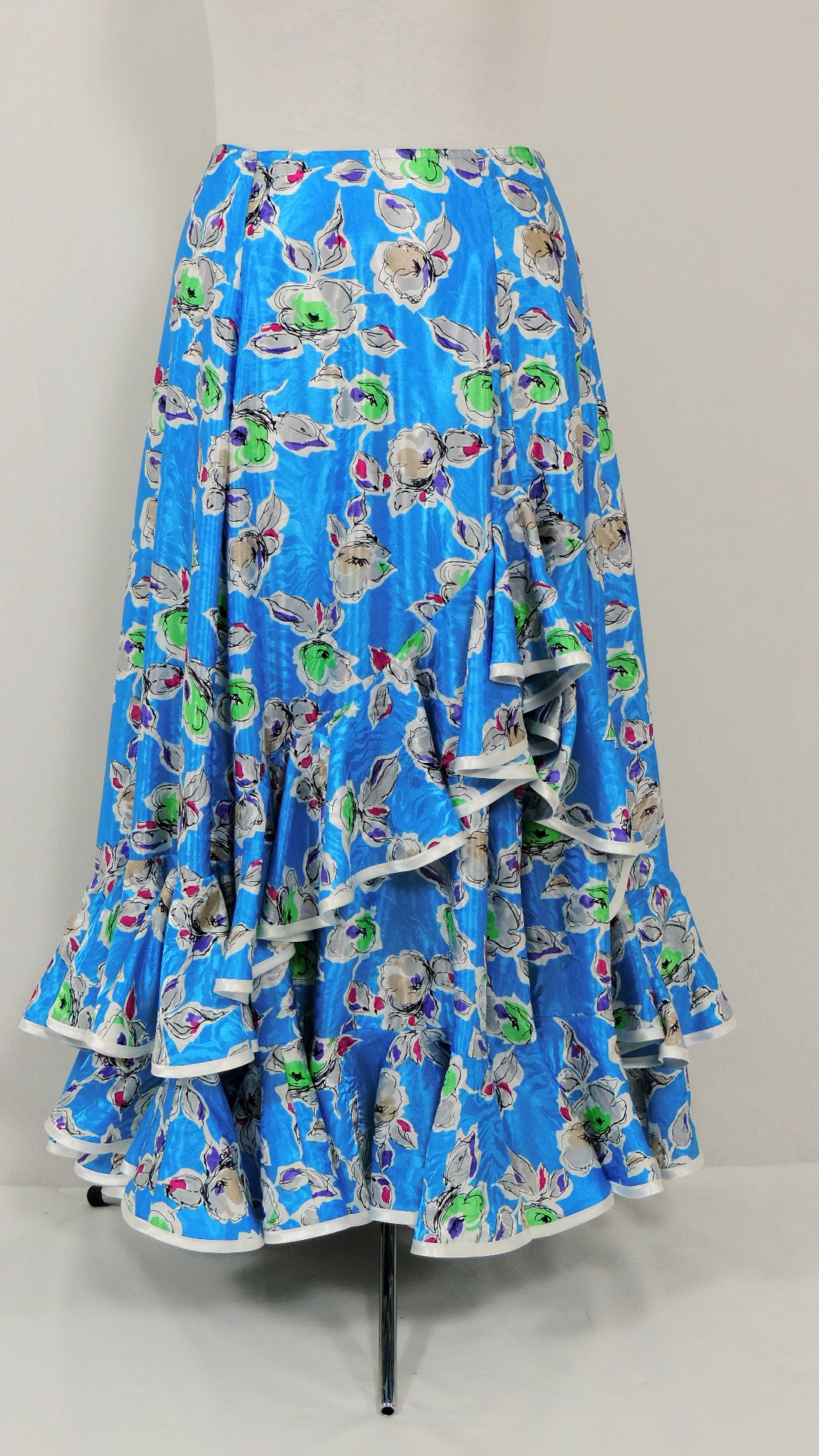 Leichter Flamencorock mit zwei Volantbahnen. Der Rock ist aus meerblauem, leicht glänzendem Polyesterstoff mit buntem Blütendruck. Das obere Volant ist vorne seitlich hochgezogen. Die Rocklänge beträgt 95 cm, die untere Weite ca. 4 Meter.