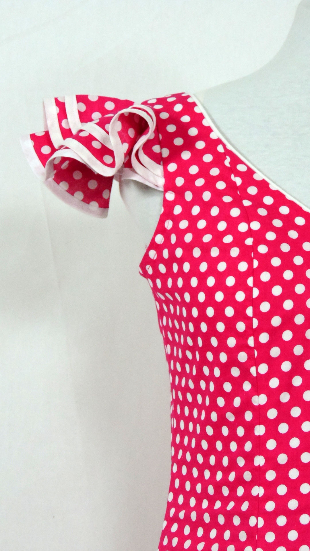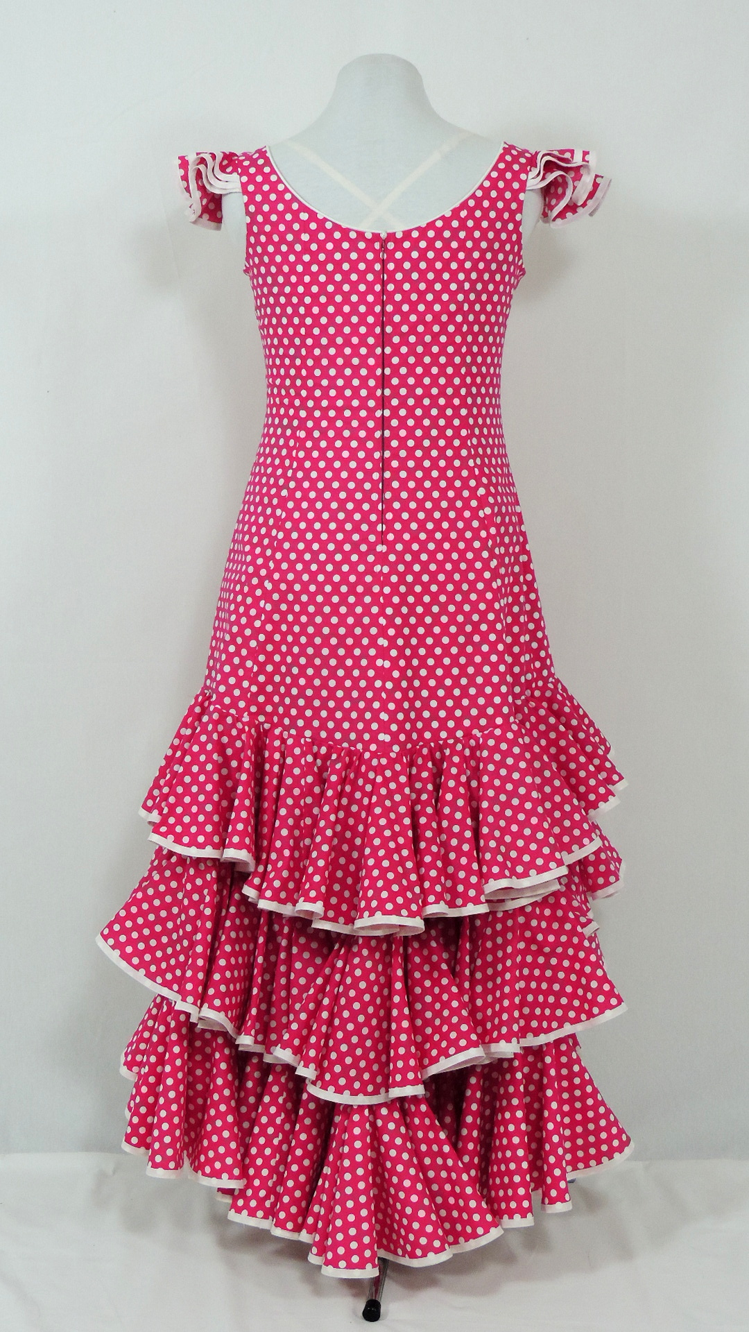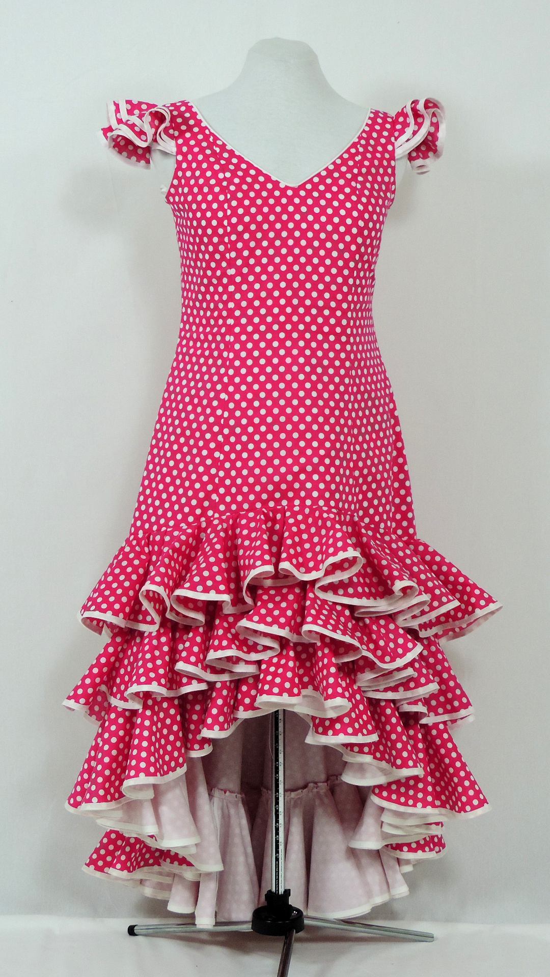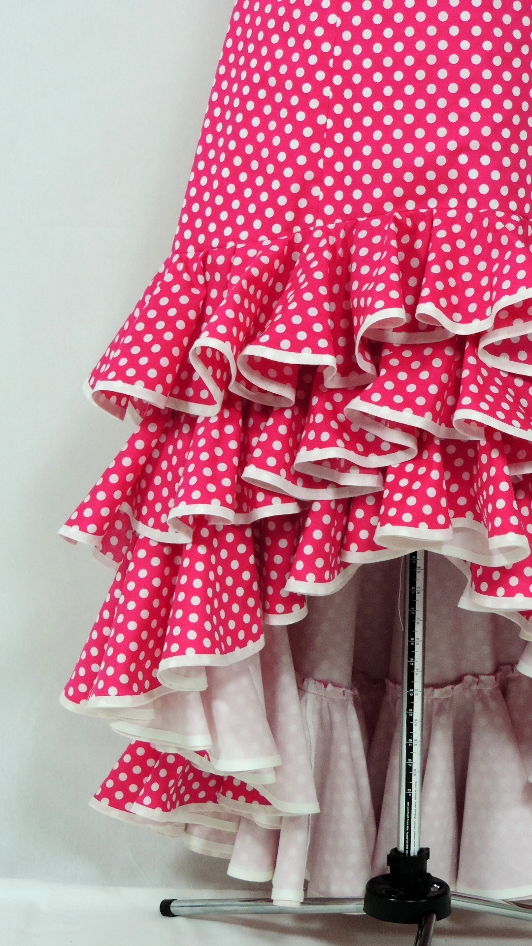 Flamencokleid im Fokuhilastil mit drei Volantbahnen und kleinen Flügelärmeln. Kleid und unterstes Volant sind gefüttert. Der pink farbene, mit weissen Punkten bedruckte Stoff, der Futterstoff und die Einfassbänder sind aus Baumwolle. Die Rocklänge ab Taille beträgt vorne ca. 60 cm, hinten ca. 105 cm. die unter Weite ca. 3.5 Meter.