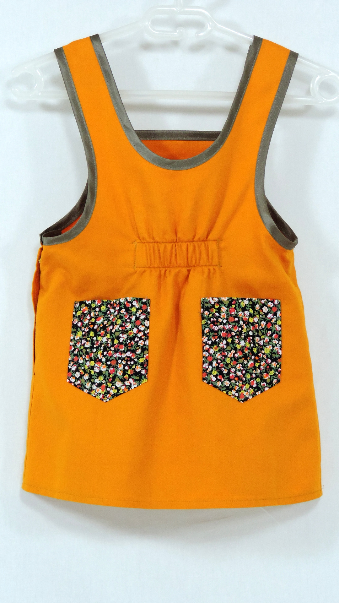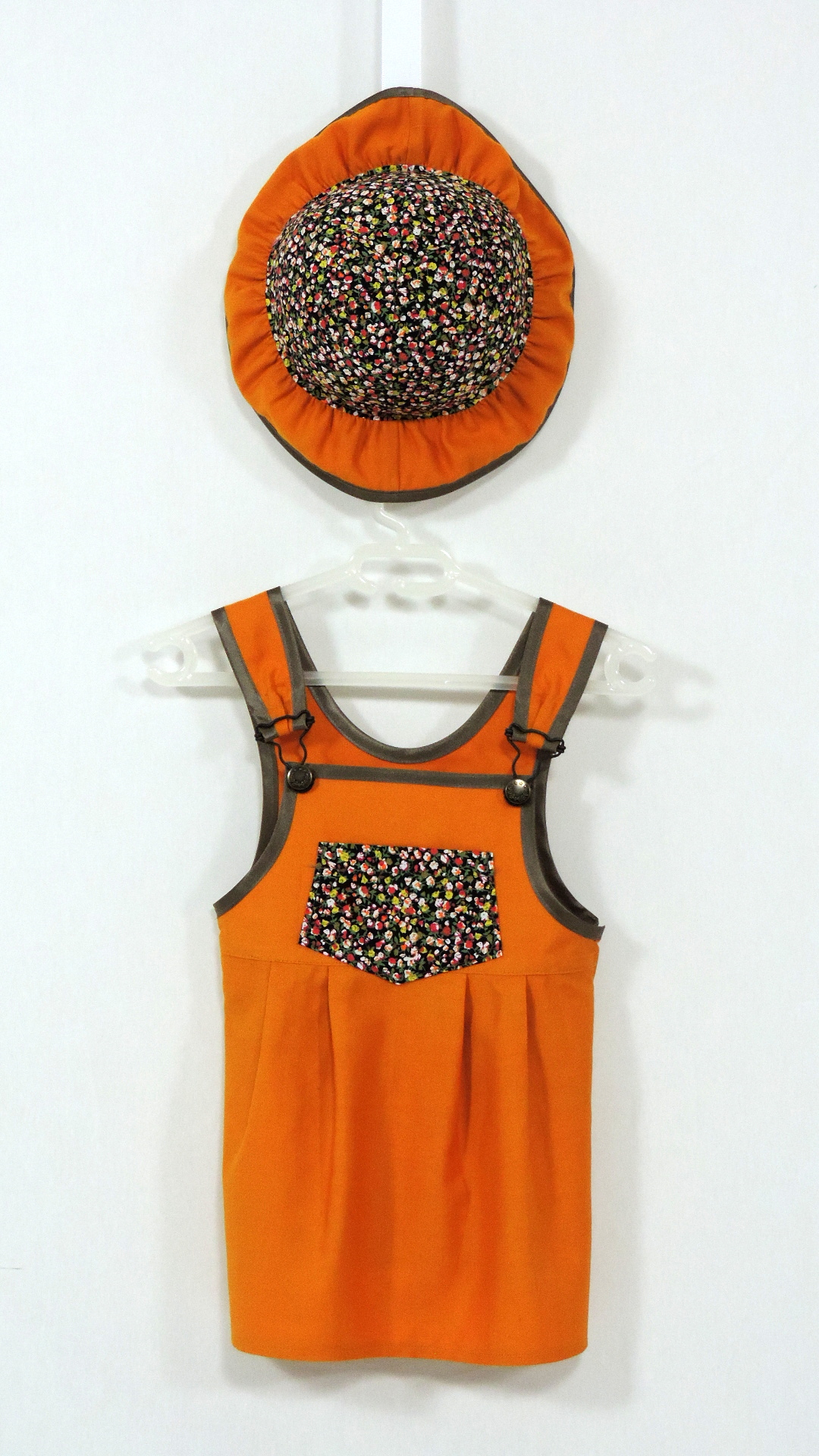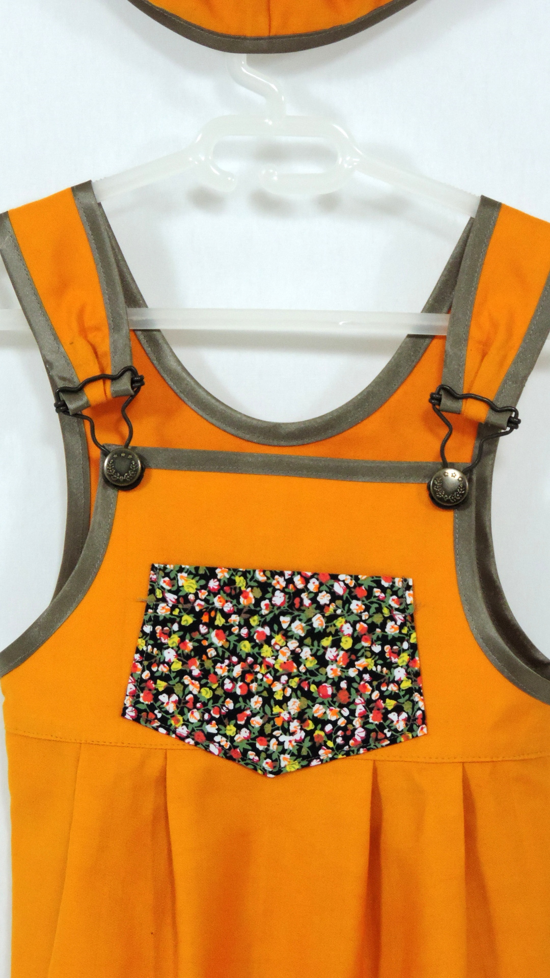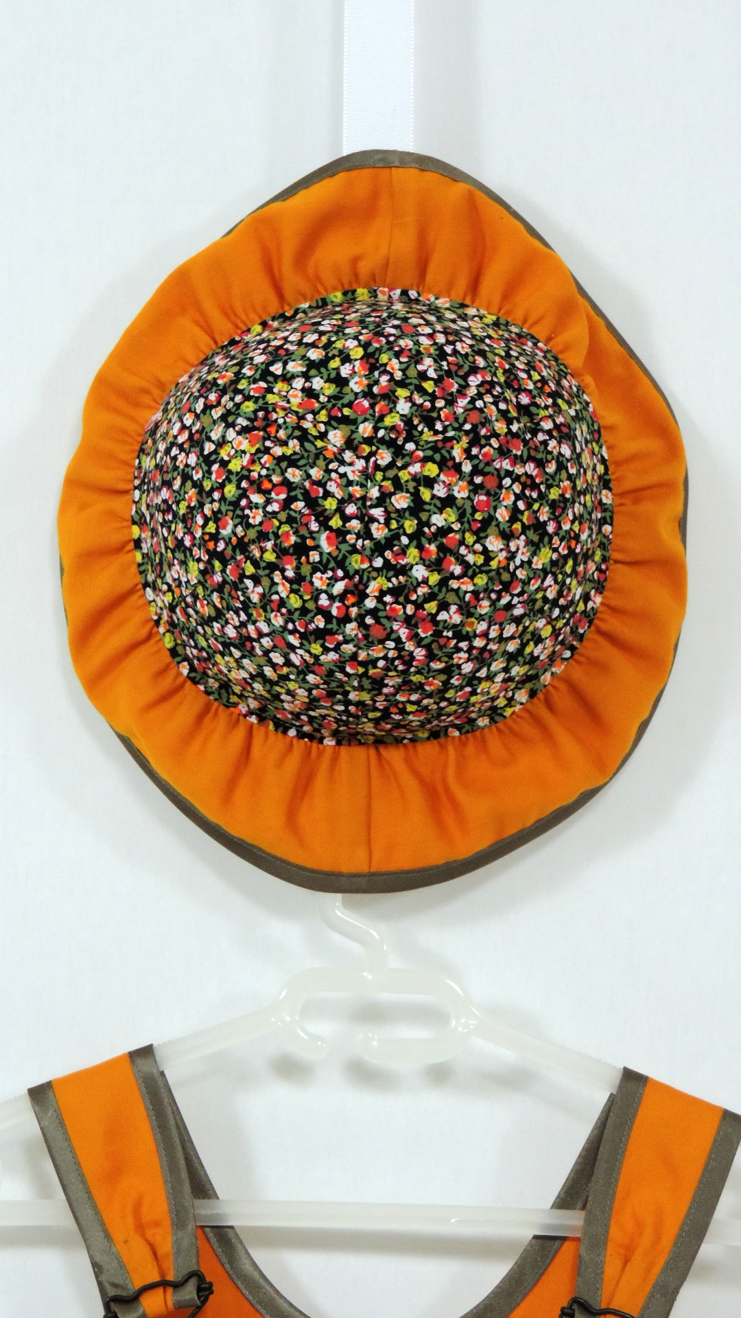 Latzrock und Hütchen im Safaristil. Der senfgelbe Stoff an Rock und Hutkrempe und der schwarze, mit bunten Blüten bedruckte Stoff an Tasche und Hut sind aus Baumwolle, das Einfassband ist synthetisch.