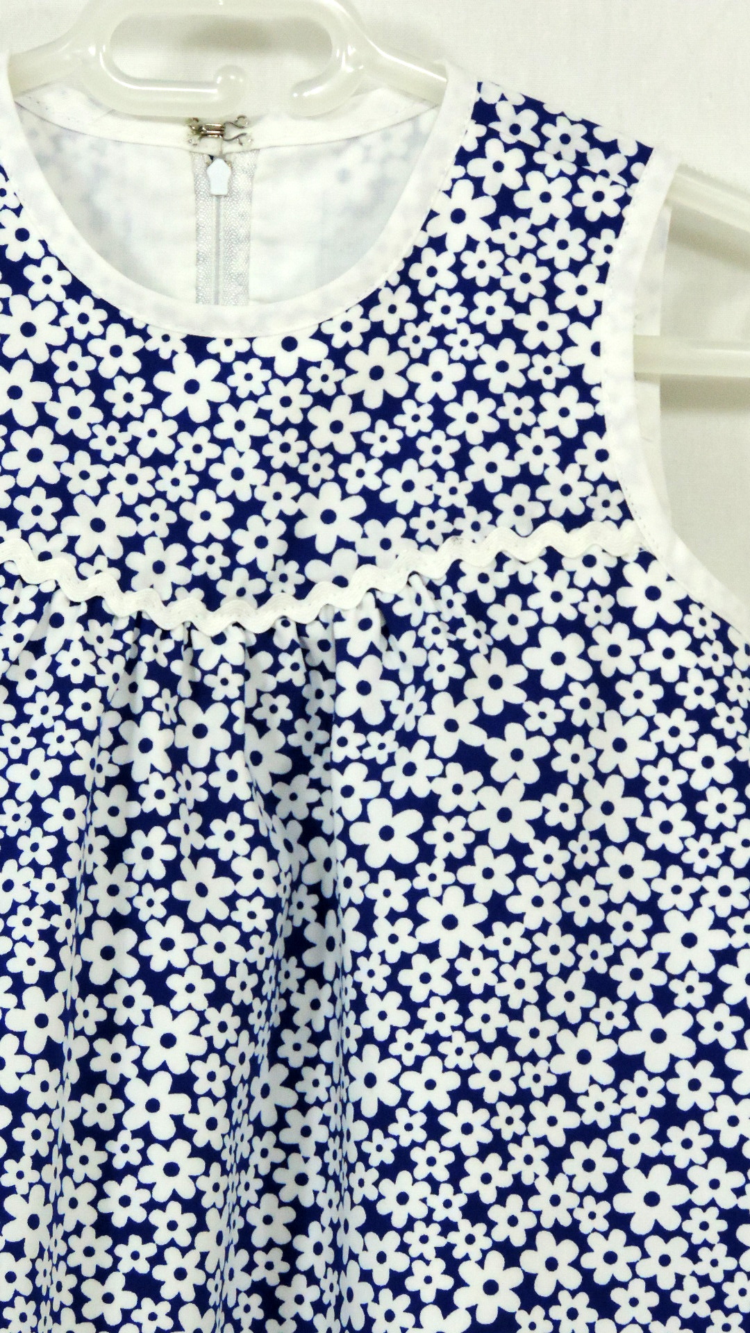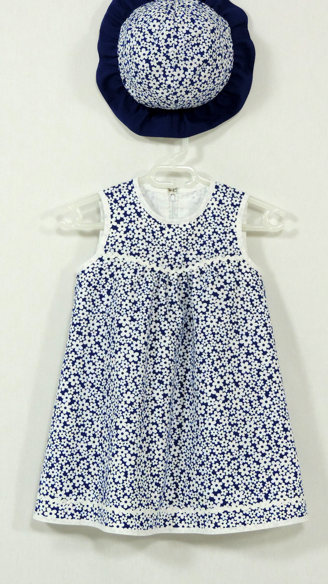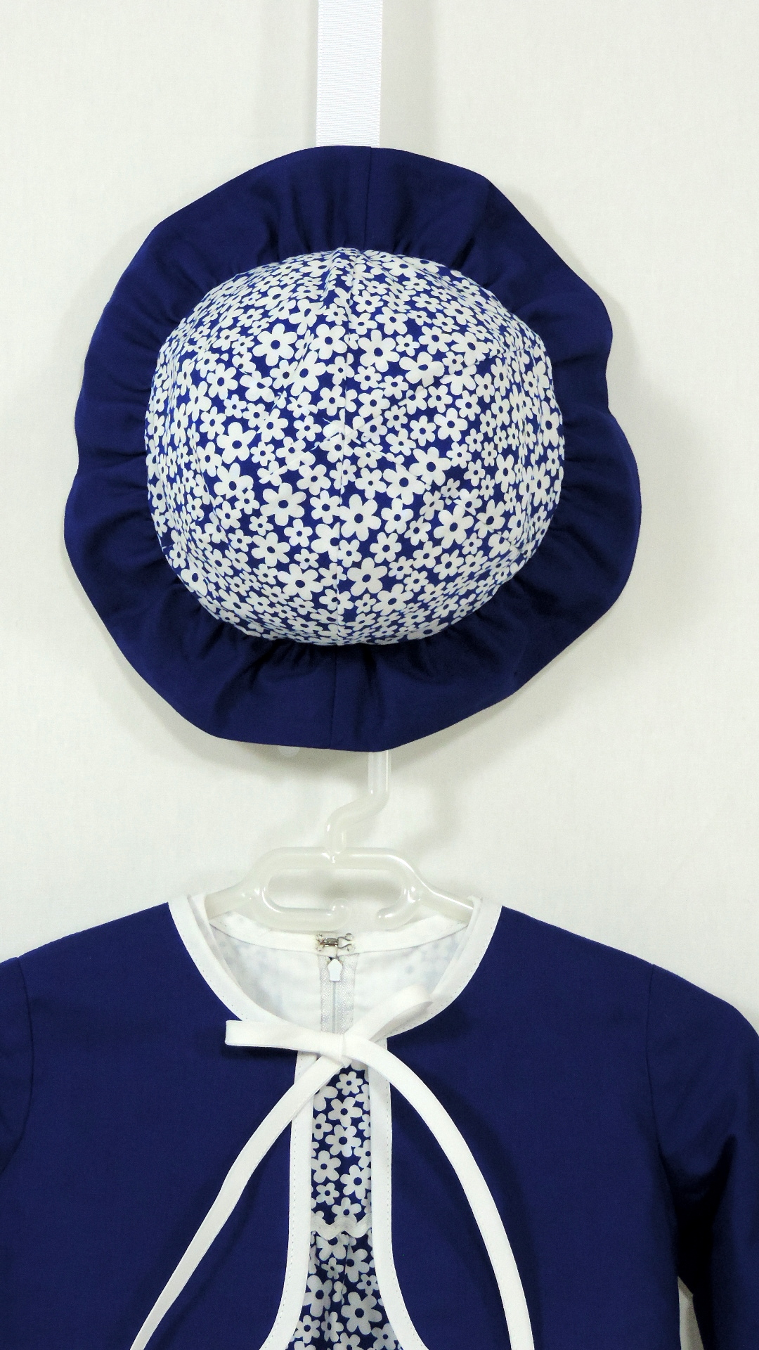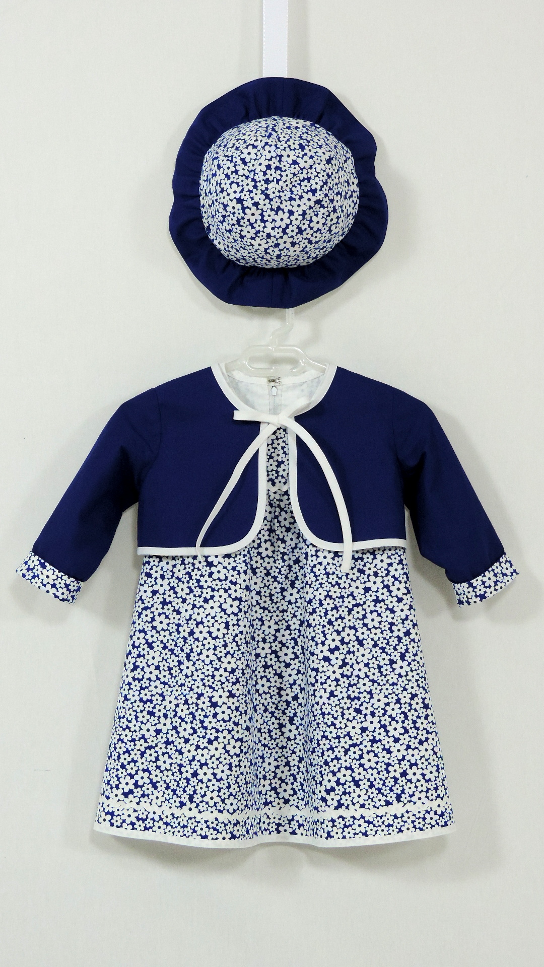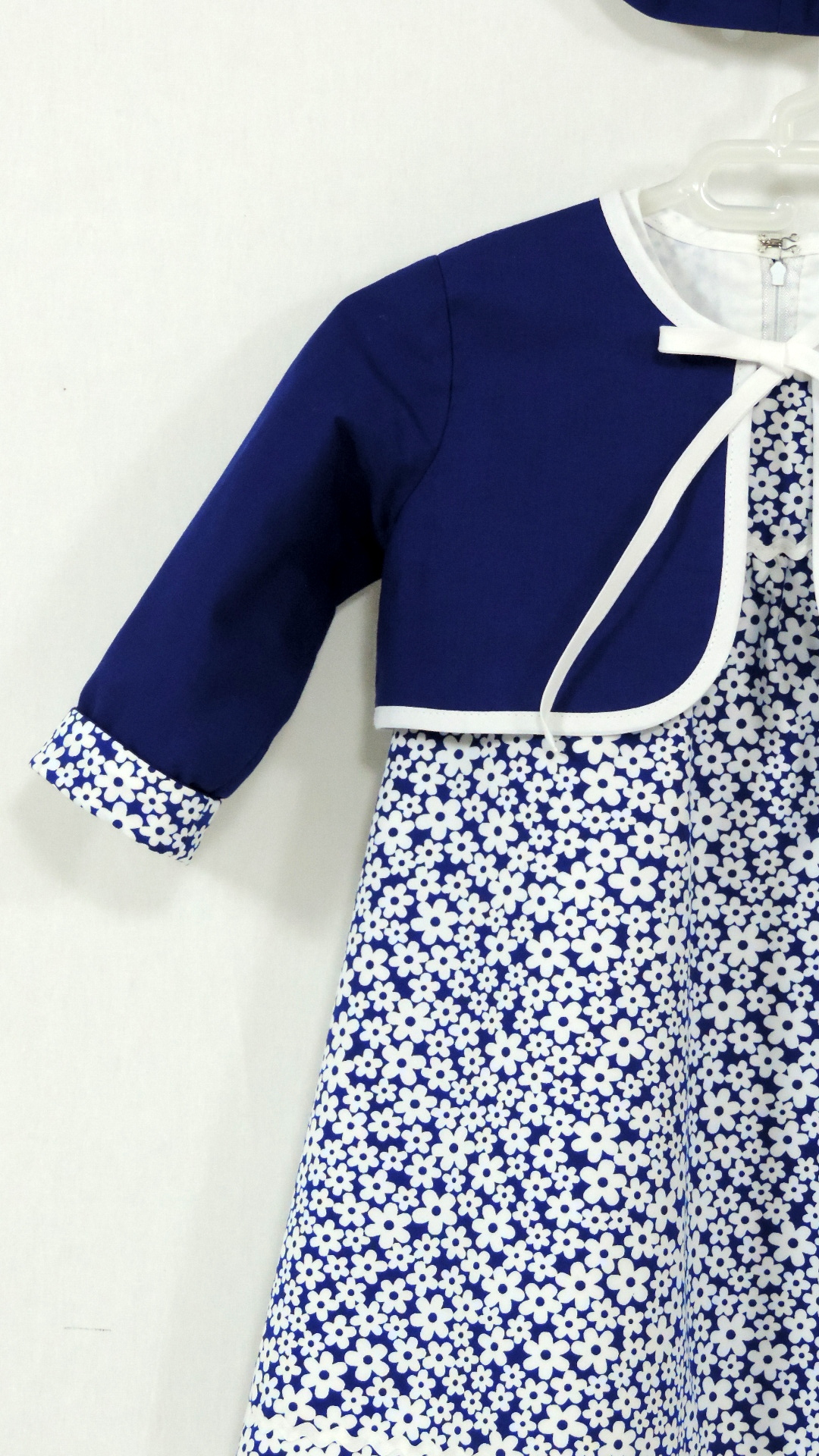 Festliches Ensemble bestehend aus Kleid, Bolero und Hütchen. Der blaue mit weissen Blüten bedruckte Stoff an Kleid und Hütchen wird durch einen uni blauen Stoff an Krempe und Bolero ergänzt. Kleid und Bolero sind voll gefüttert. Beide Stoffe, Einfassband und Zackenlitze sind aus Baumwolle.