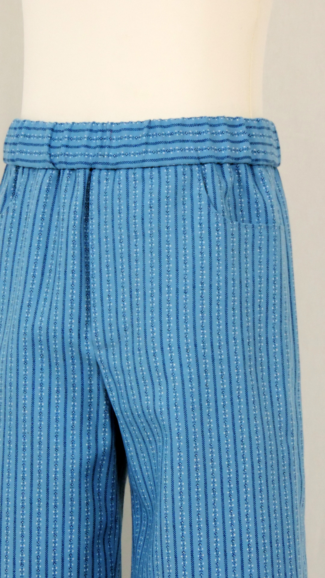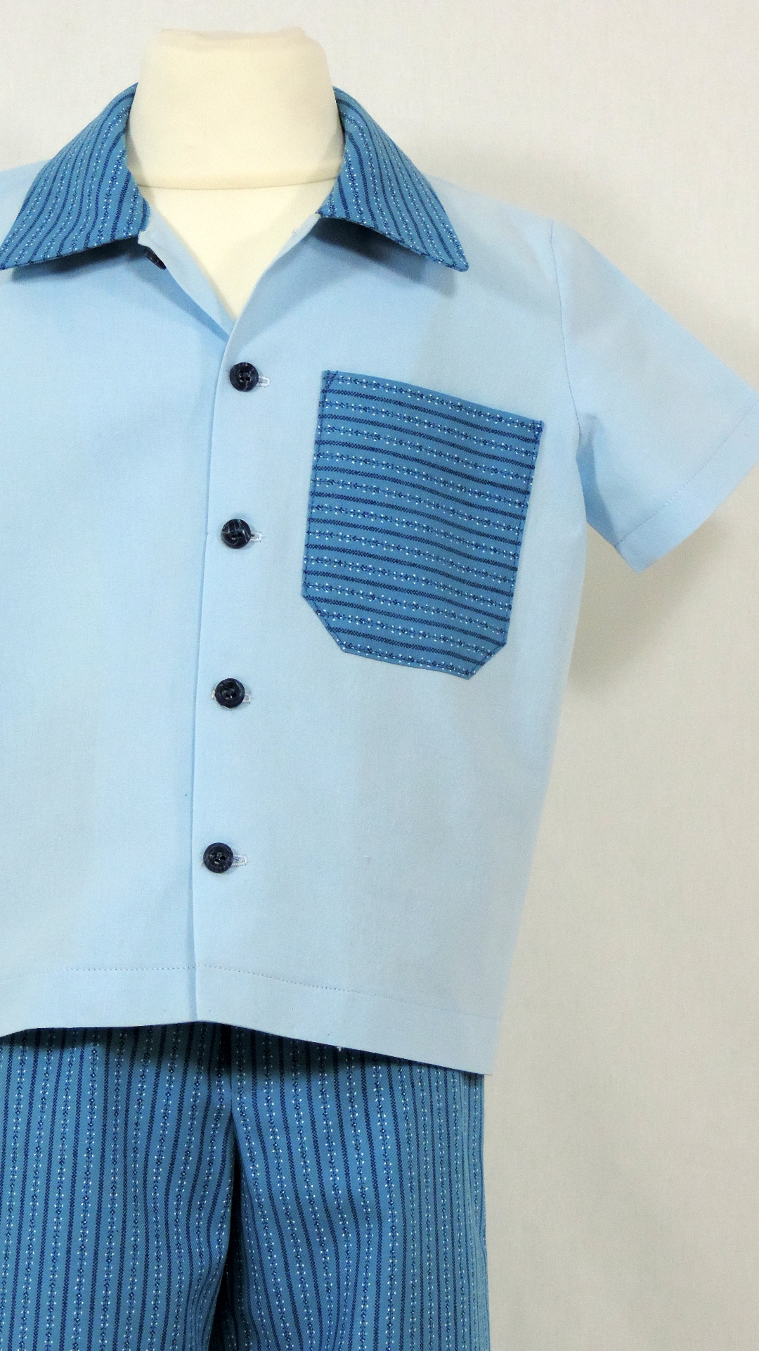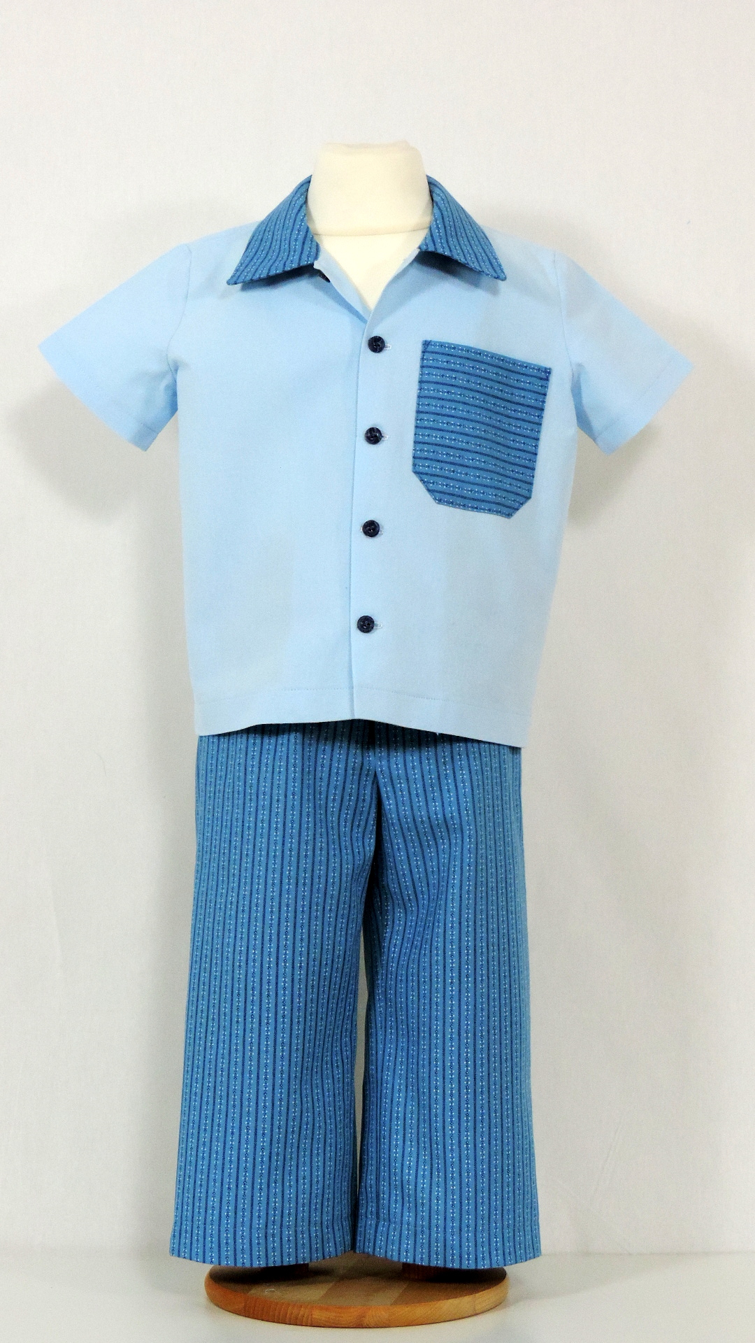 Ensemble bestehend aus Hose und Hemd. Der Stoff an Hose, Hemdkragen und -Tasche in taubenblau sind mit einem Volkloremuster bedruckt, das Hemd ist uni hellblau. Beide Stoffe sind aus Baumwolle.