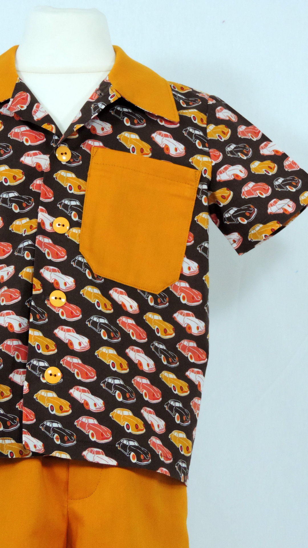 Ensemble bestehend Hose und Hemd. Die senfgelbe Hose hat vorne und hinten Taschen. Das braune, mit Autos bedruckte Hemd hat eine Brusttasche. Beide Stoffe sind aus Baumwolle.