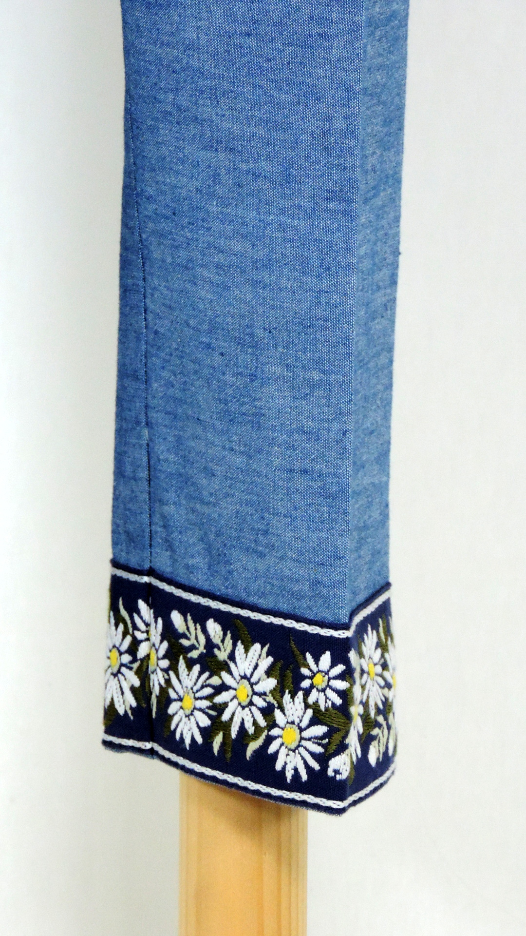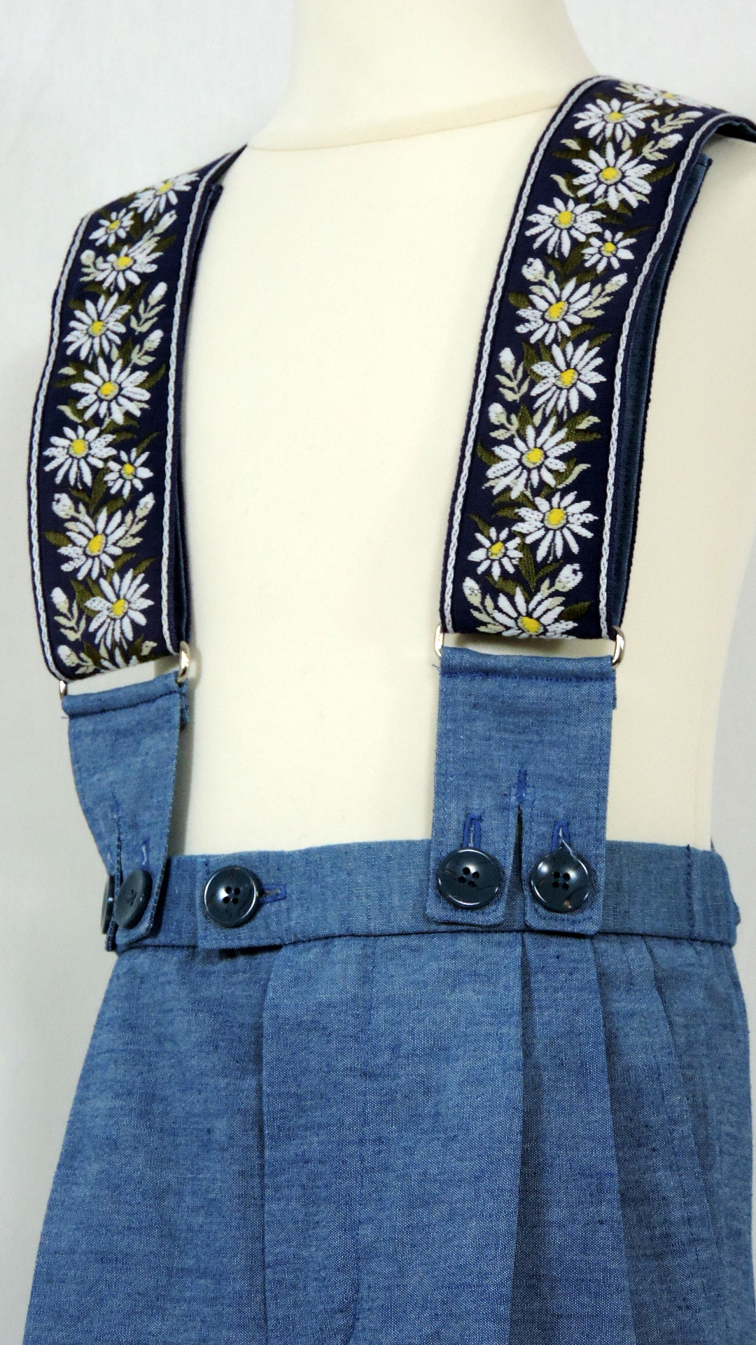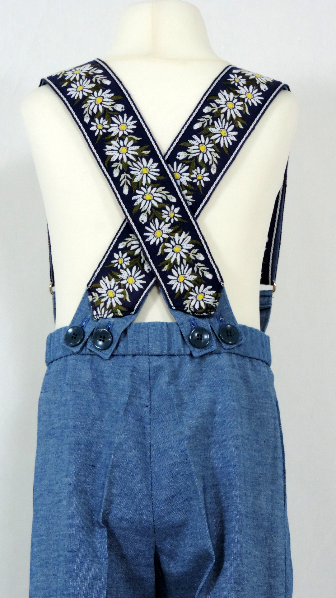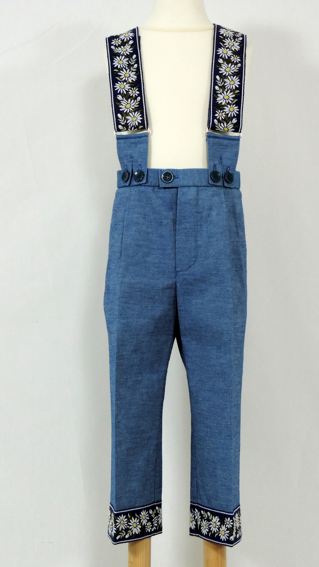 Hose mit passenden Hosenträgern. Der blaue Hosenstoff ist aus Baumwolle. Der Hosensaum und die Hosenträger sind mit einem Edelweissband belegt.