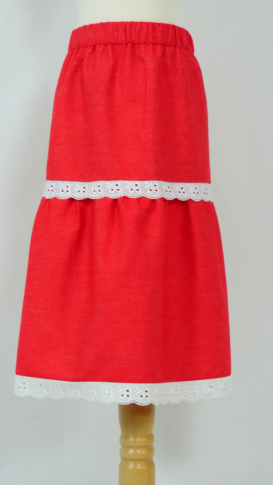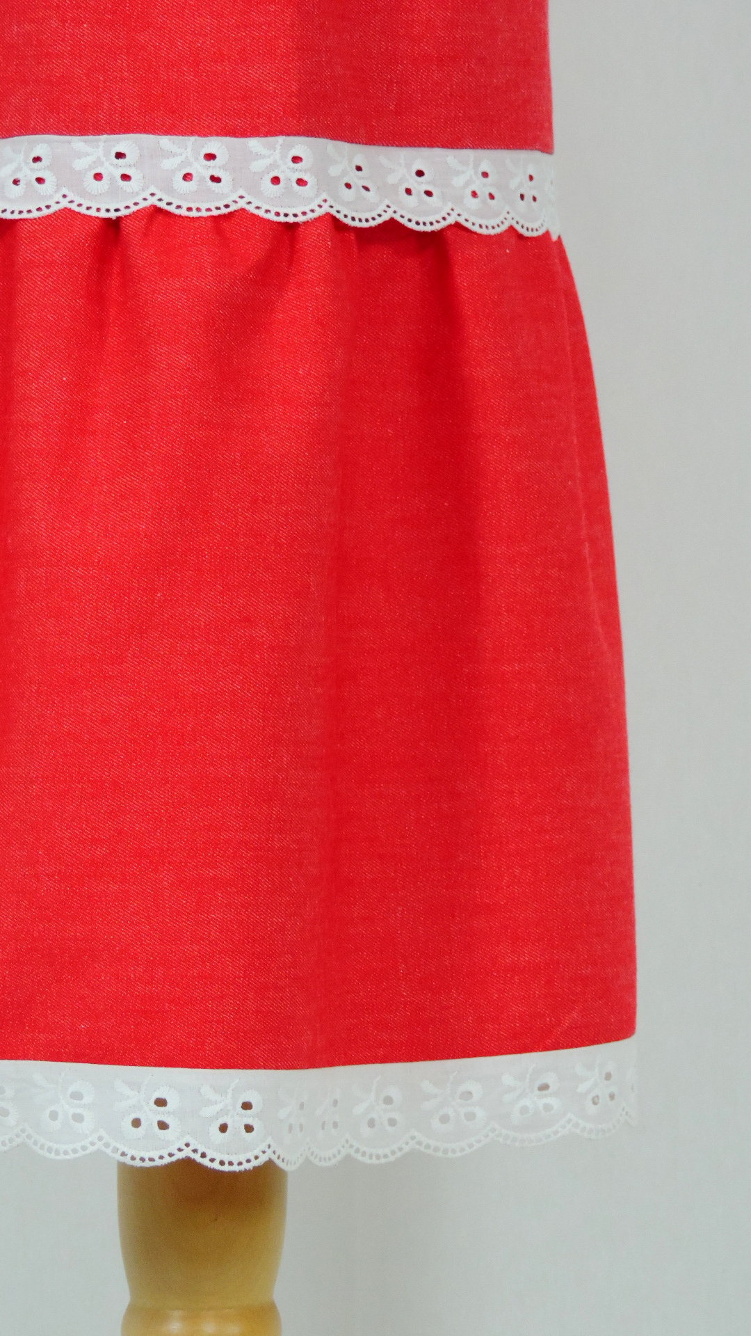 Rock aus Jeansstoff. Der rote Baumwollstoff ist mit weisser Spitze verziert.