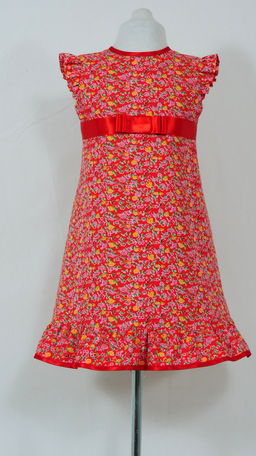 Kleid mit Flügelärmel und Volant. Das Kleid aus rotem, mit bunten Blüten bedrucktem Stoff voll gefüttert. Beide Stoffe sind aus Baumwolle, Satingurt und Einfassung sind synthetisch.