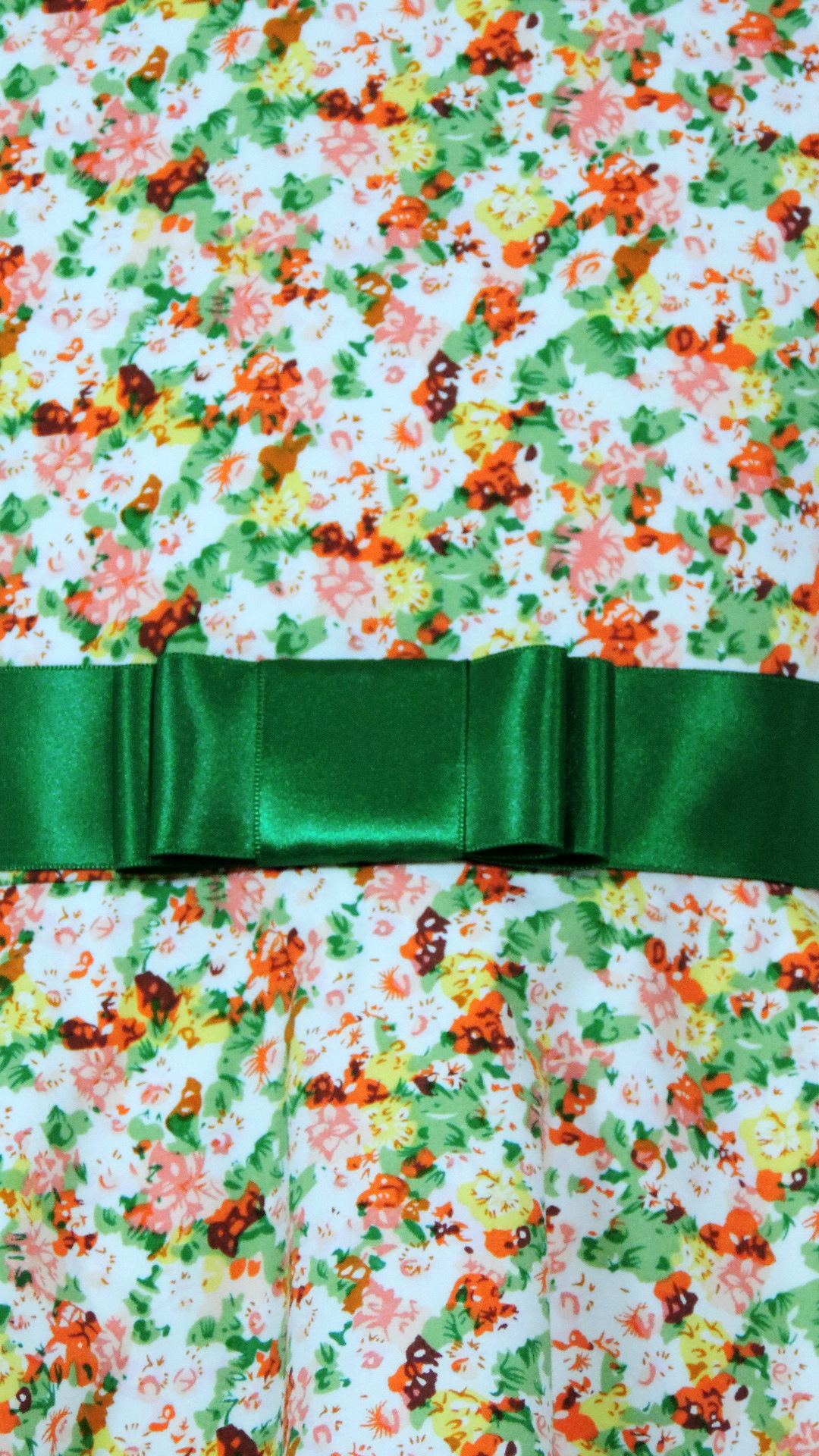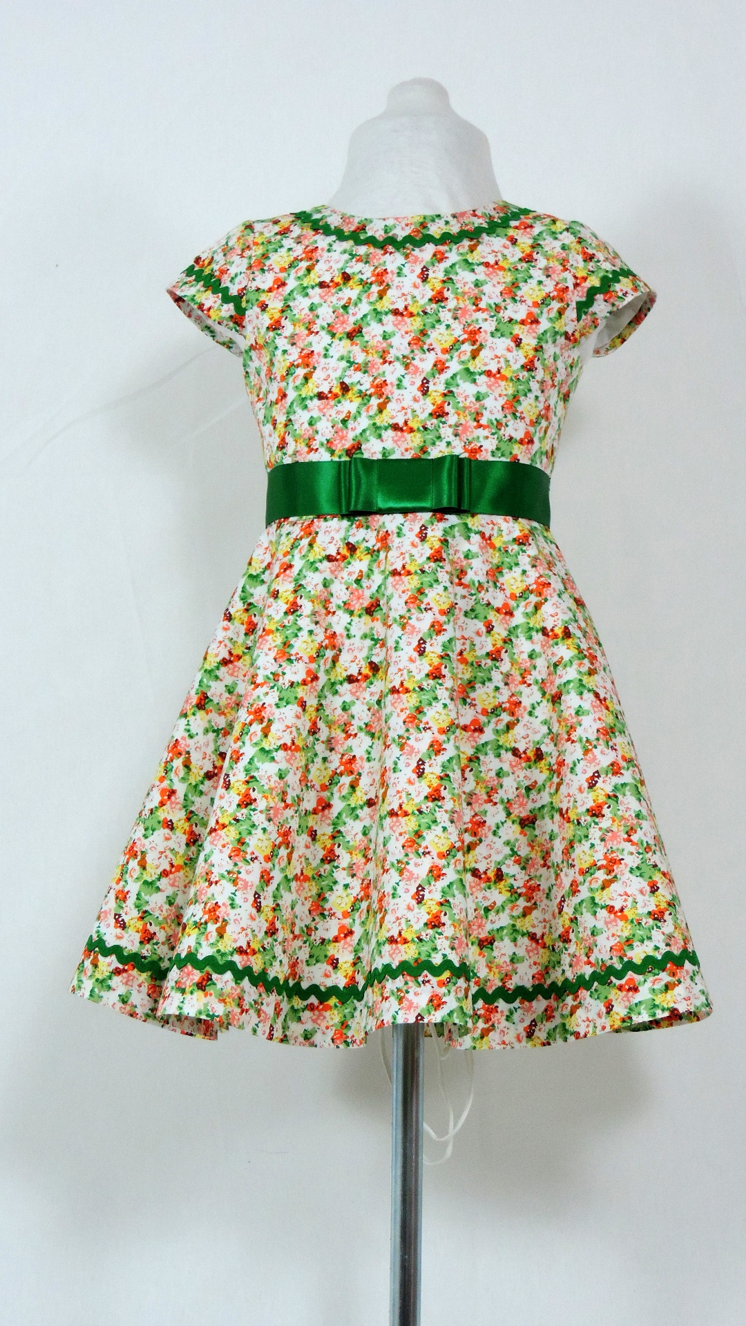Festtagskleid mit kurzen Ärmeln und Satingurt. Das Kleid aus weiss grundigem, bunt gemustertem Stoff ist voll gefüttert. Beide Stoffe sind aus Baumwolle, der Satingurt ist aus Polyester.