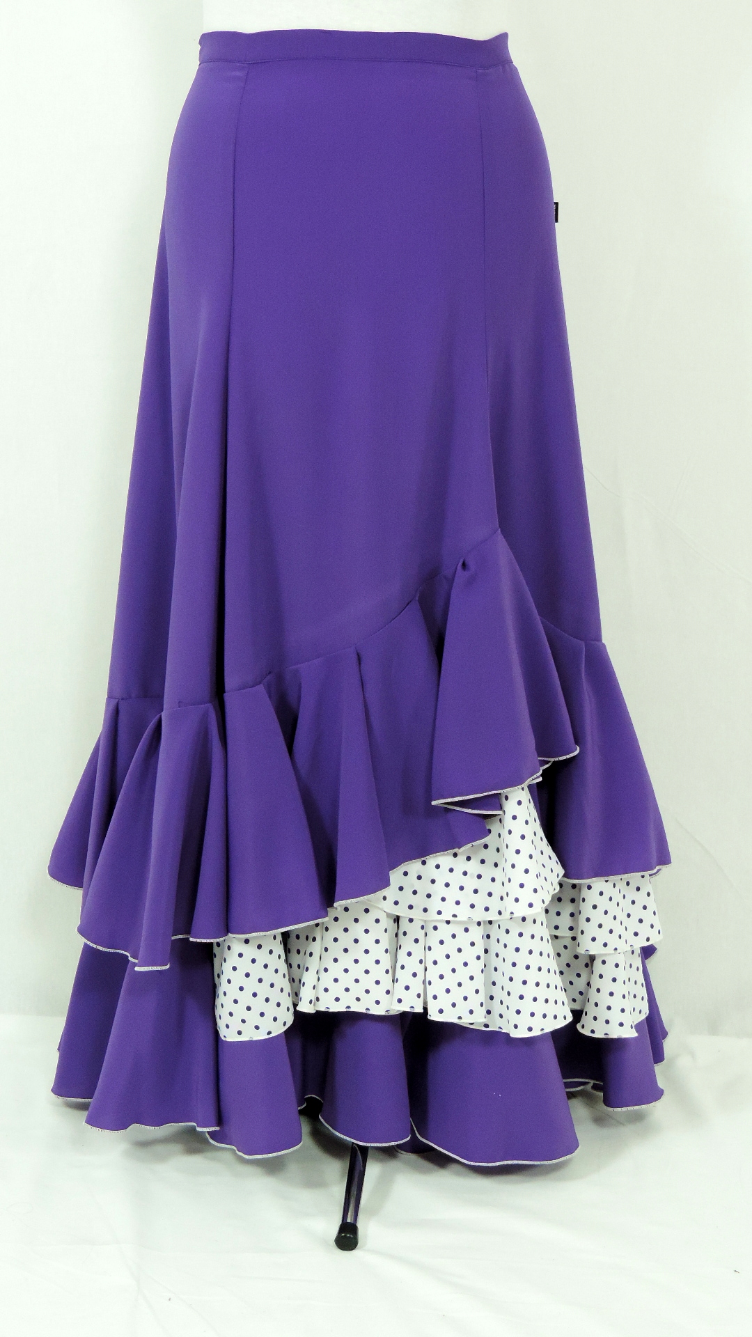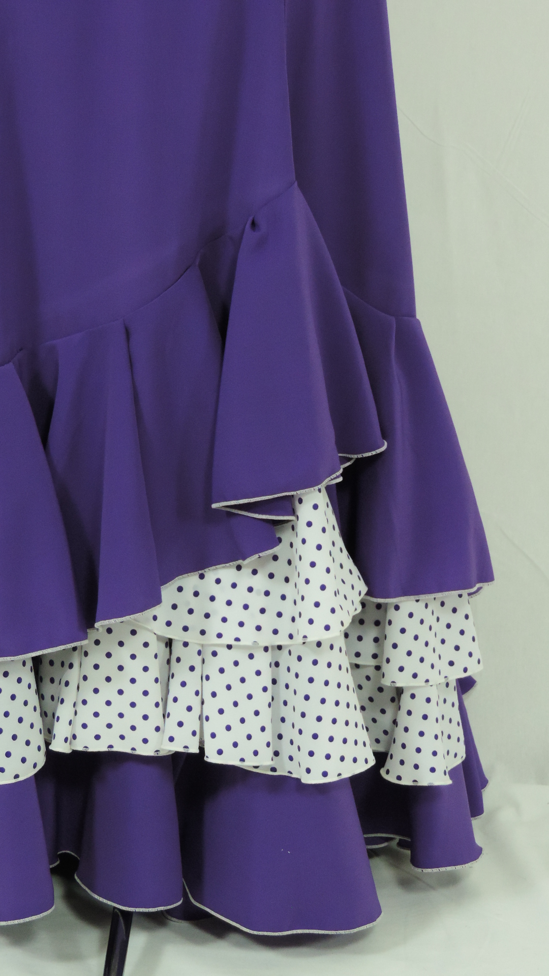 Flamencorock mit zwei durchgängigen Volantbahnen und einem doppelten, einseitigen Volanteinsatz. Der Rock ist aus uni violettem, der Volant Einsatz mit weiss/violett gepunktetem Stoff. Die Rocklänge beträgt 100 cm, die untere Weite ca. 4.4 Meter. Der Rock ist ein Fremdprodukt und wurde nie getragen. Gemäss Hersteller sind die Stoffe aus Polyester und Baumwolle und sind nicht waschbar.