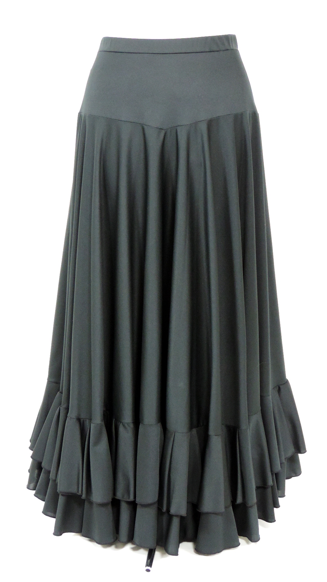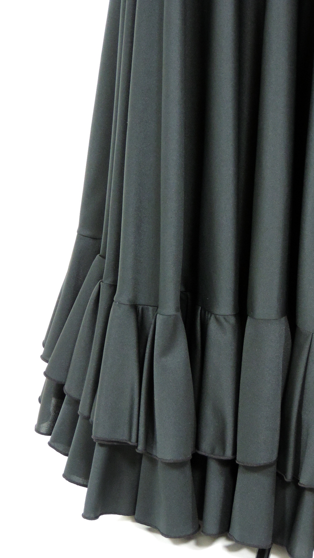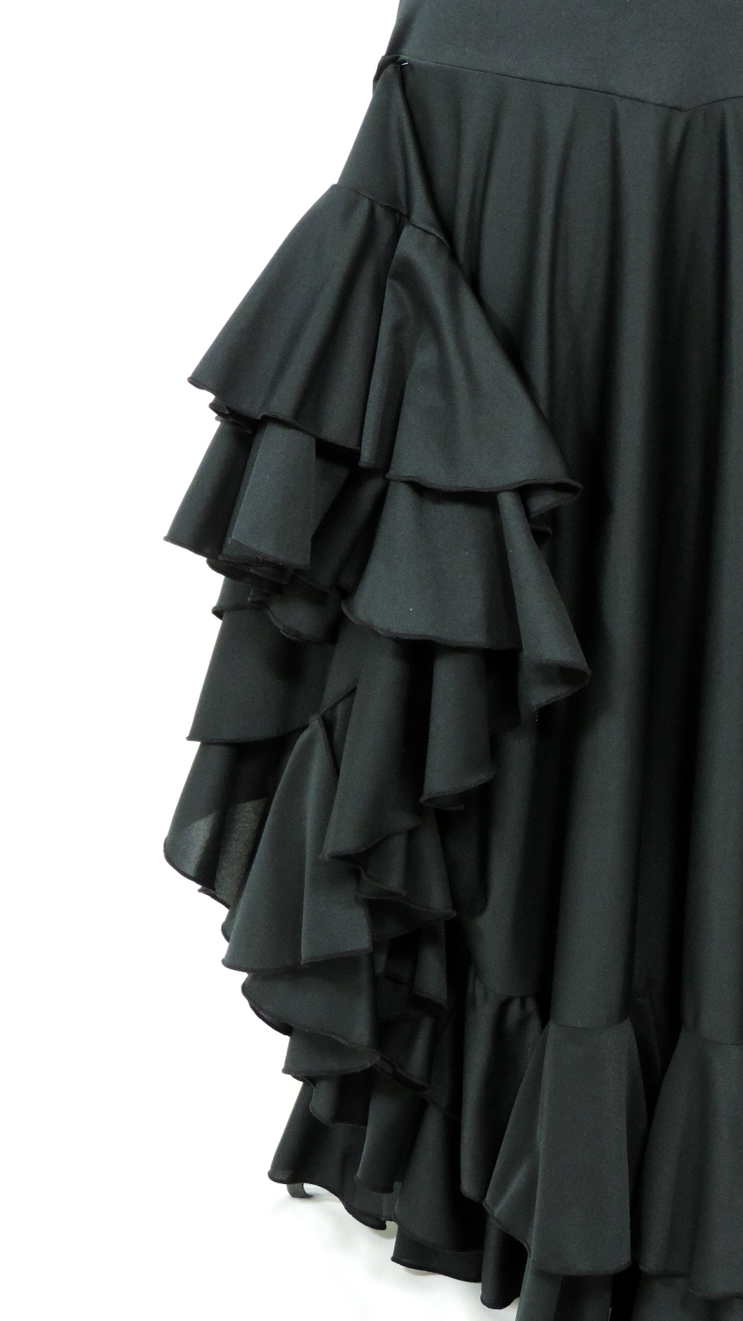Flamencotellerock mit Passe und zwei Volantbahnen. Der Rock aus schwarzem Jerseystoff hat ein Länge von 105 cm und eine untere Weite von ca. 5.2 Meter. Der Rock ist ein Fremdprodukt und wurde nie getragen.