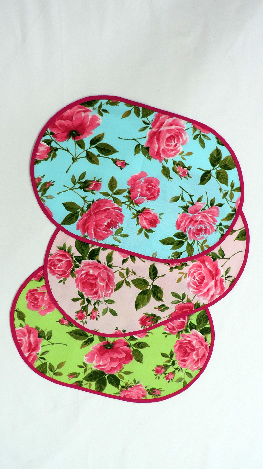 Ovale Tischsets im 3er Pack. Je ein Set aus lindgrün, rosa und aquamarine grundigem Stoff mit pink farbenen Rosen und pink farbener Einfassung. Das Set ist 48 cm breit und 32 cm hoch. Stoff und Einfassband sind aus Baumwolle.