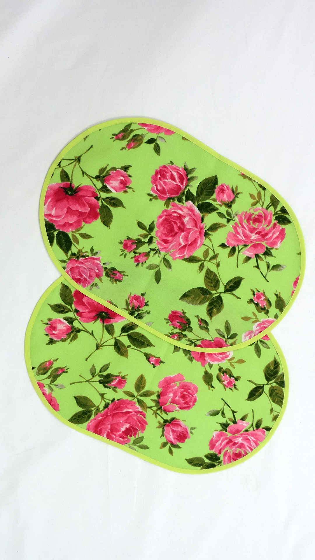 Ovale Tischsets im 2er Pack aus lindgrün grundigem Stoff mit pink farbenen Rosen und lindgrüner Einfassung. Das Set ist 48 cm breit und 32 cm hoch. Stoff und Einfassband sind aus Baumwolle.