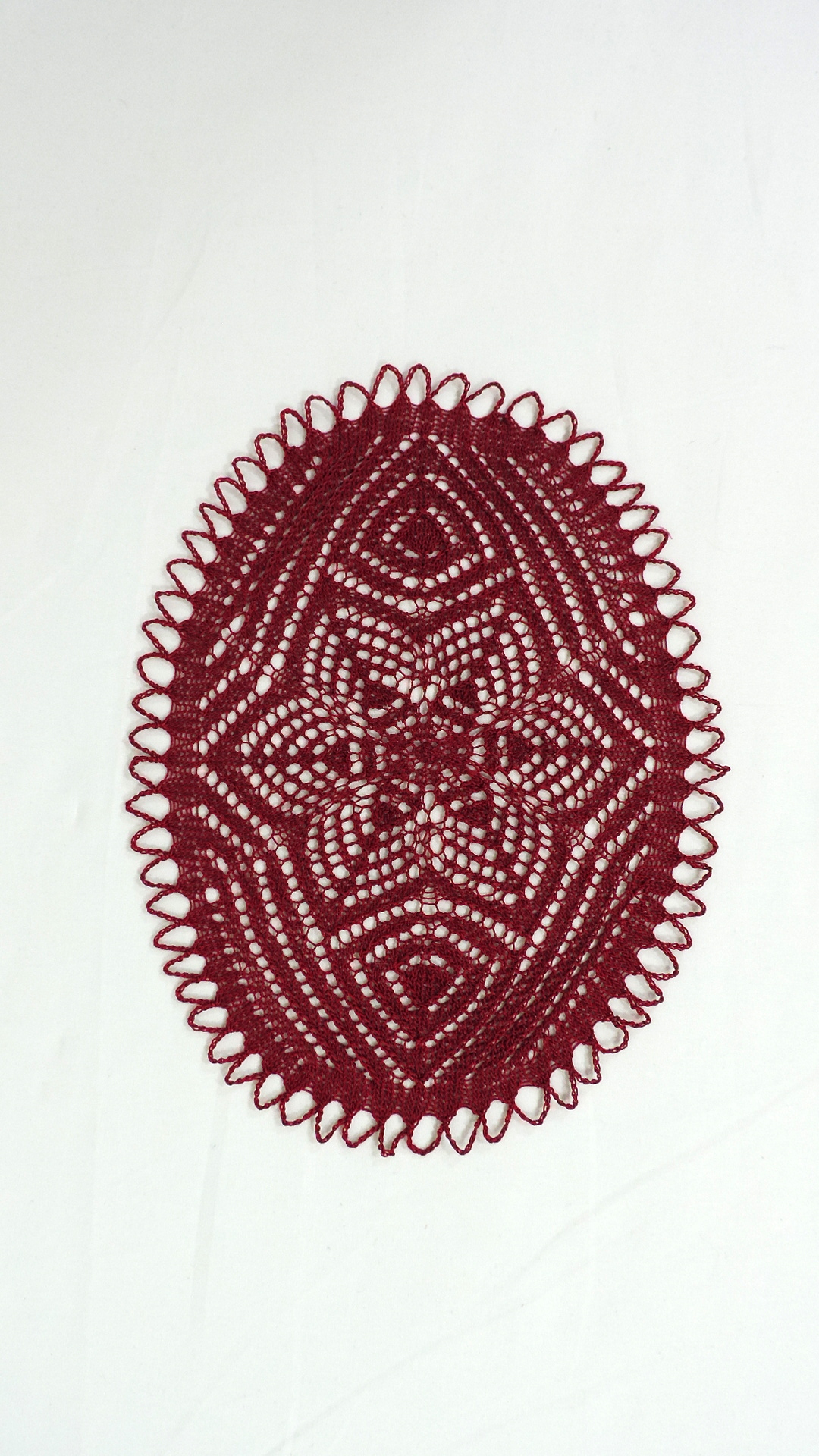 Gestricktes Spitzendeckchen aus dunkelrotem Garn. Das ovale Deckchen mit Sternenmotiv miss 31x23 cm