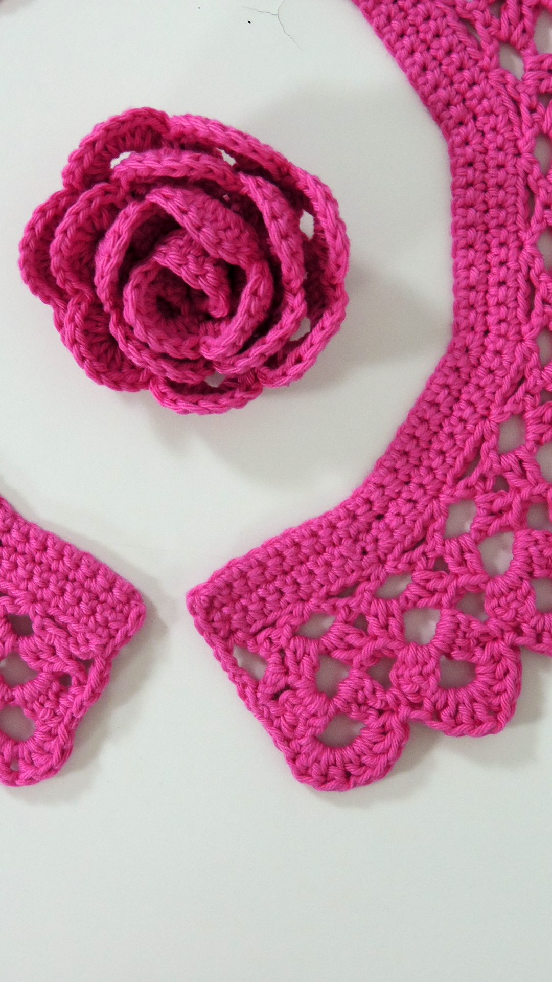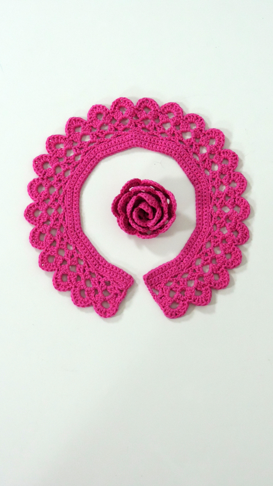 Gehäckeltes Ensemble aus pink farbenem Garn. Der Kragen hat eine Halsweite von 48 cm. Die Rose hat einen Durchmesser von 7 cm und kann mittels Broschennadel befestigt werden.