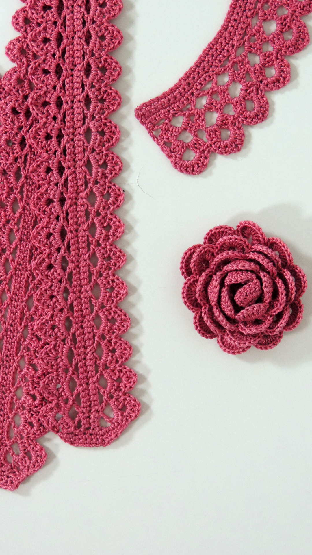 Gehäckeltes Ensemble aus rosa farbenem Garn. Der Gurt ist 53 cm lang. Der Kragen hat eine Halsweite von 39 cm. Die Rose hat einen Durchmesser von 6 cm und kann mittels Druckknopf befestigt werden.