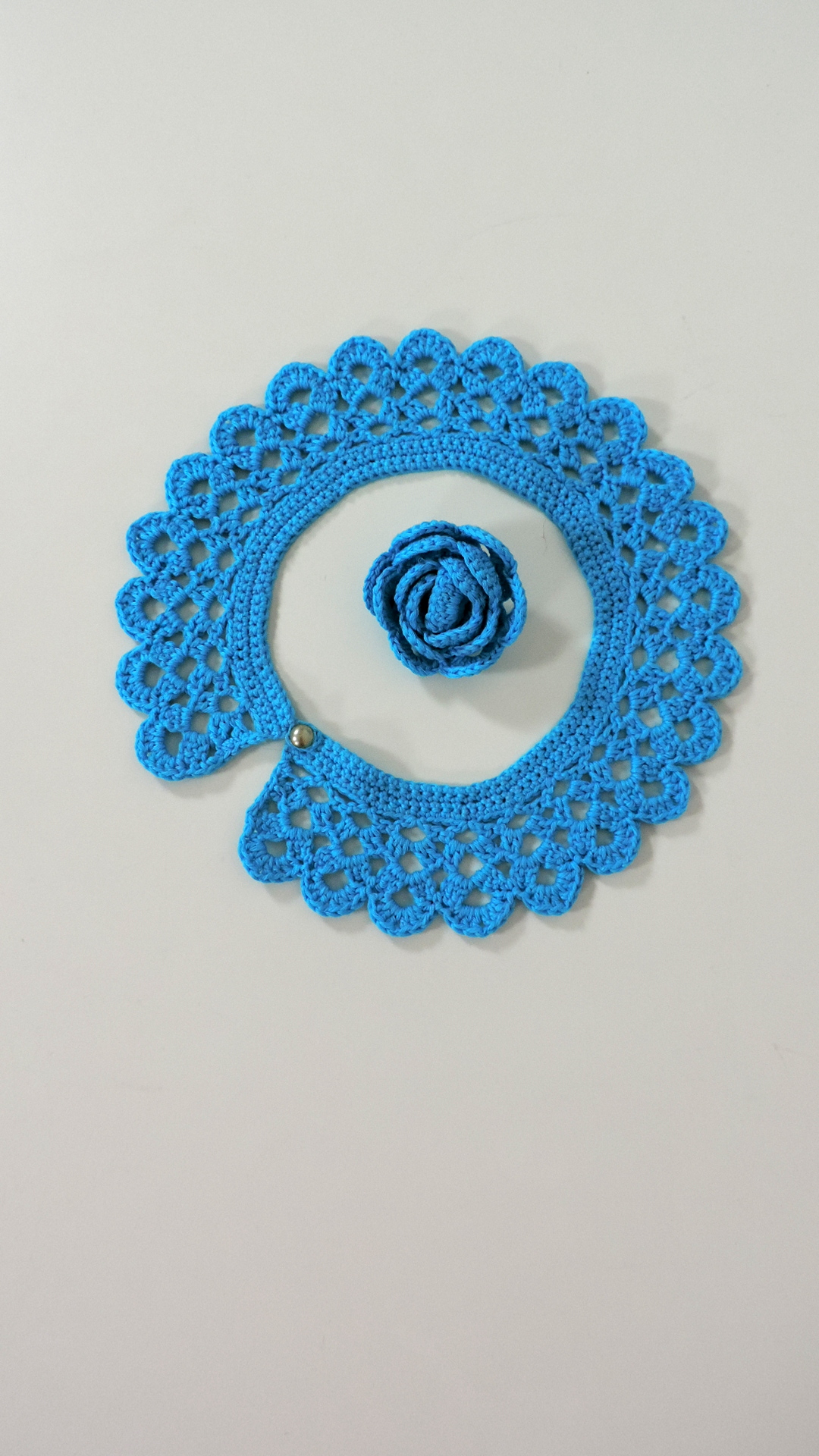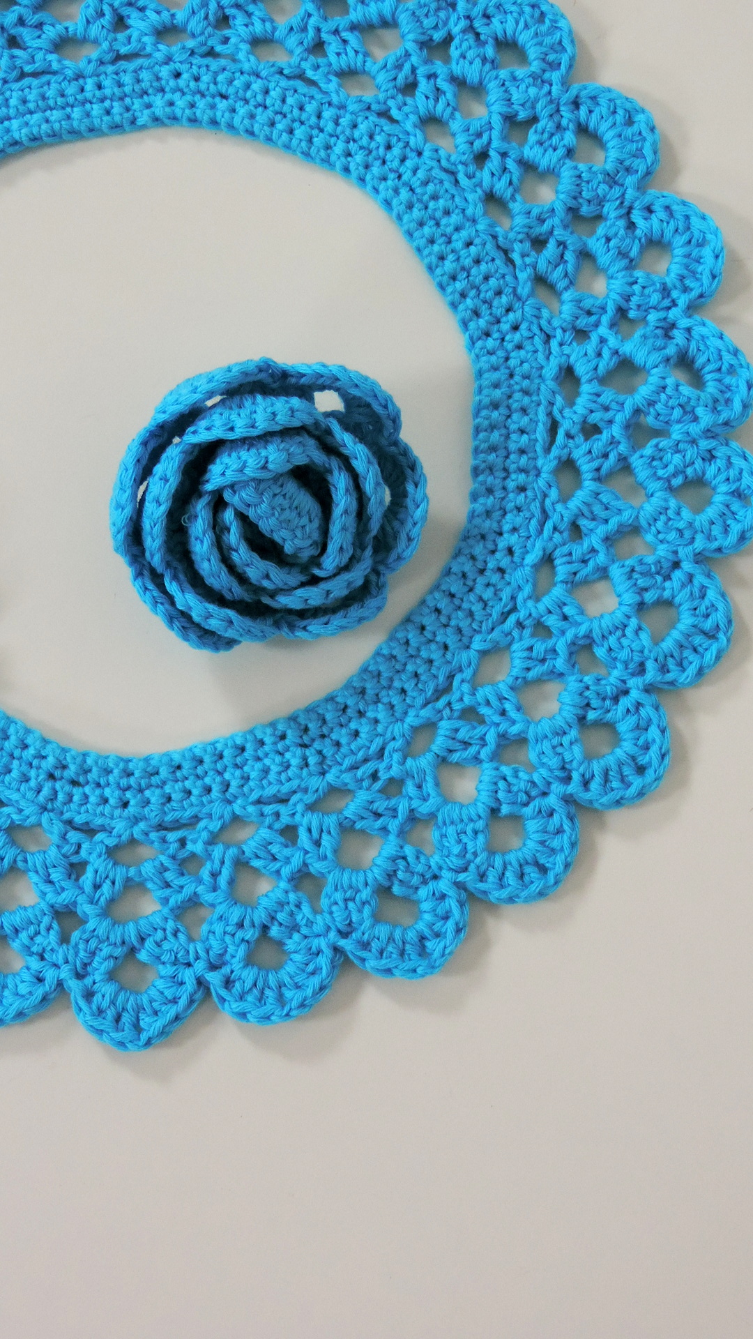 Gehäckeltes Ensemble aus türkis farbenem Garn. Der Kragen hat eine Halsweite von 42 cm. Die Rose hat einen Durchmesser von 6 cm und kann mittels Broschennadel befestigt werden.