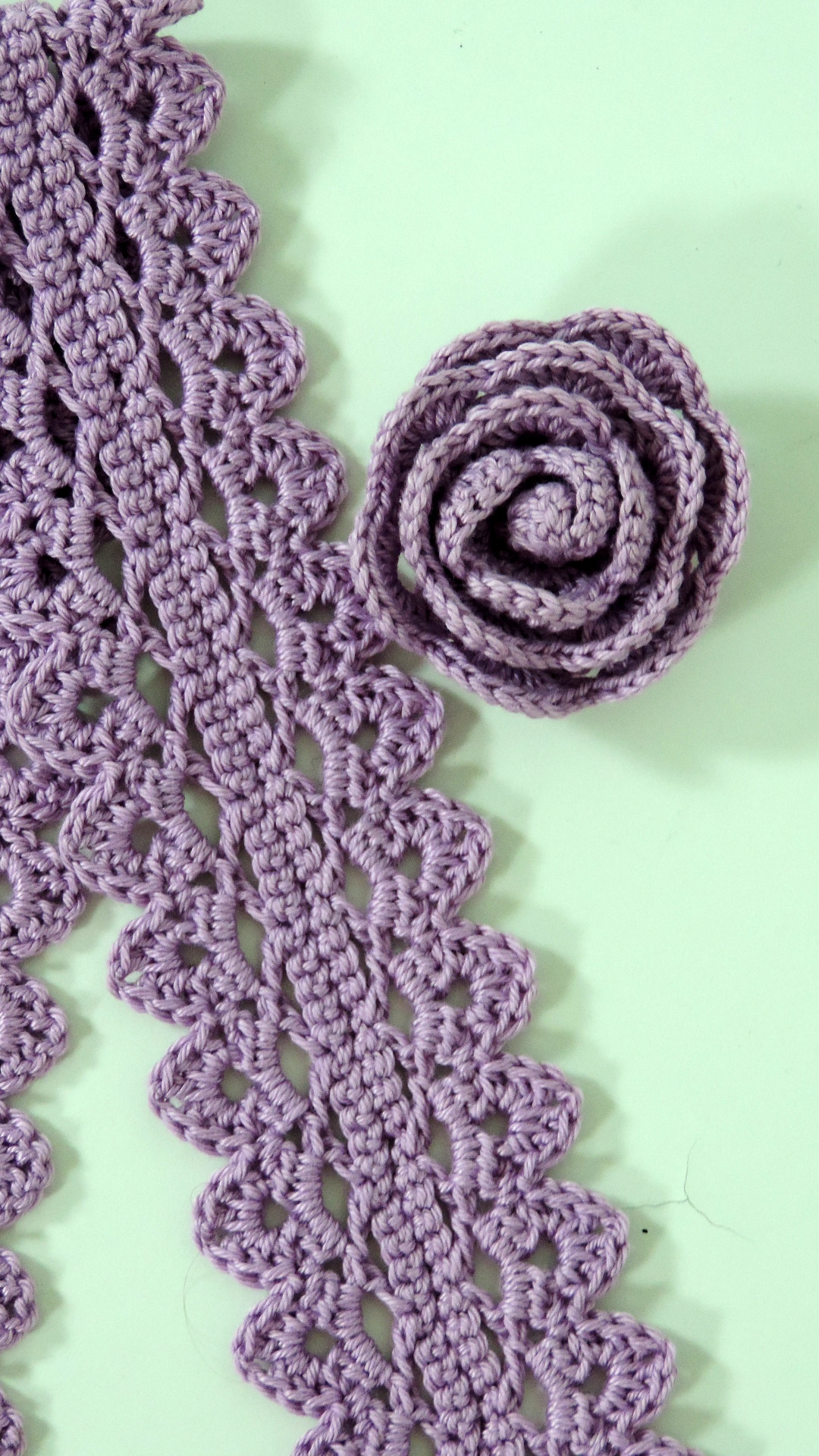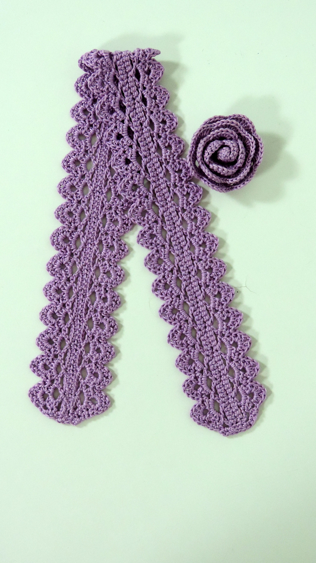 Gehäckeltes Ensemble aus lila farbenem Garn. Der Gurt ist 50 cm lang. Die Rose hat einen Durchmesser von 5.5 cm und kann mittels Druckknopf befestigt werden.