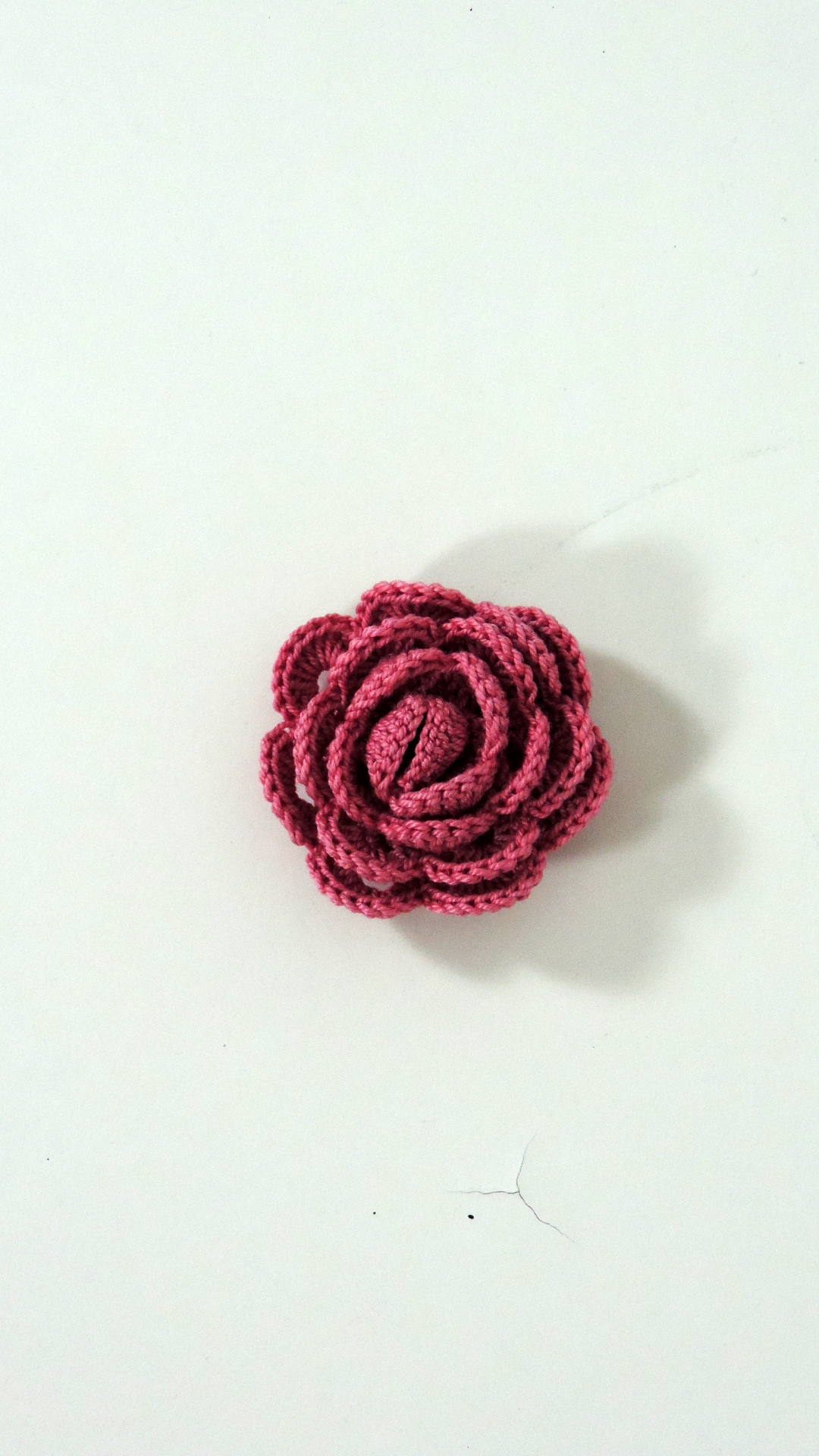 Gehäckelte Rose aus rosa farbenem Garn. Die Rose hat einen Durchmesser von 4.5 cm und kann mittels Druckknopf befestigt werden