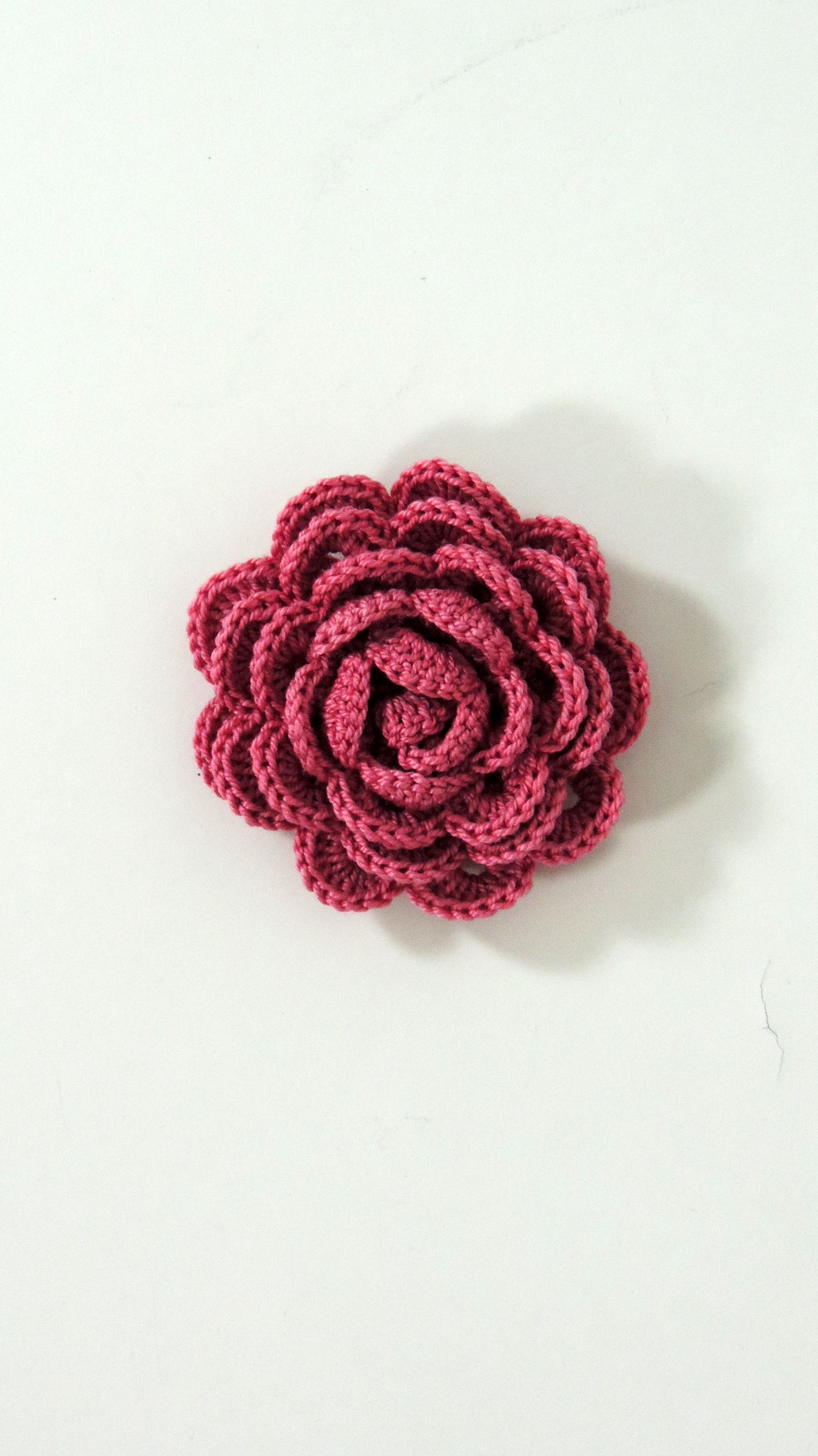 Gehäckelte Rose aus rosa farbenem Garn. Die Rose hat einen Durchmesser von 6 cm und kann mittels Druckknopf befestigt werden.