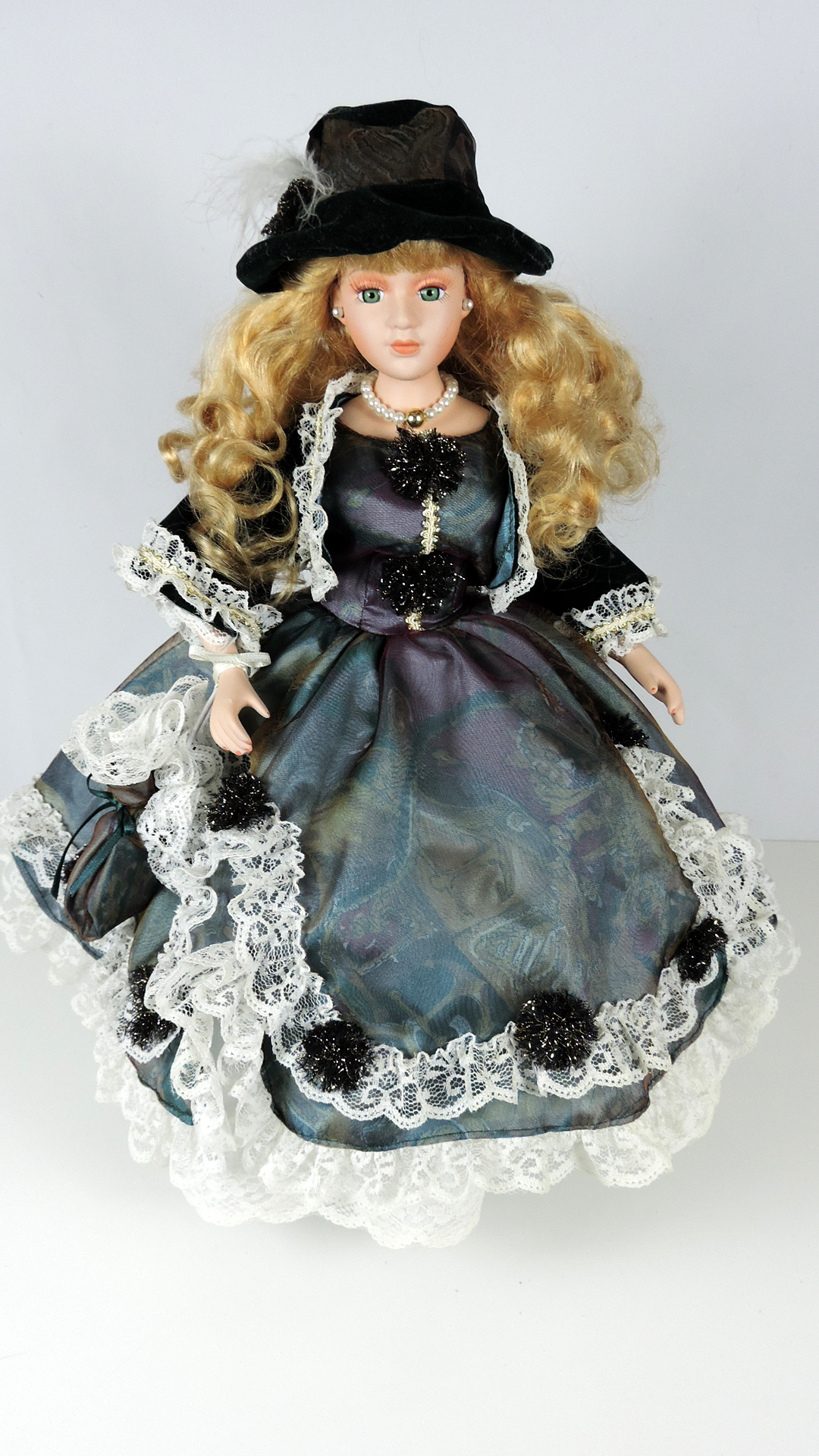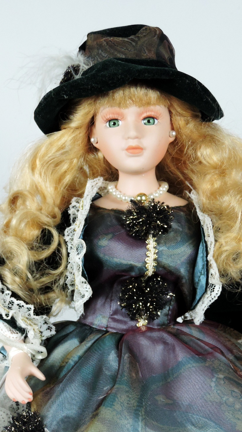Handgefertigte Porzellanpuppe aus der Kollektion Victorian Dolls. Die Puppe "Rebecca" ist mit dem dazu gehörenden Ständer ca. 45 cm hoch. Puppe und Stoffe sind in einem sehr guten Zustand, die Puppe wurde nur ausgestellt, nicht bespielt. Schachtel und Zertifikat sind leider nicht mehr vorhanden.