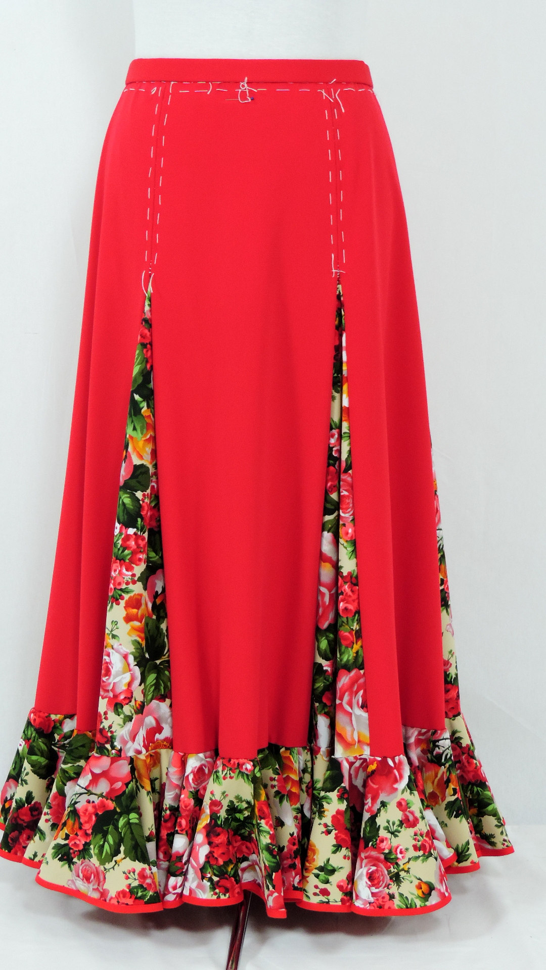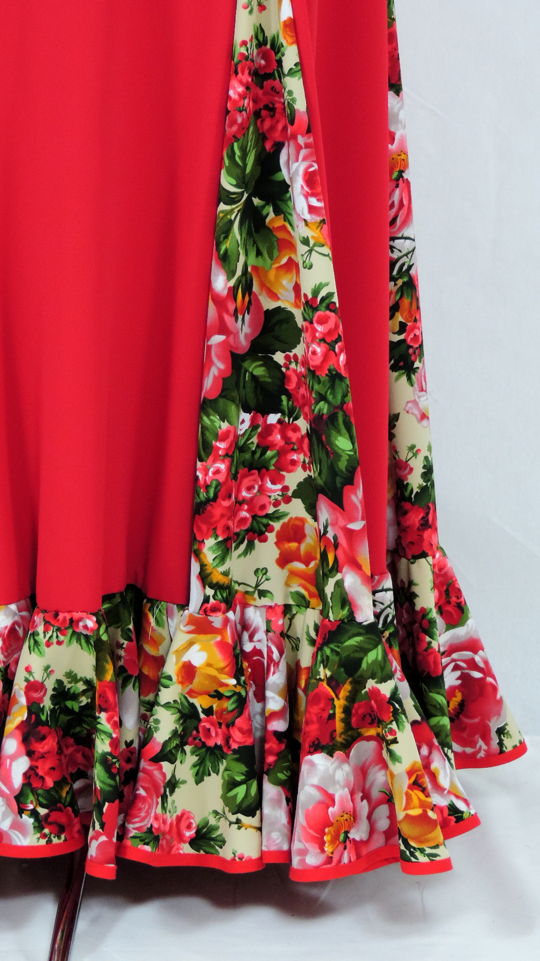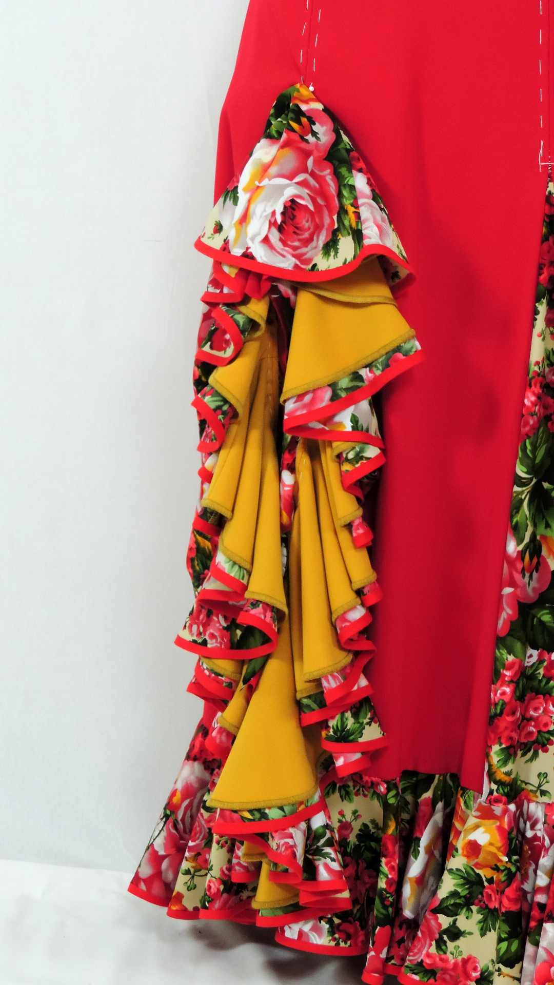 Flamencorock mit sechs Godets und einer doppelten Volantbahn. Der rote Hauptstoff ist an Godets und Volant mit einem bunt geblumten Stoff ergänzt. Das Volant ist mit einem uni senfgelben Untervolant gedoppelt