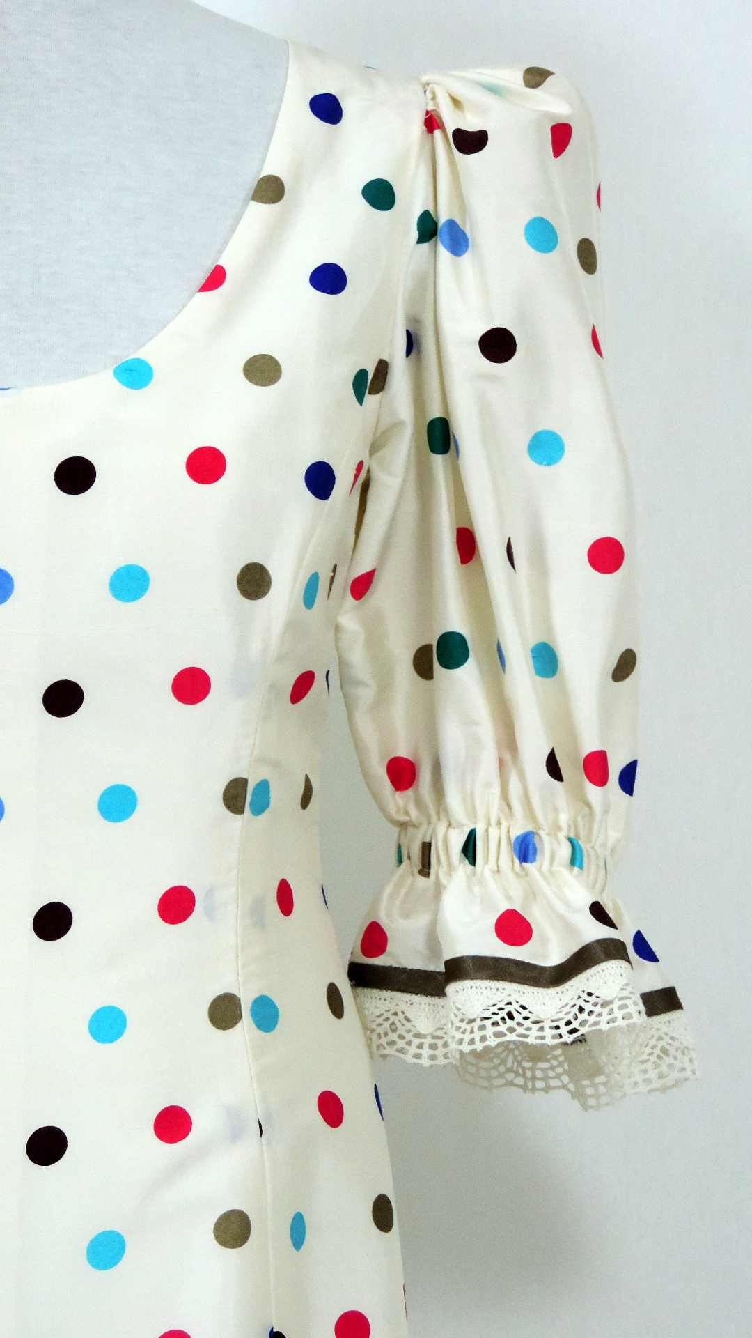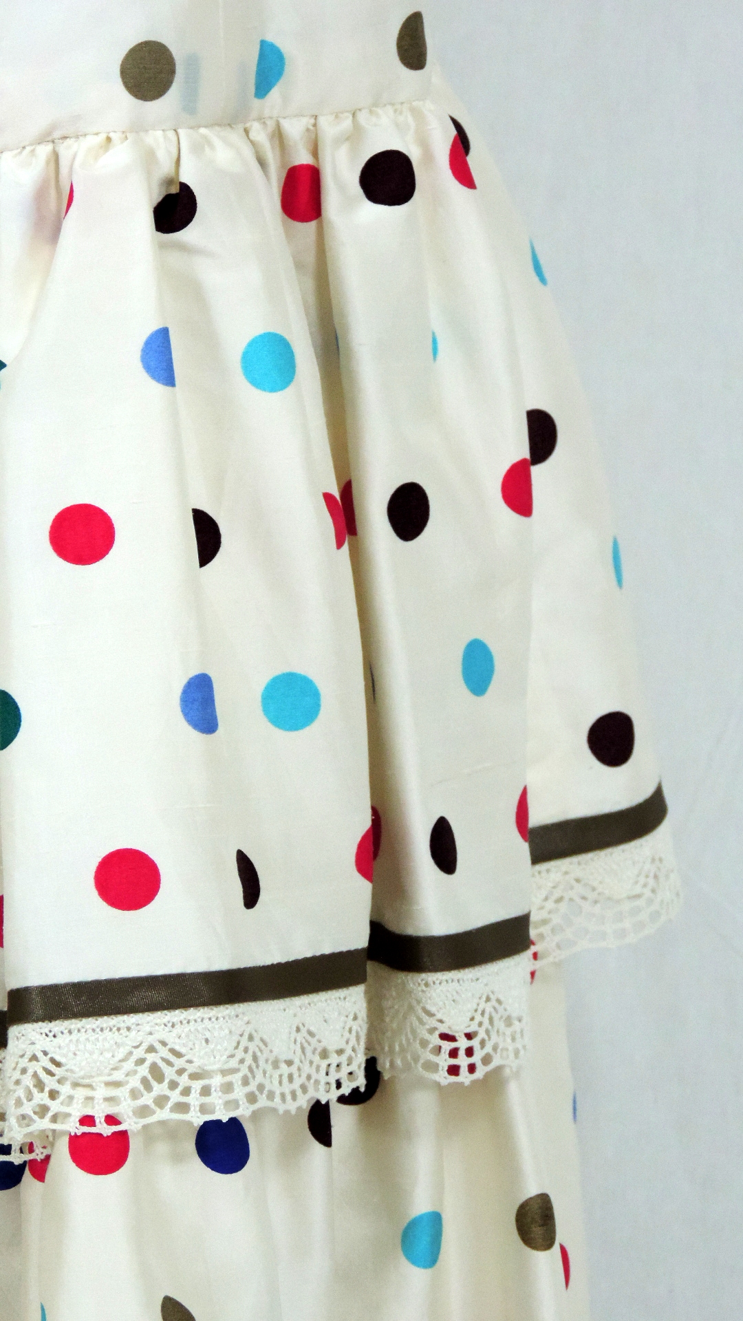 Flamencokleid im südspanischen Stil. Das Kleid aus crème grundigem mit verschieden farbigen Punkten bedrucktem Seidenstoff hat drei Rüschenvolants. Die Rüschen an Ärmel und Rock schliessen mit einer 3 cm breiten Klöppelspitze ab. Das voll gefütterte Kleid ist fertiggestellt.
